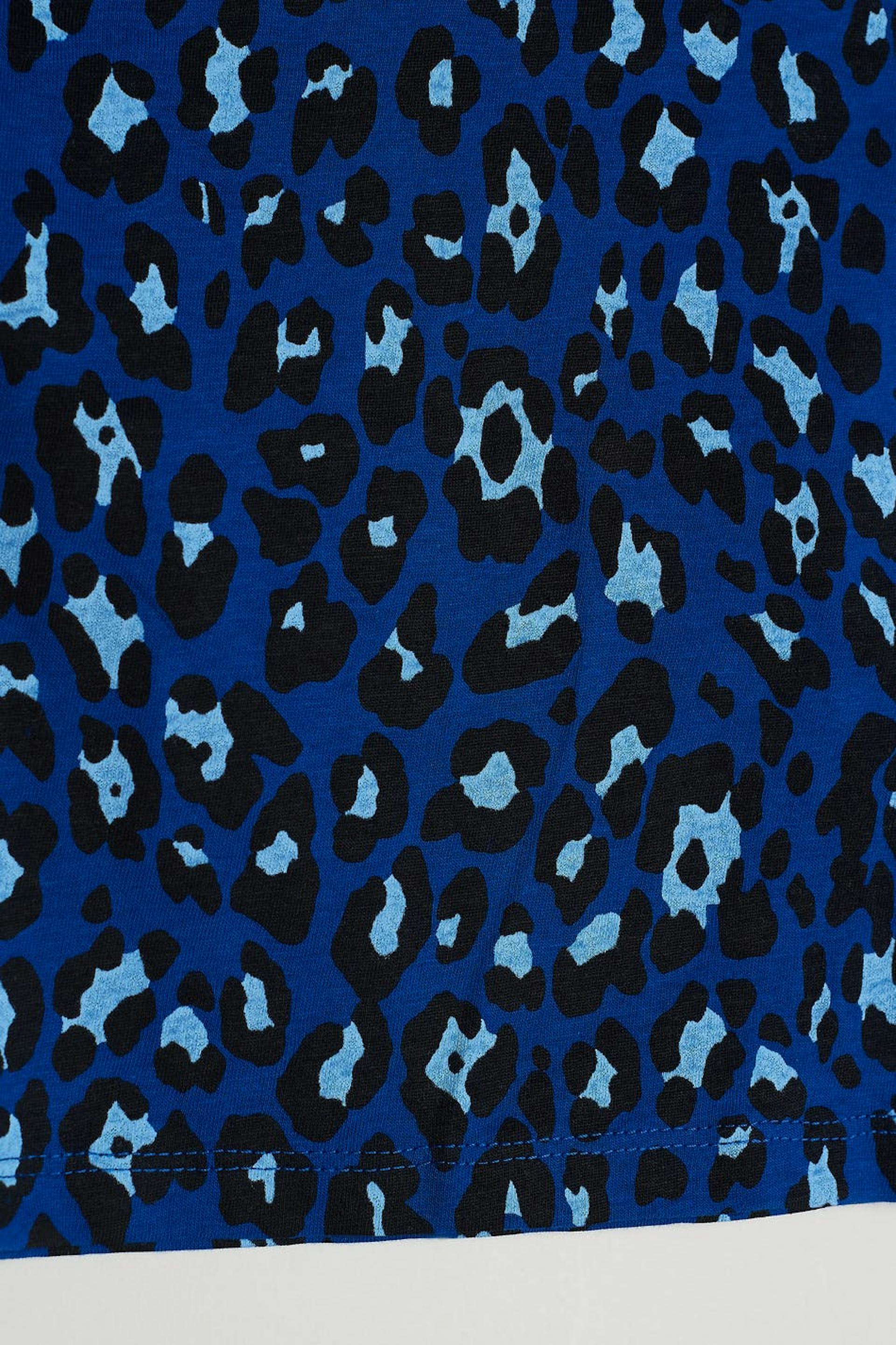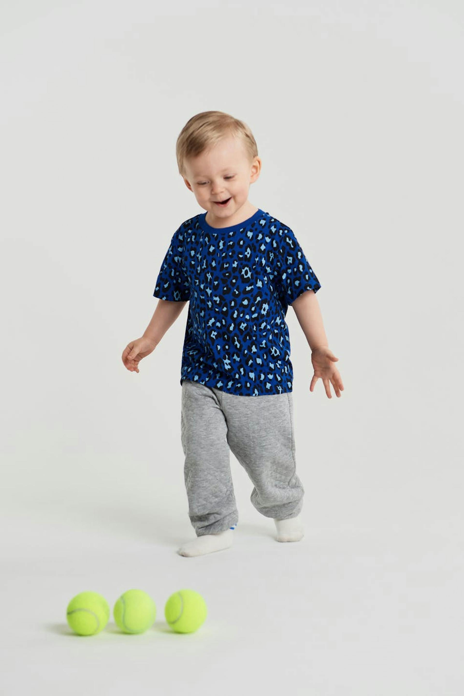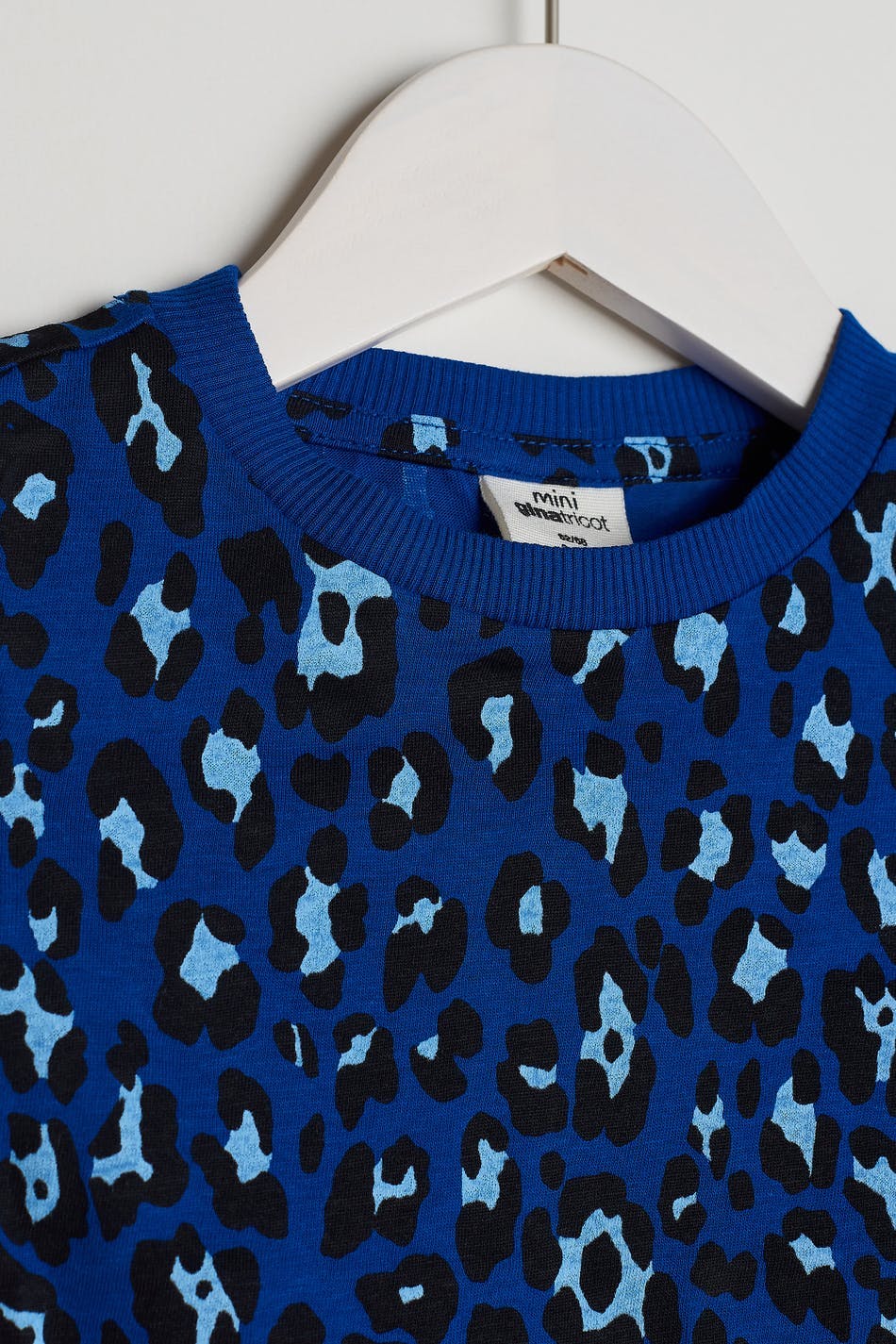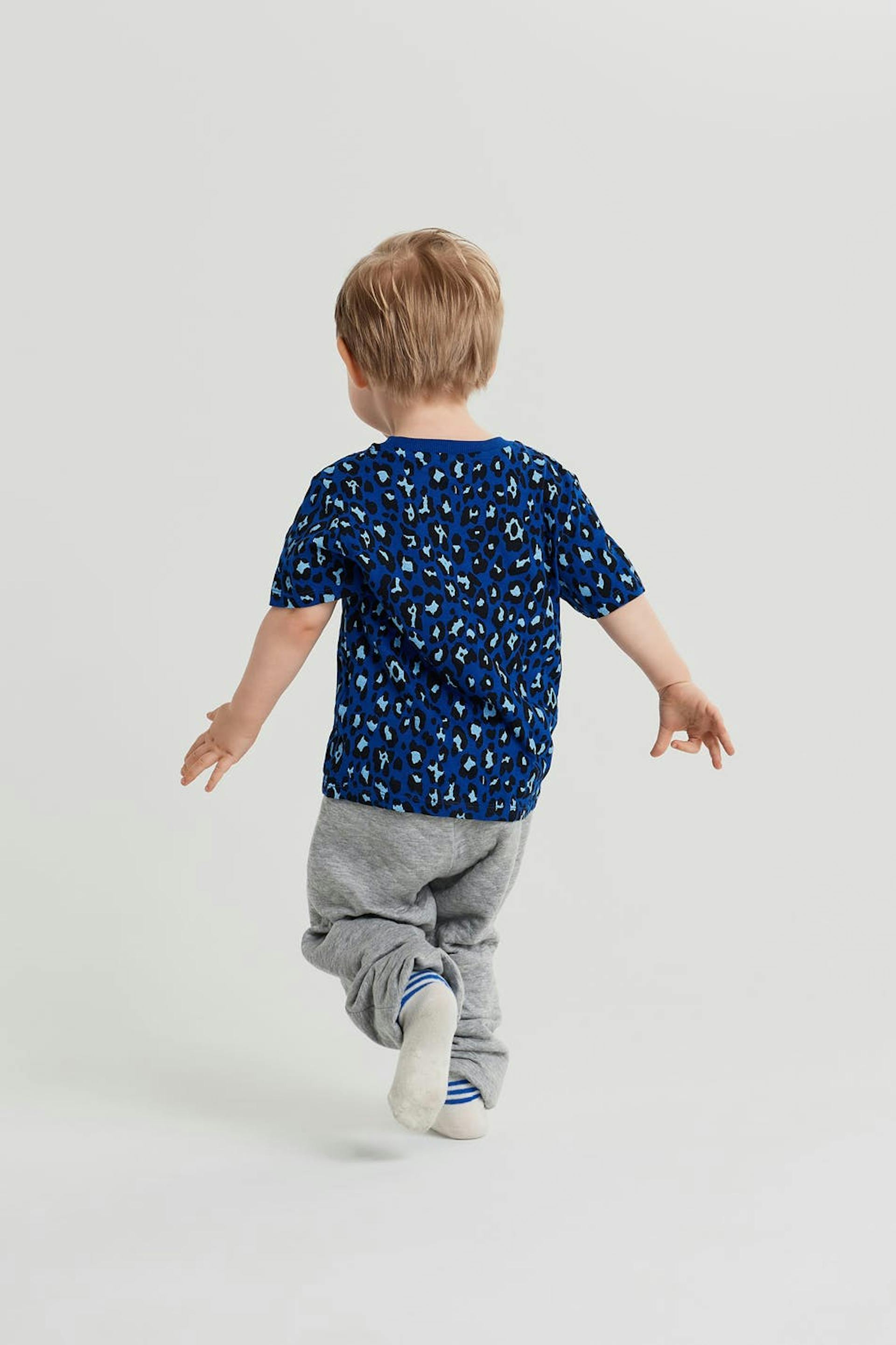 T-Shirt für Babys mit einem Leopard-Muster. Das T-Shirt ist blau und kurzärmlig.