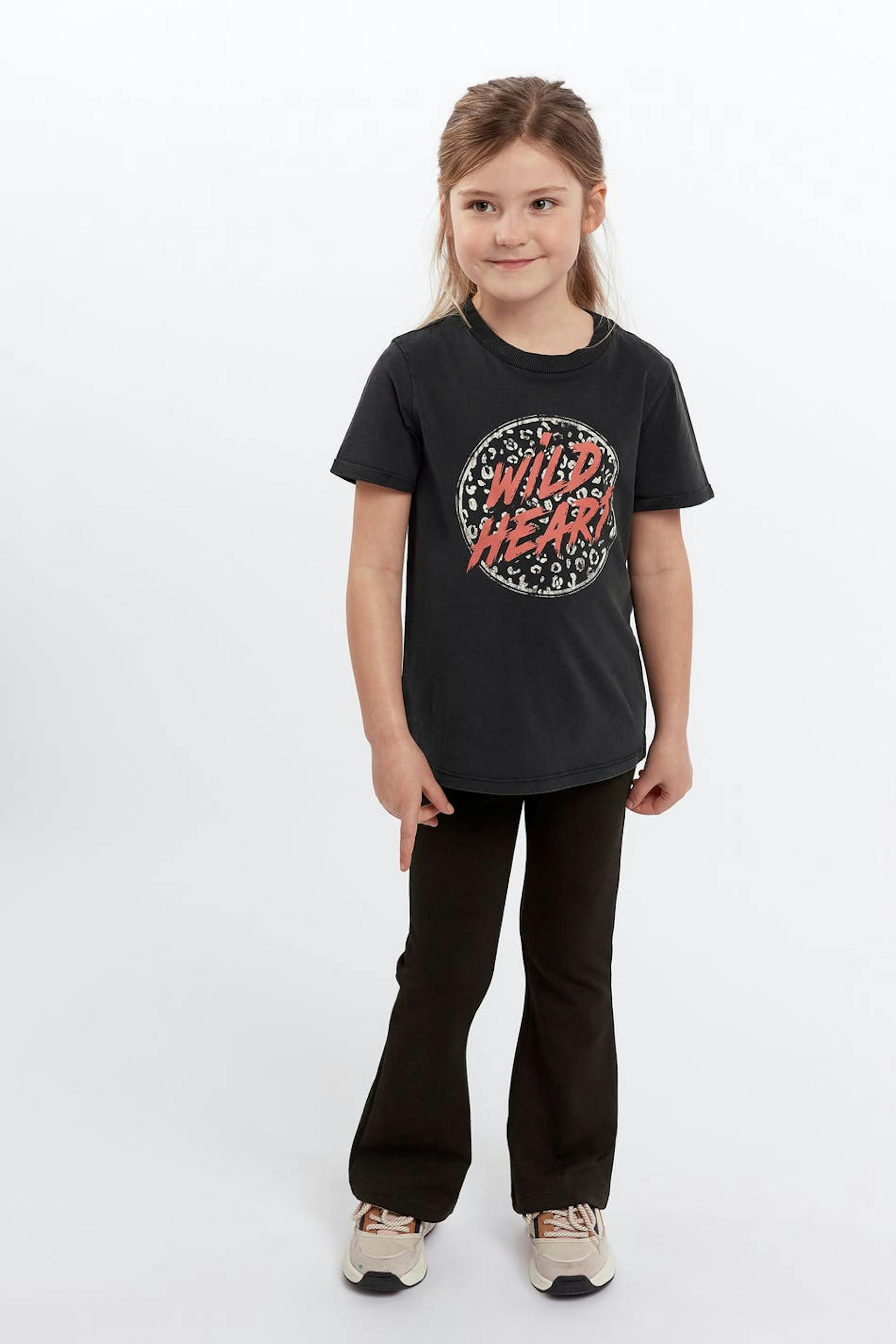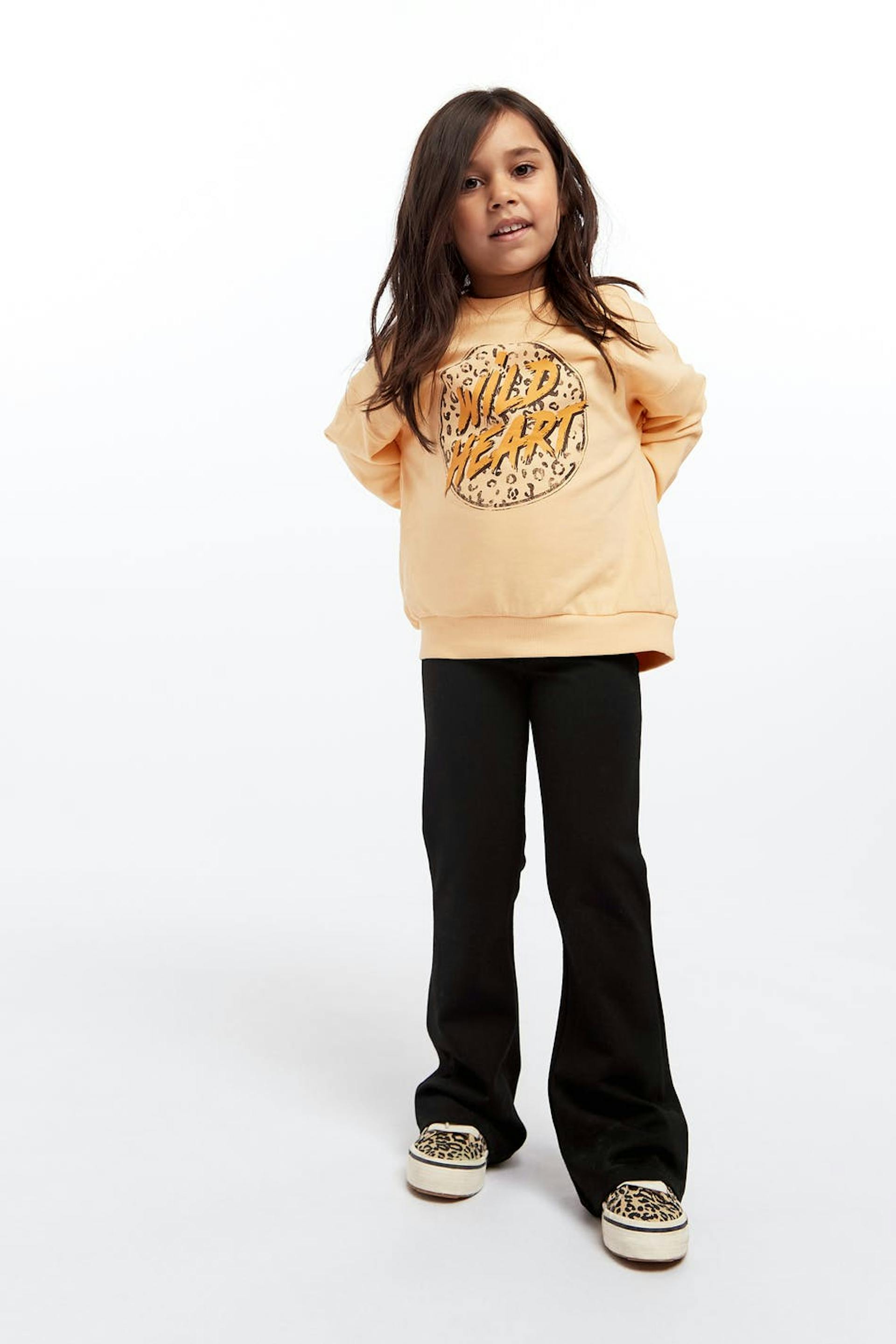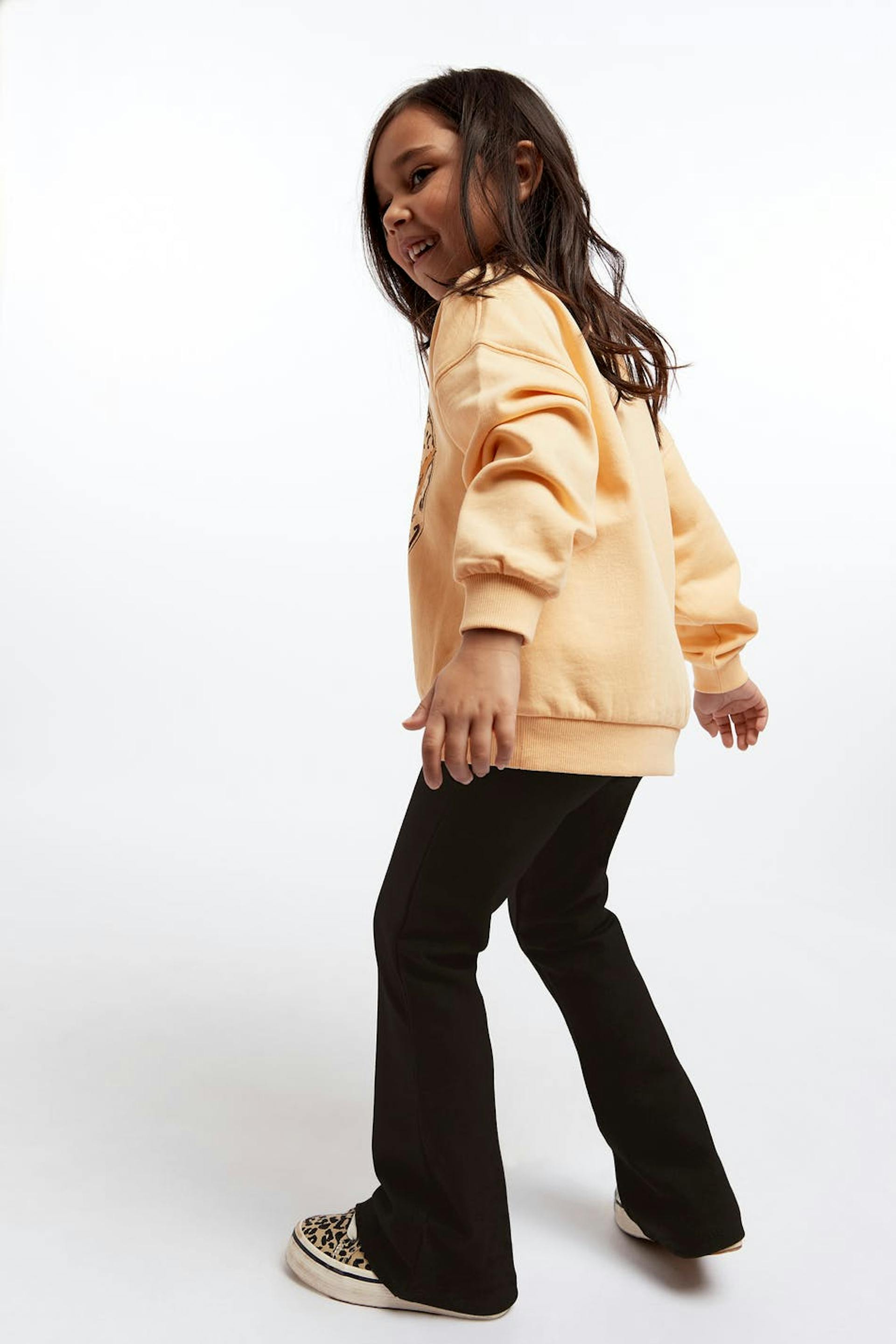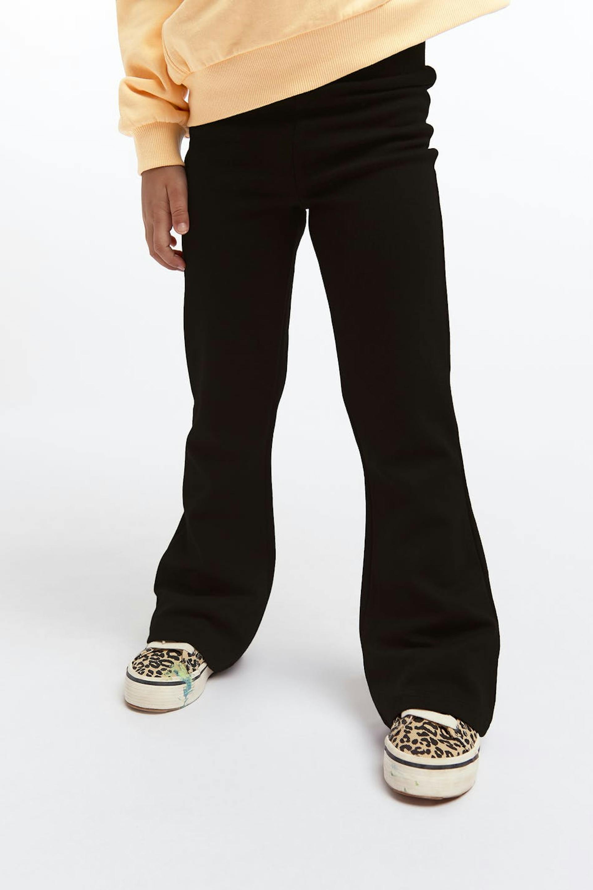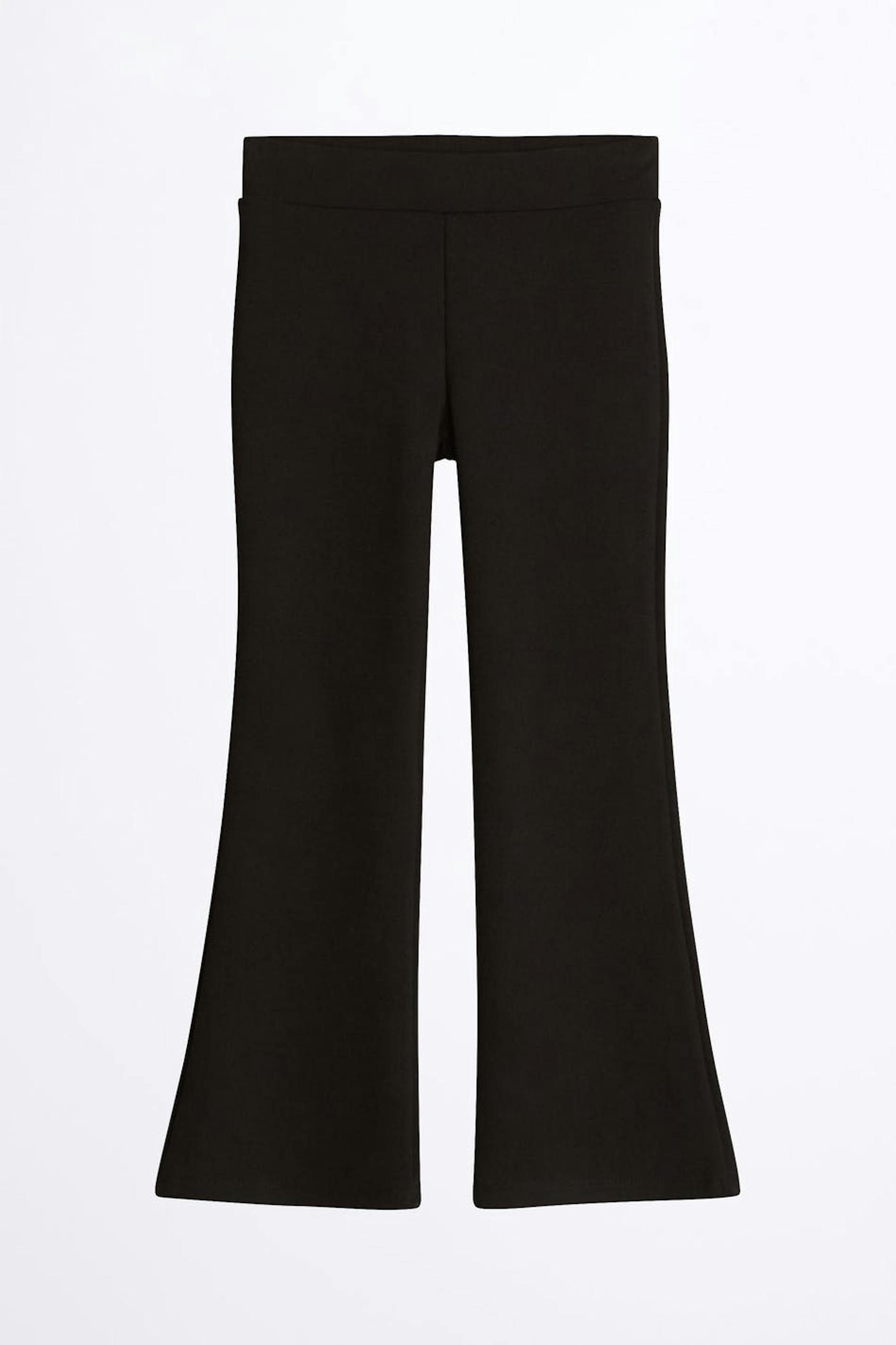 Hosen für Kinder mit sanft ausgestellten Beinen. Die Hosen sind schwarz. Sie sind hergestellt aus Trikot.
