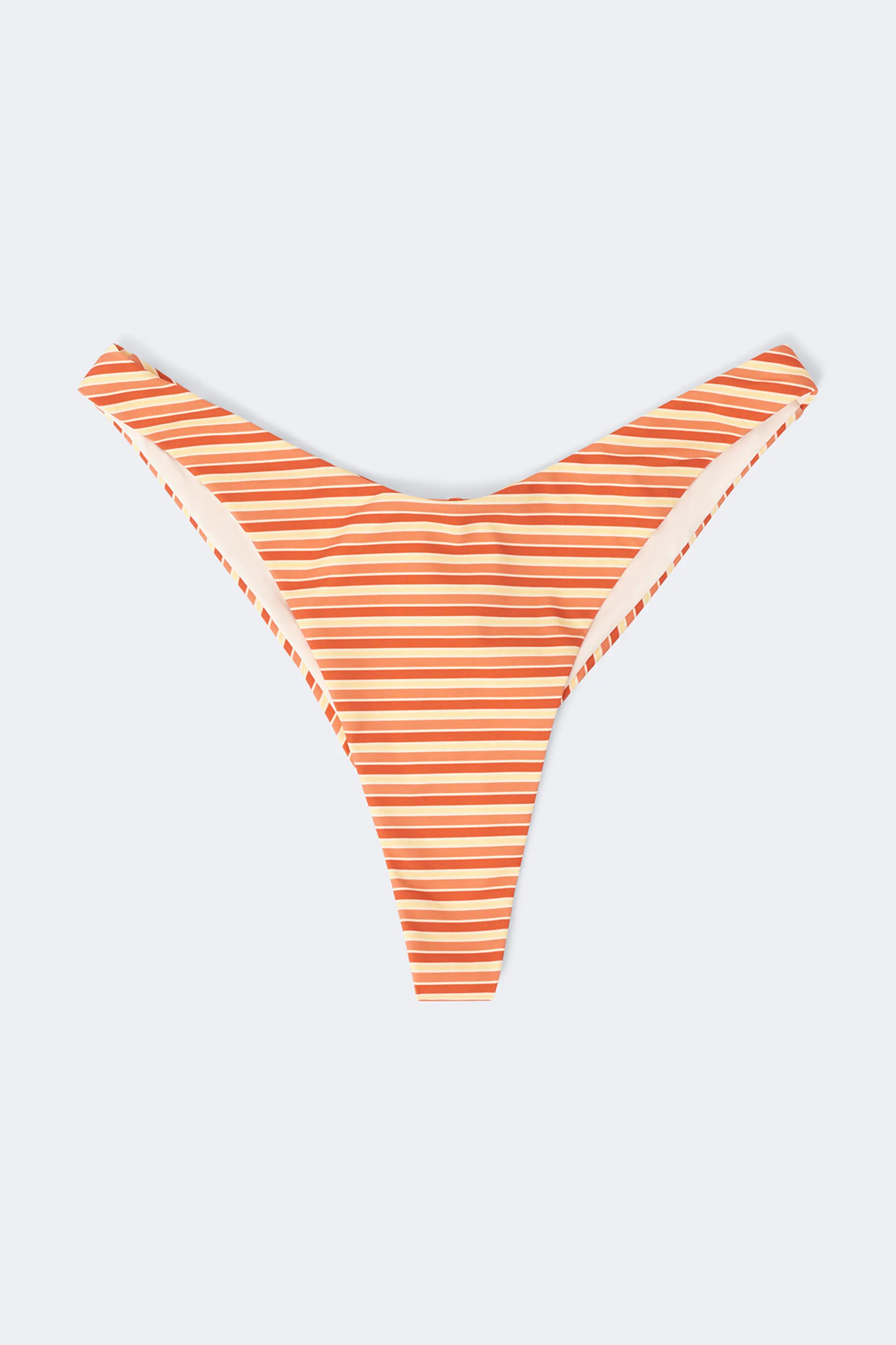 Gestreifte Bikini-Unterteile mit brasilianischem Schnitt. Die Höschen sind orange und haben vollständig gefütterte Innenseite und eine tiefe Taille.