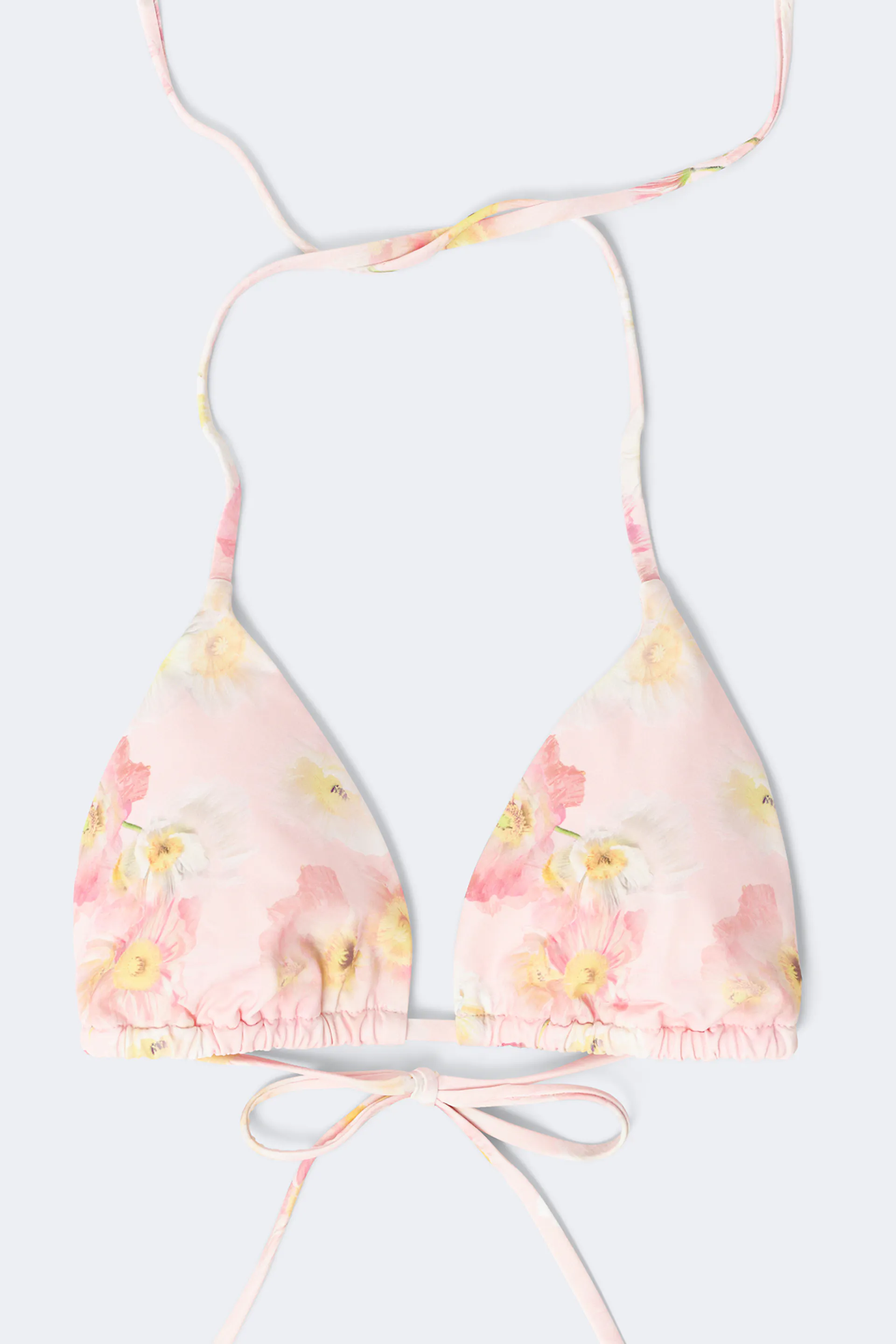 Triangel-Bikinoberteil mit einem Blumen-Muster und Selbstbindung am Hals und am Rücken. Das Bikini-Oberteil ist weiβ und rosa und hat abnehmbare Polsterung. Es hat matten Stoff und gefütterte Innenseite.