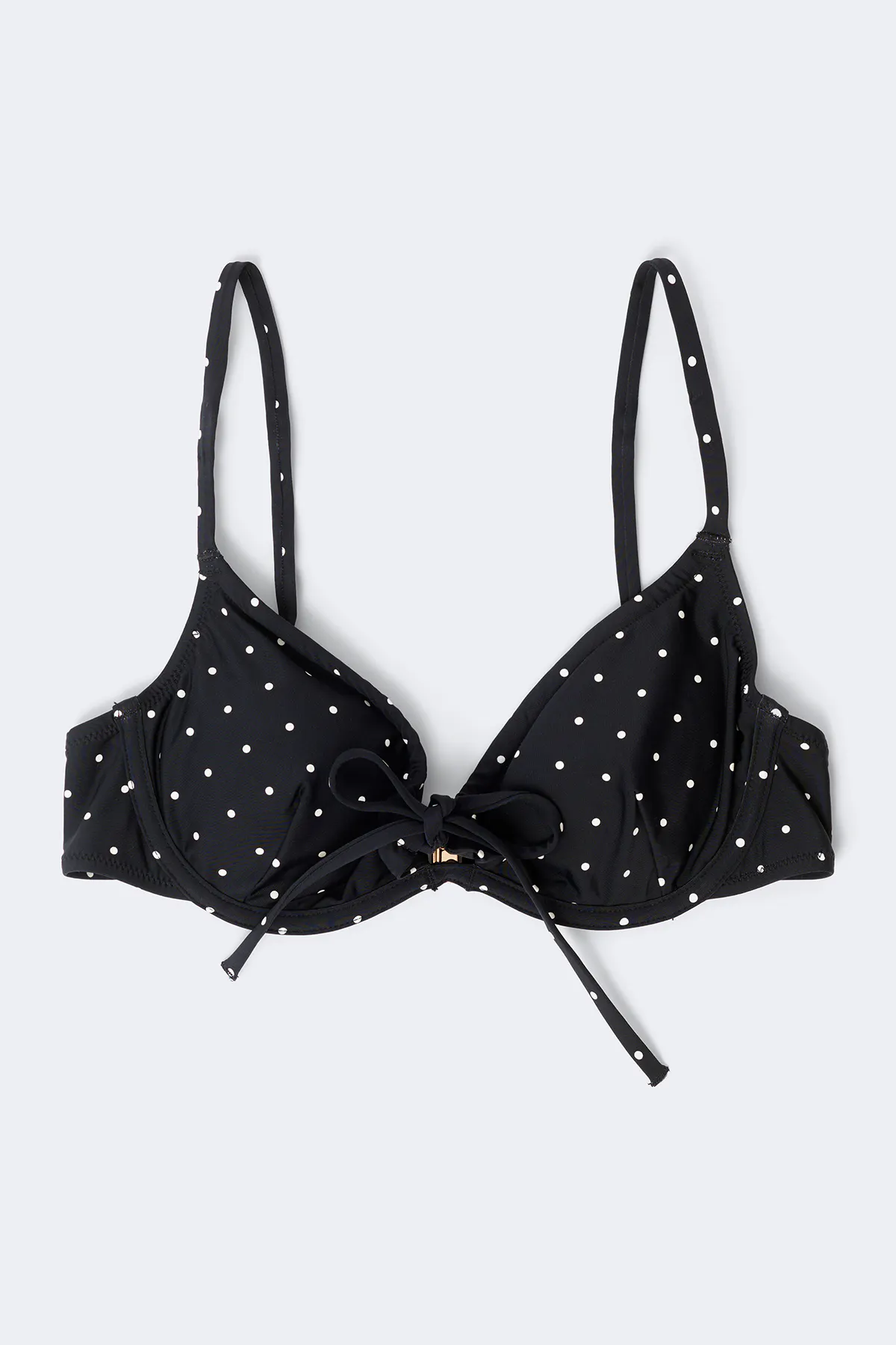 Gepunkteter Bikini-BH mit einstellbarer Kordel vorne. Das Bikini-Oberteil ist schwarz und hat Bügel. Es hat abnehmbare Polsterung, einstellbare Trägerbänder, matten Stoff und gefütterte Innenseite.