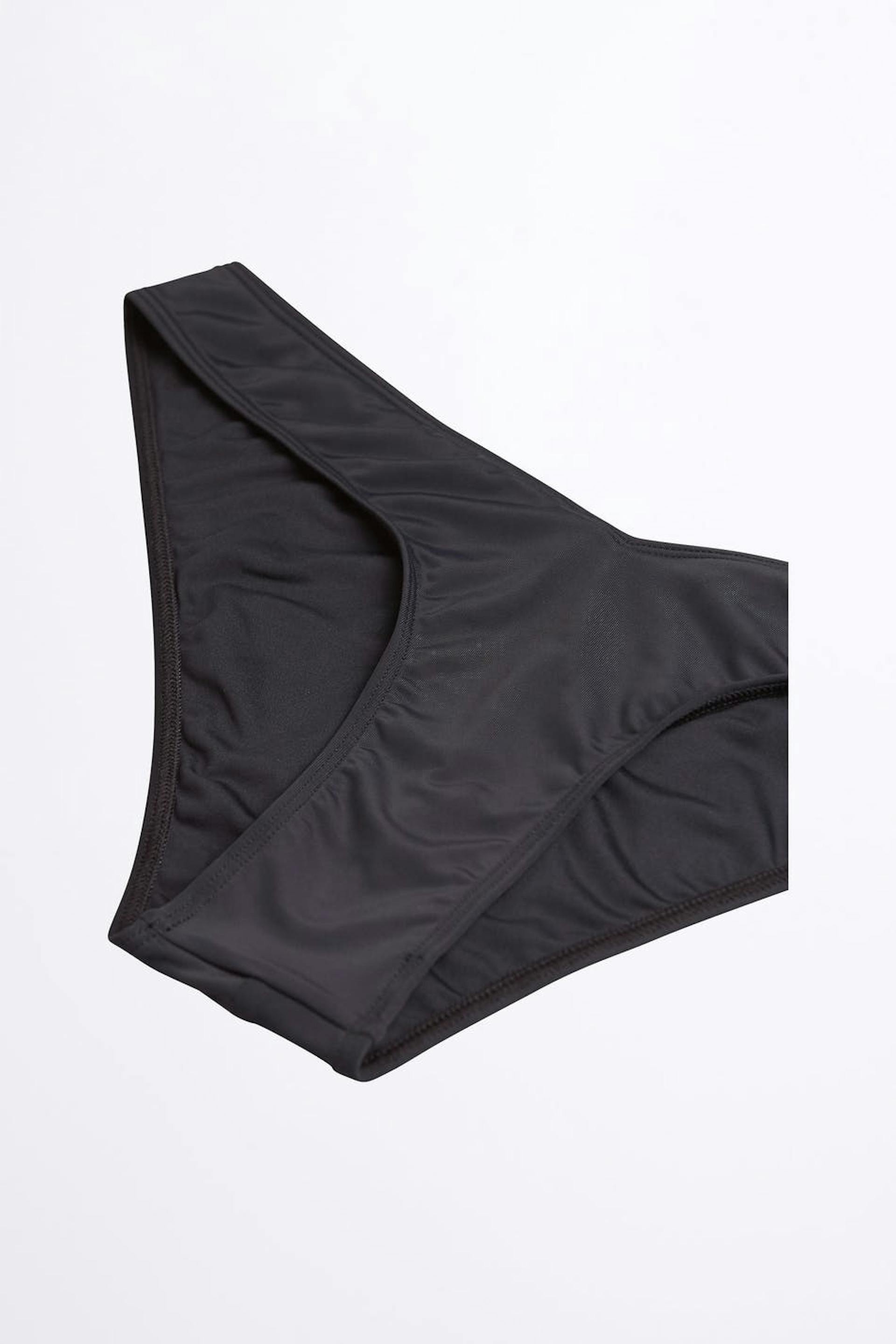 Frecher Bikini-Unterteil mit einem Badeanzug-Material. Das Höschen ist schwarz und vollständig gefüttert.