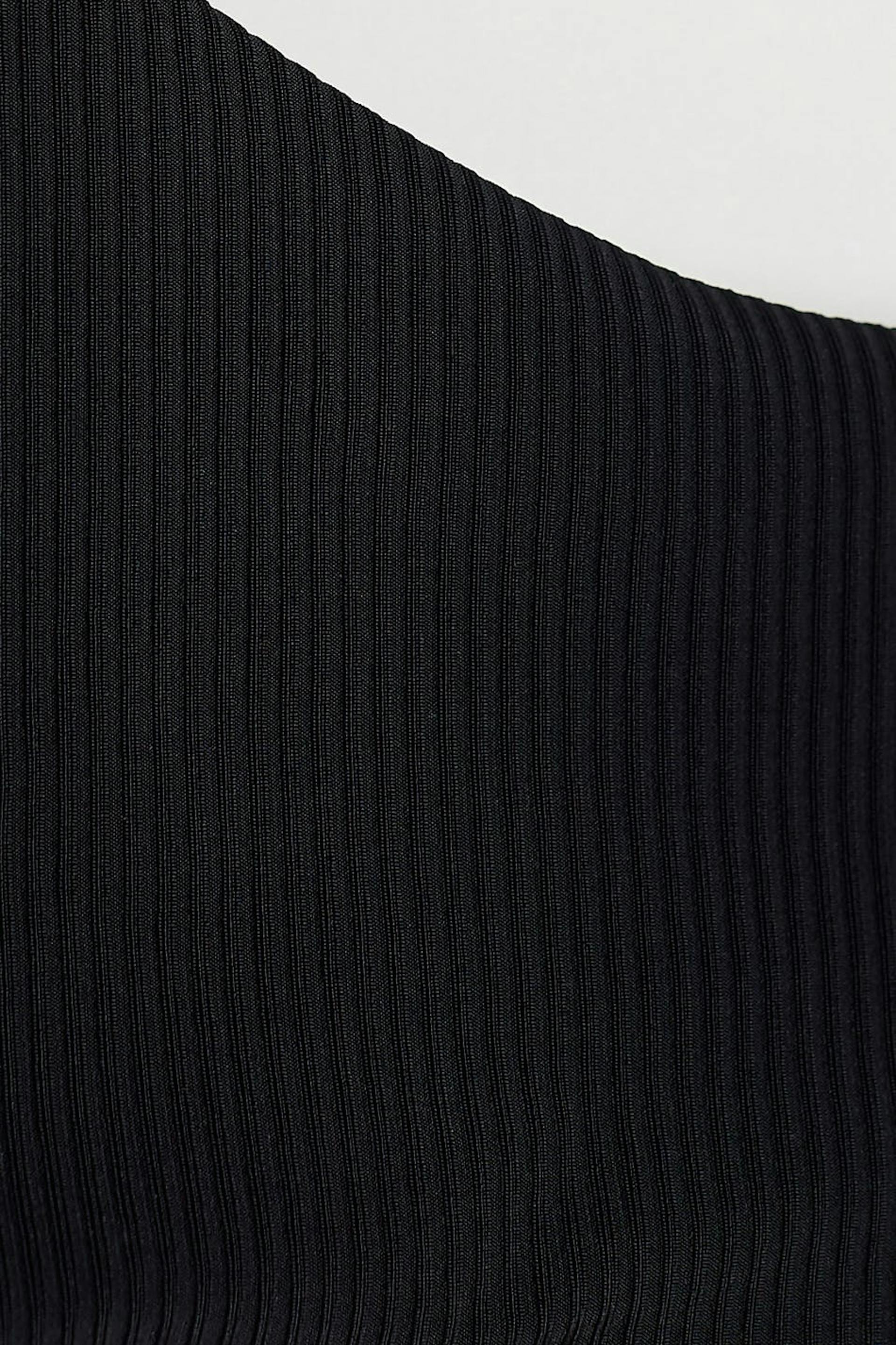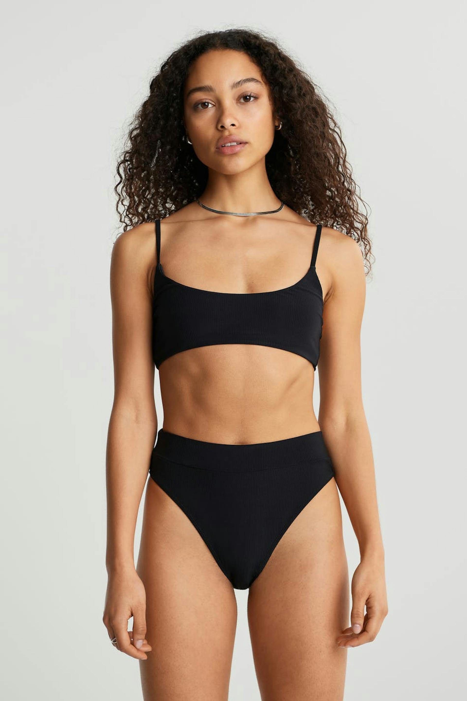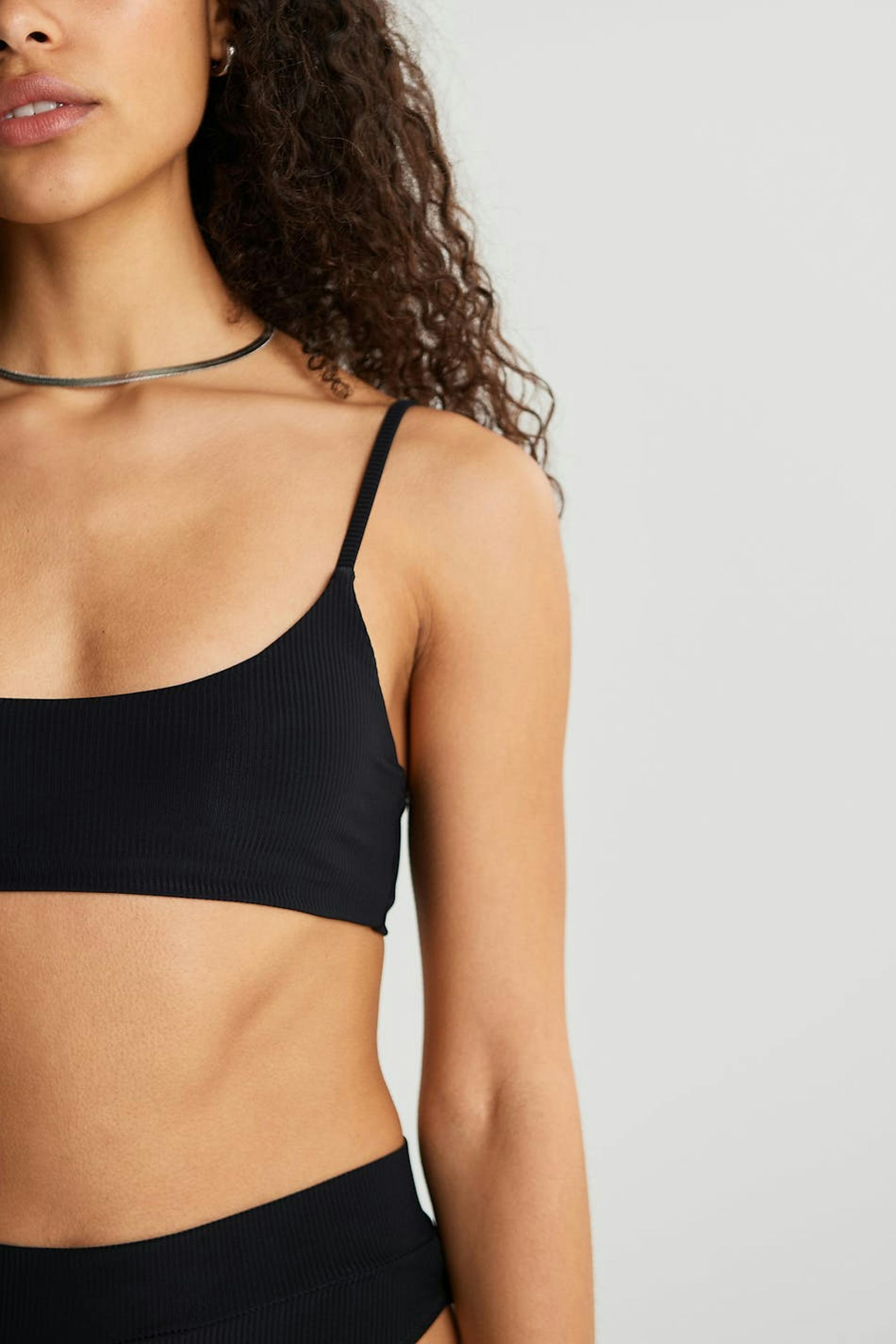 Geripptes Bikini Oberteil mit einstellbaren Trägerbändern. Das Bikini Oberteil ist schwarz.