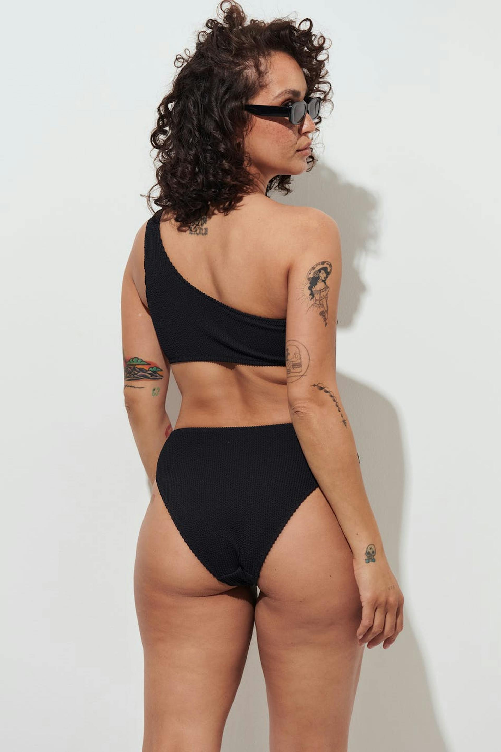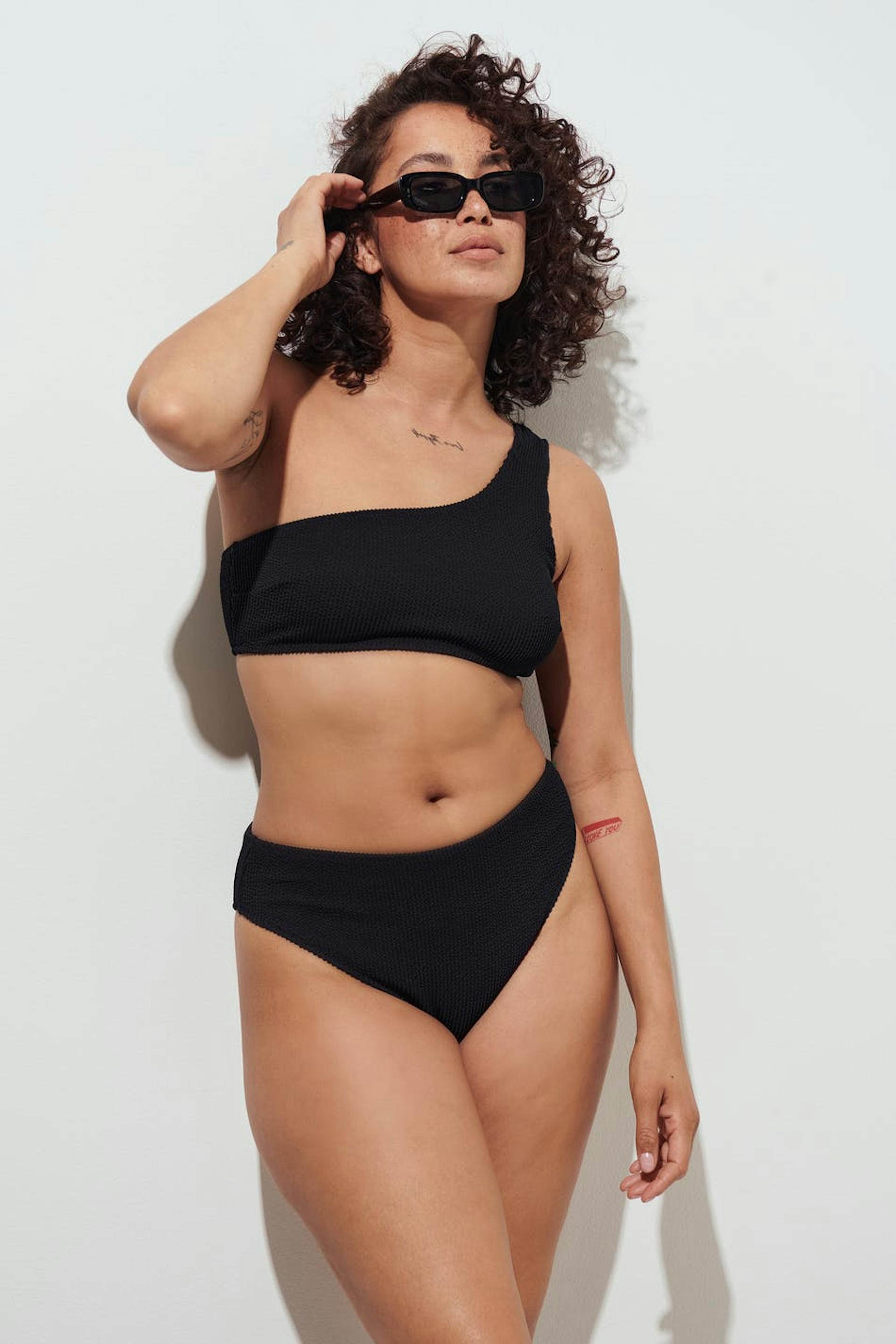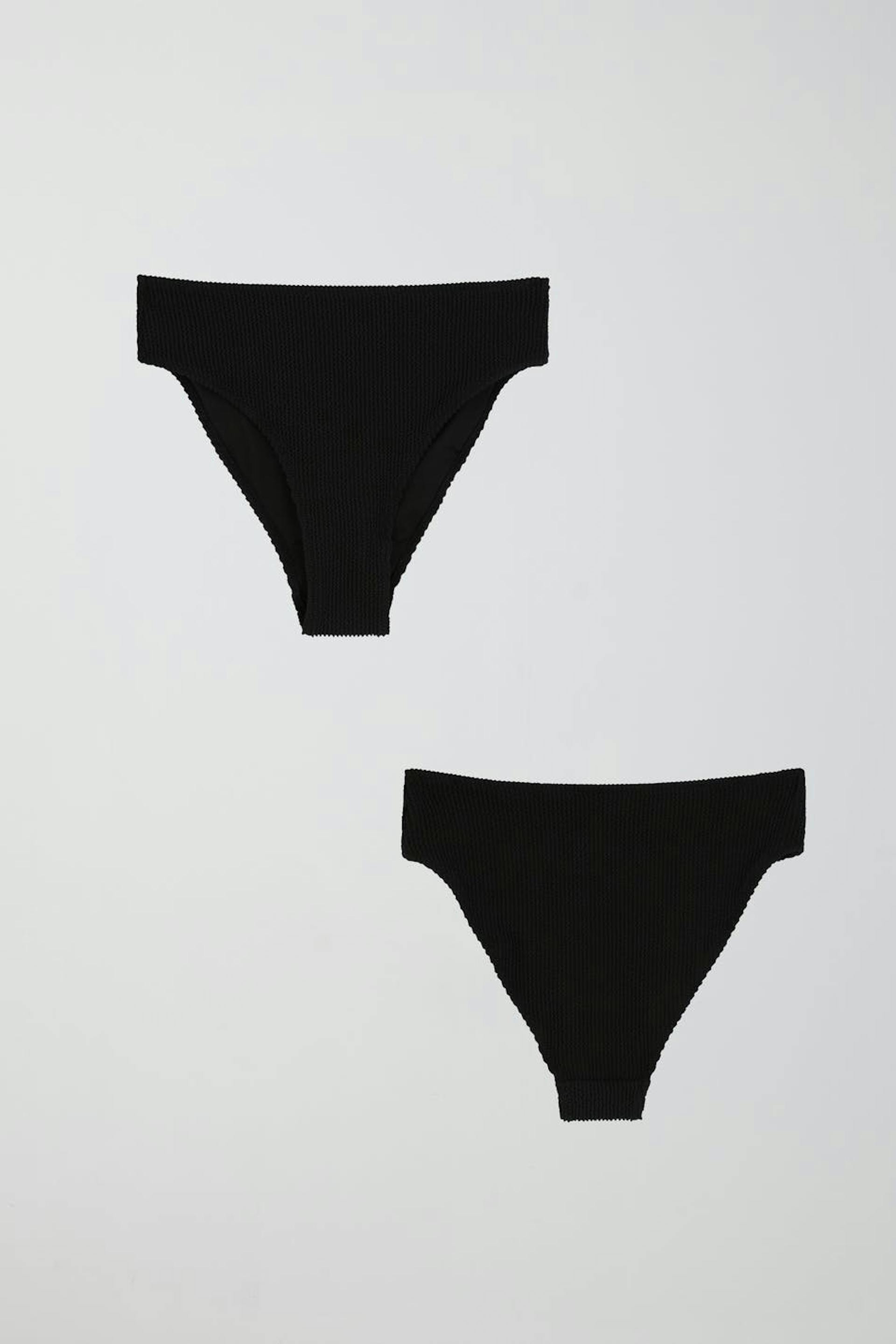 Vollständig gefütterte Bikini-Unterteile mit hohem Bund. Die Höschen sind schwarz und haben ein strukturiertes Material.