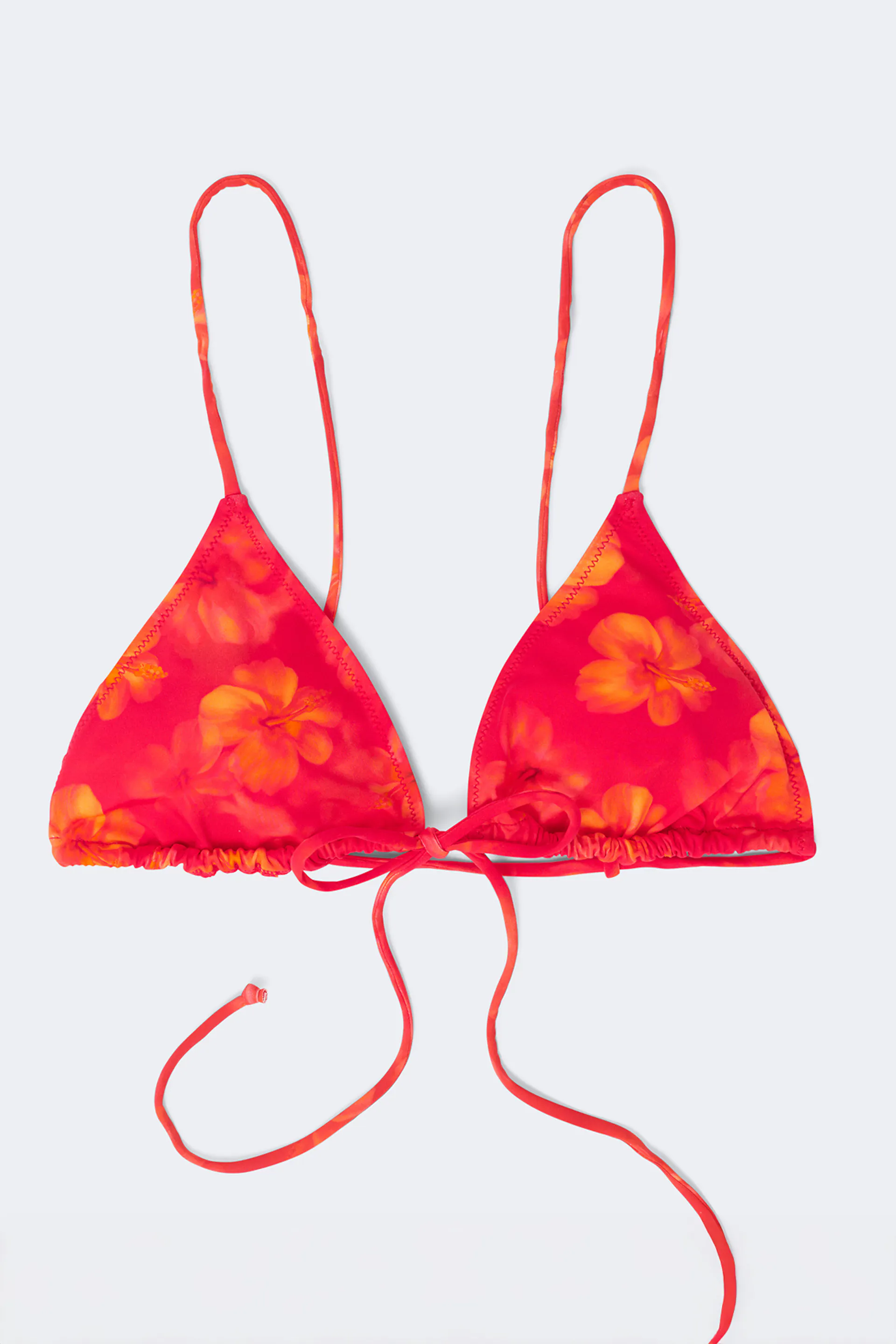 Triangel-Bikinoberteil mit einem Blumen-Muster und Selbstbindung vorne. Das Bikini-Oberteil ist rot und hat einstellbare Trägerbänder. Es hat abnehmbare Polsterung und gefütterte Innenseite.