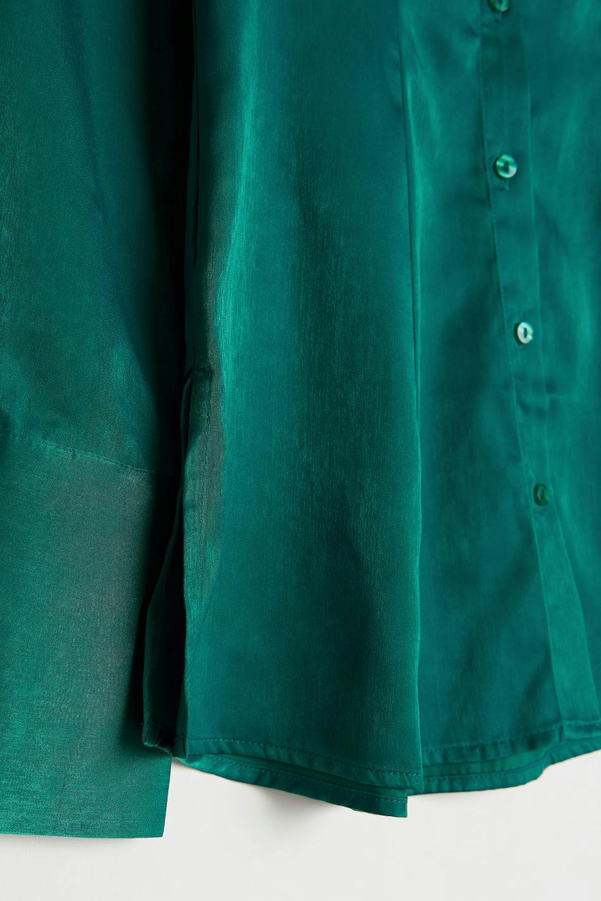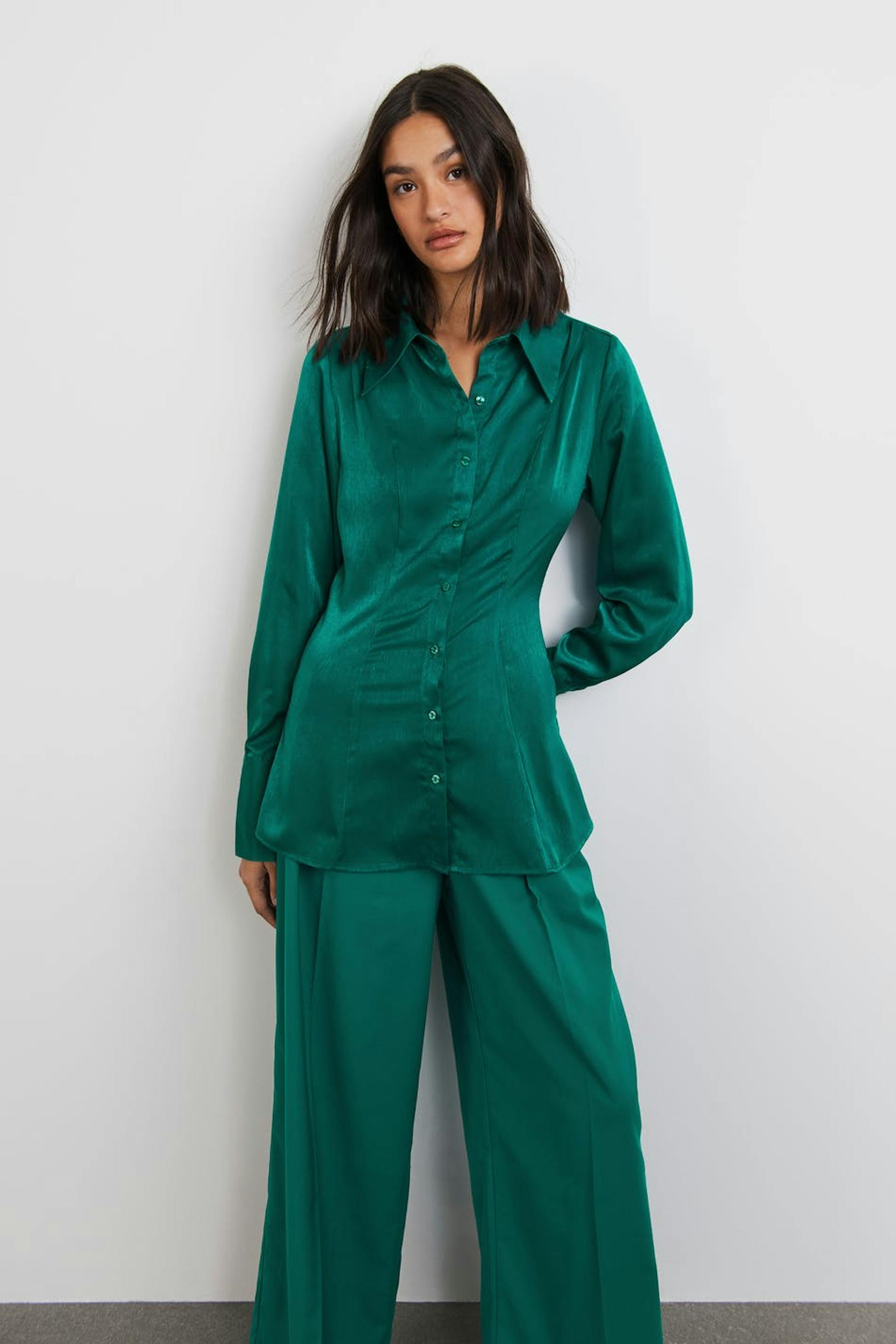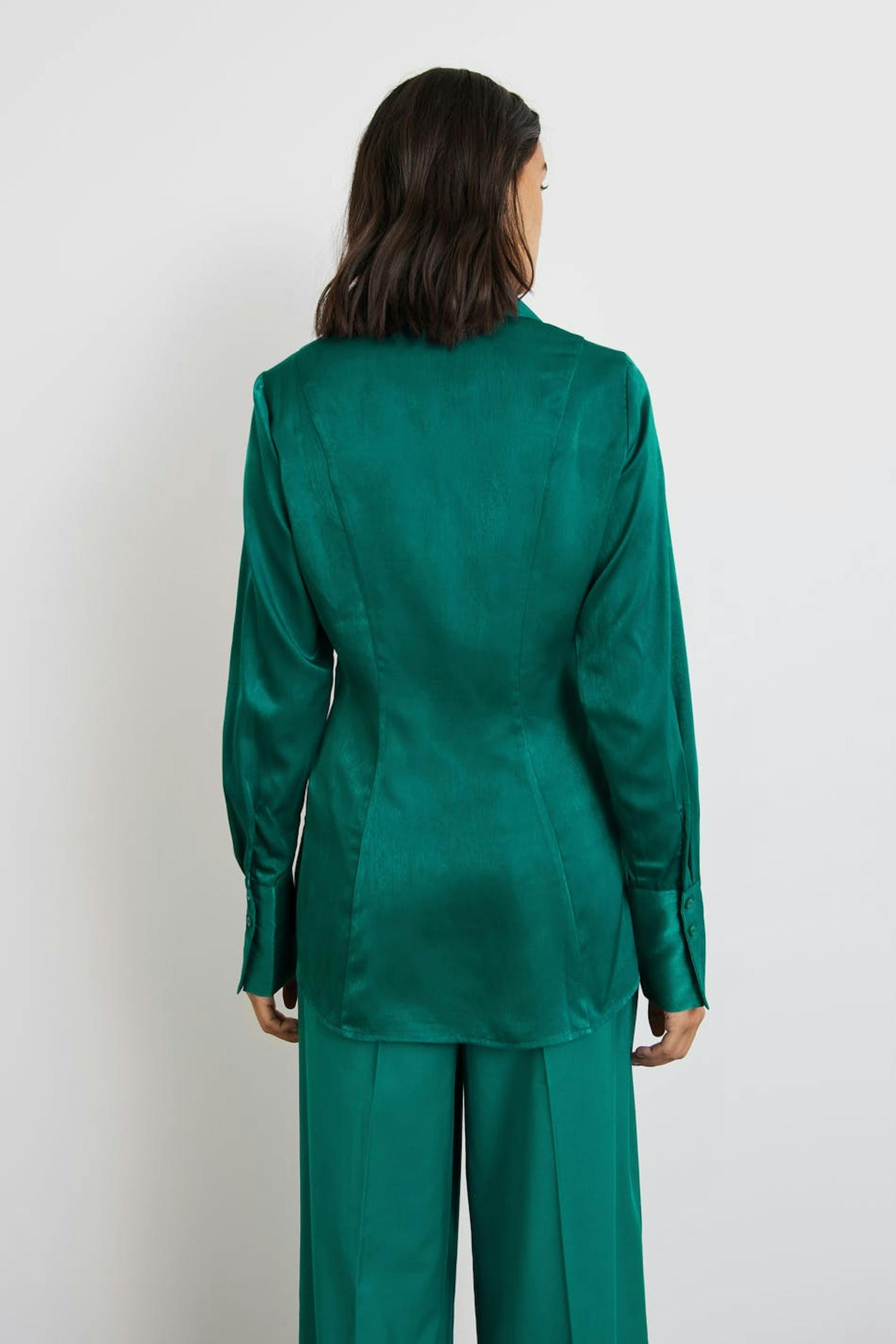 Hemd mit einer geformten Passform. Das Hemd ist grün und hat ein Satin-Material. Es hat Naht-Details vorne, einen Knopfverschluss und Falten-Details an den Ärmeln.