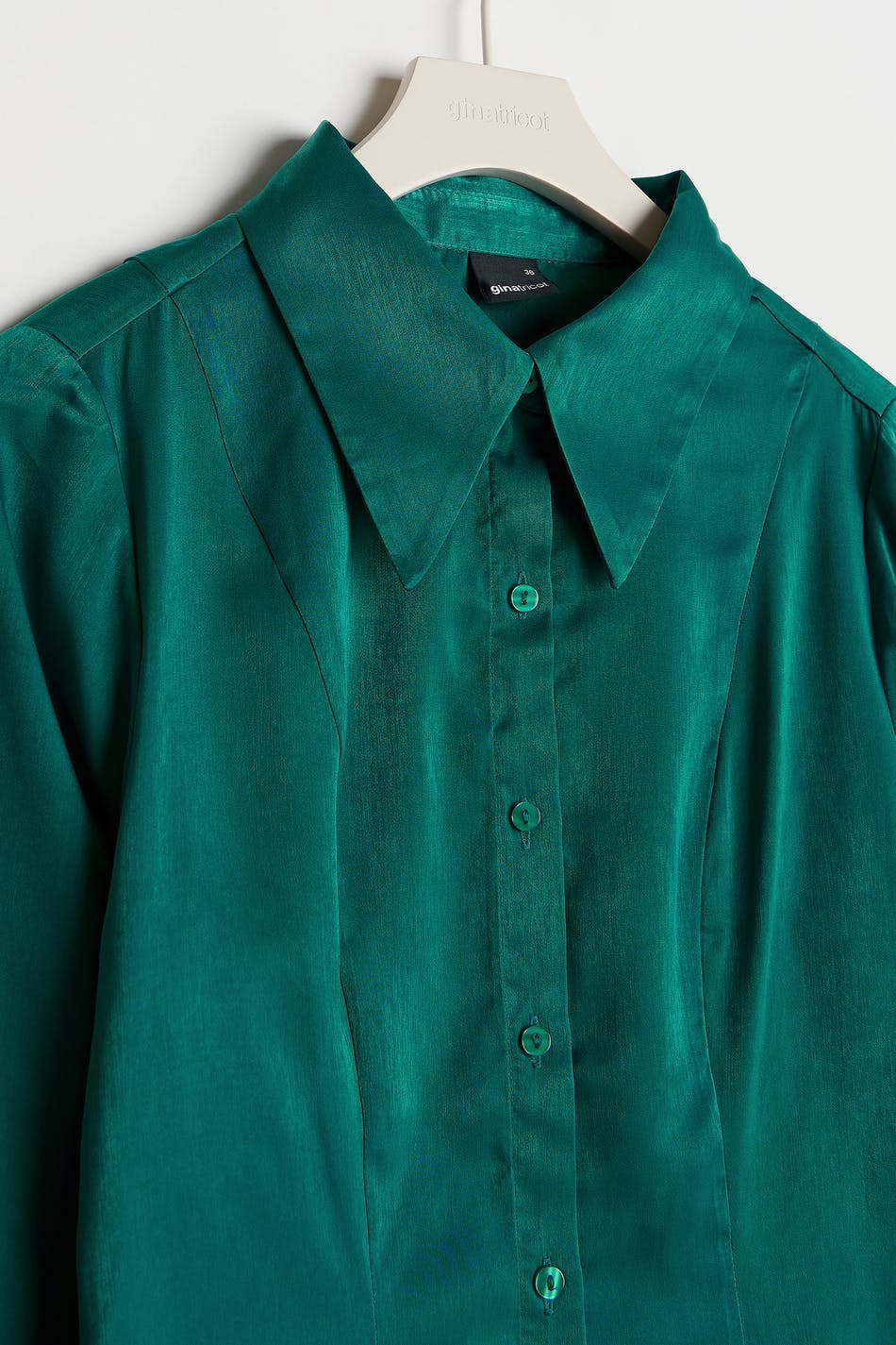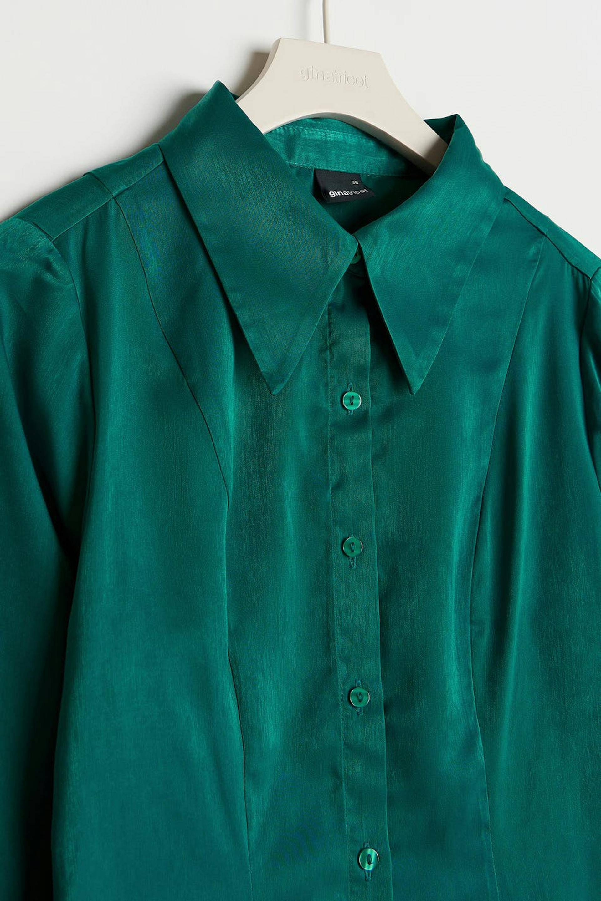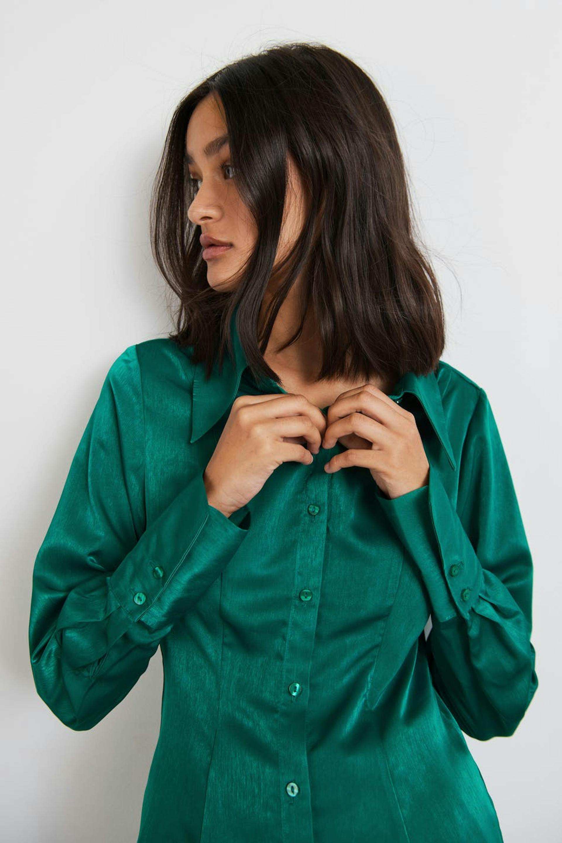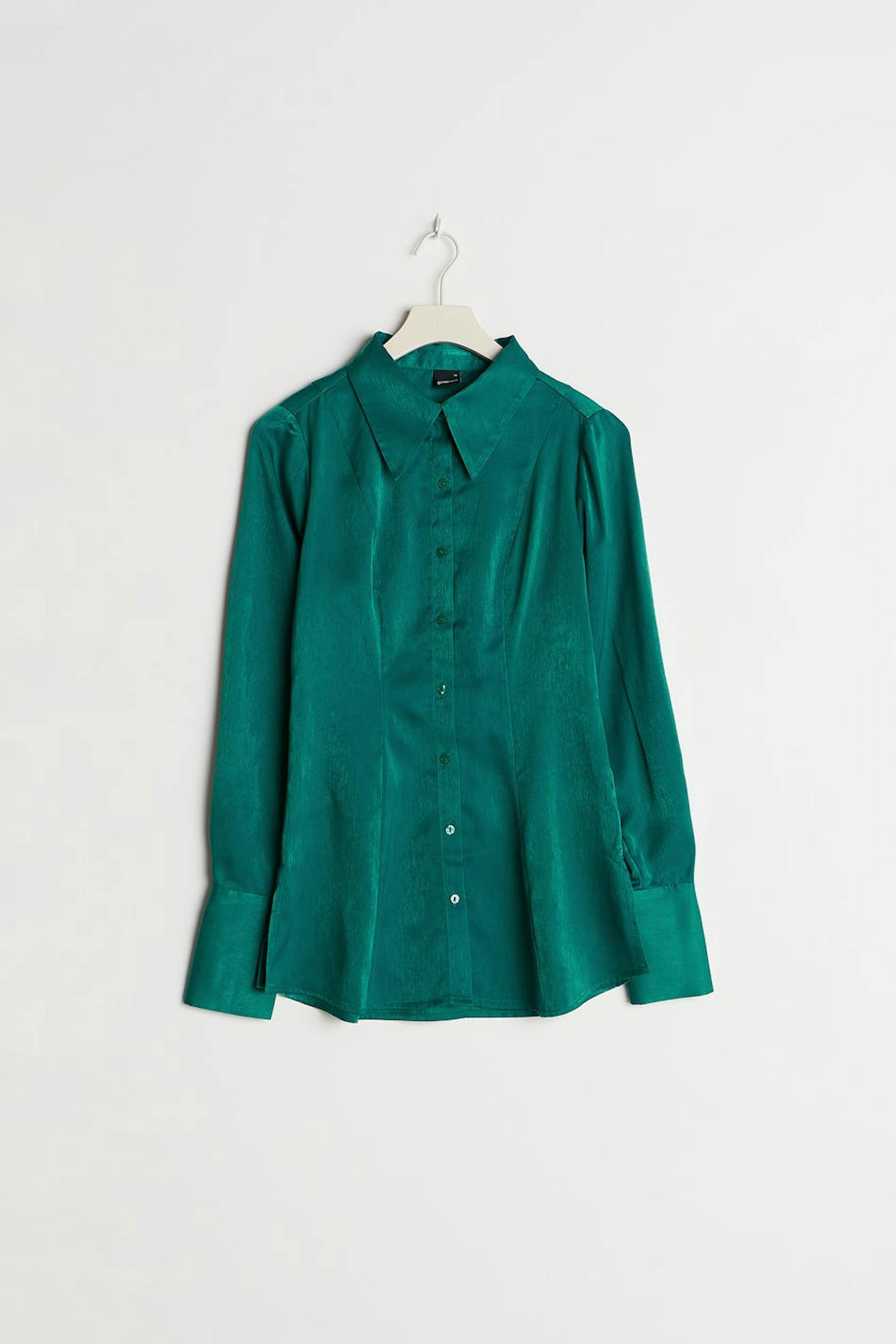 Hemd mit einer geformten Passform. Das Hemd ist grün und hat ein Satin-Material. Es hat Naht-Details vorne, einen Knopfverschluss und Falten-Details an den Ärmeln.