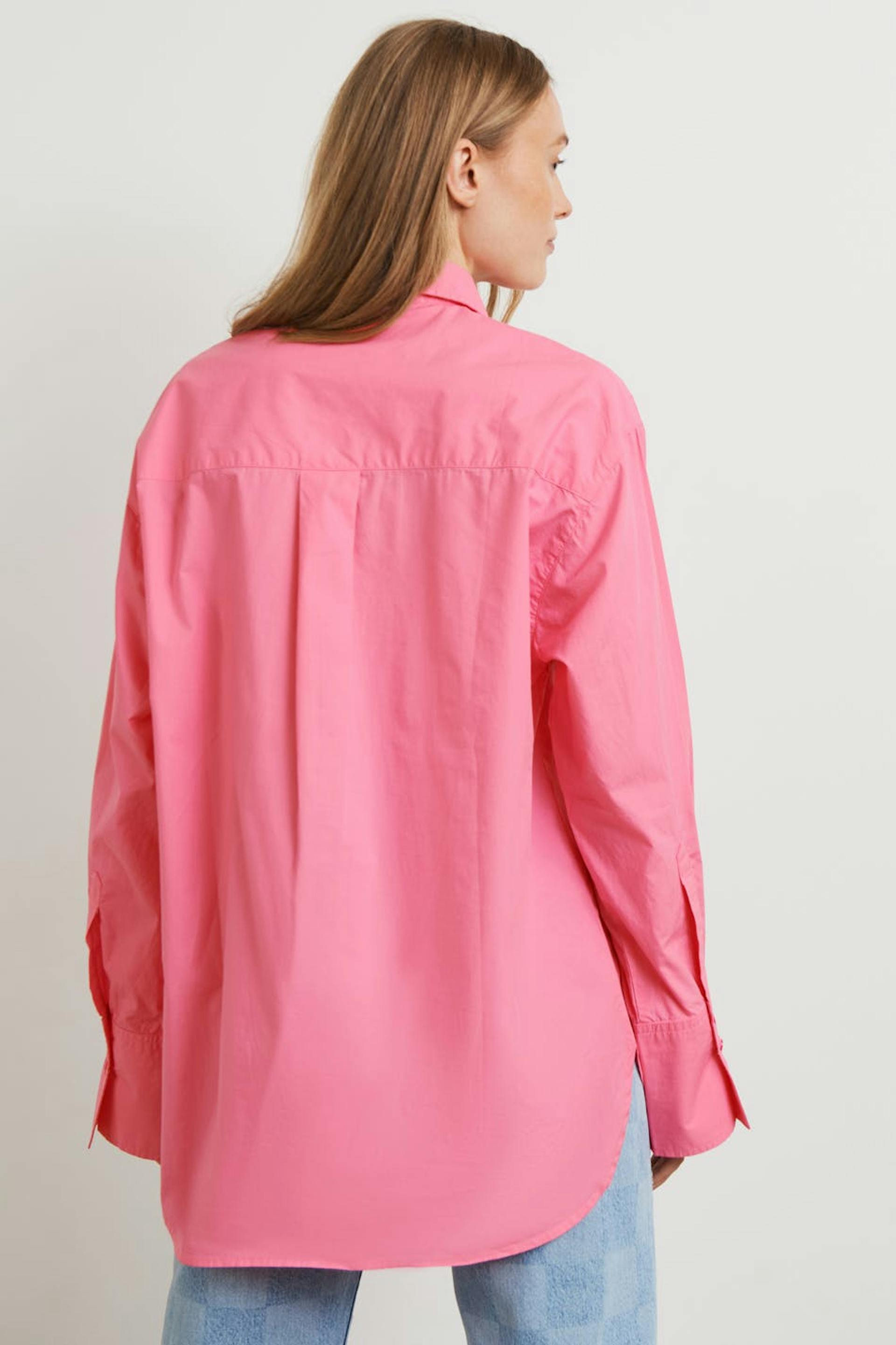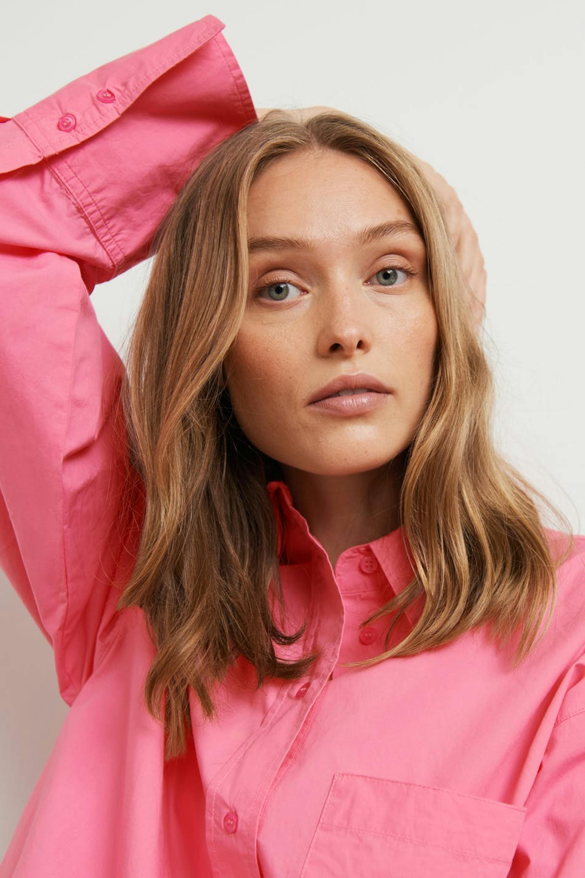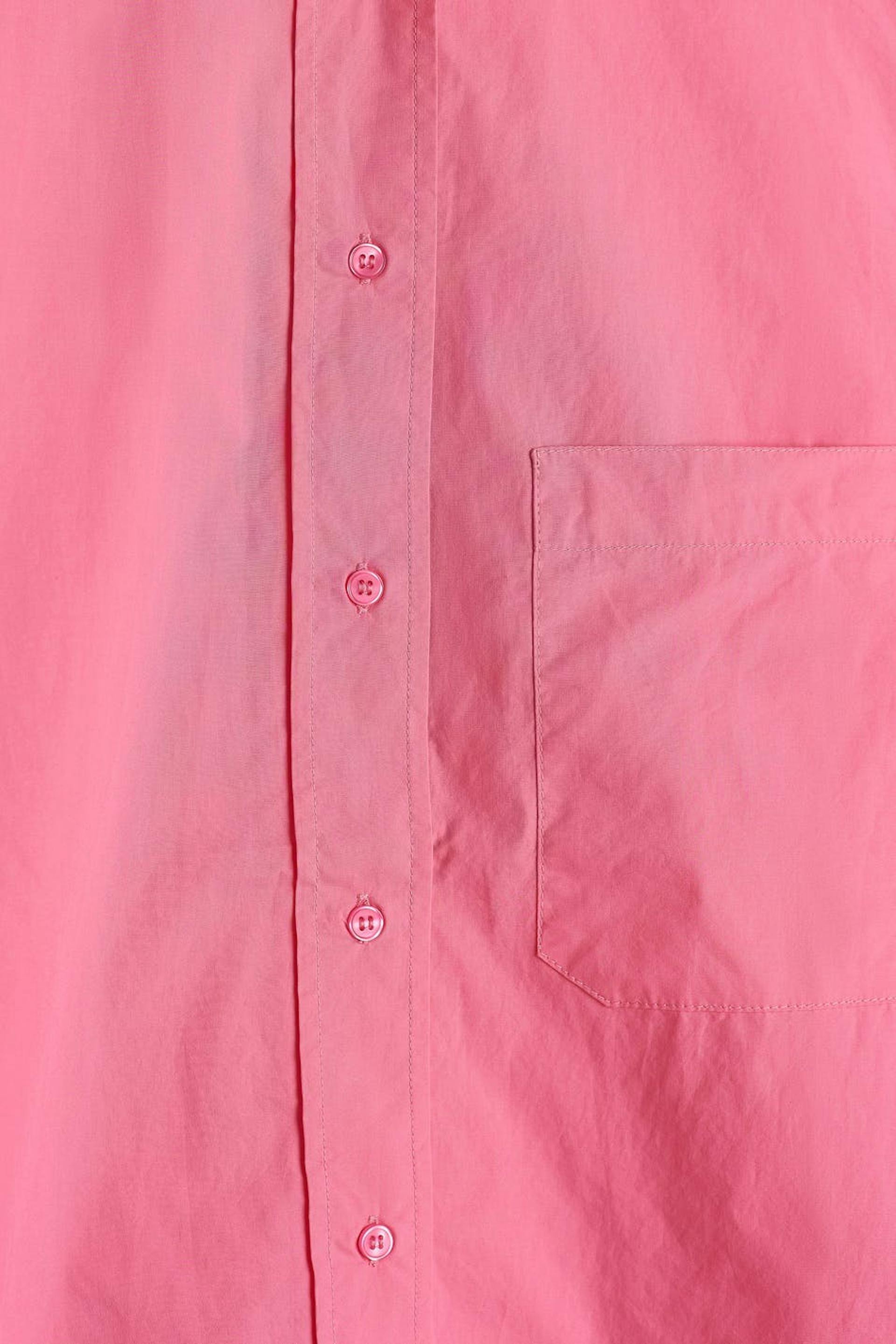 Hemd mit einer Oversize Passform. Das Hemd ist rosa und hat Knöpfe vorne. Es ist hergestellt aus Popeline und hat eine Brusttasche auf einer Seite.