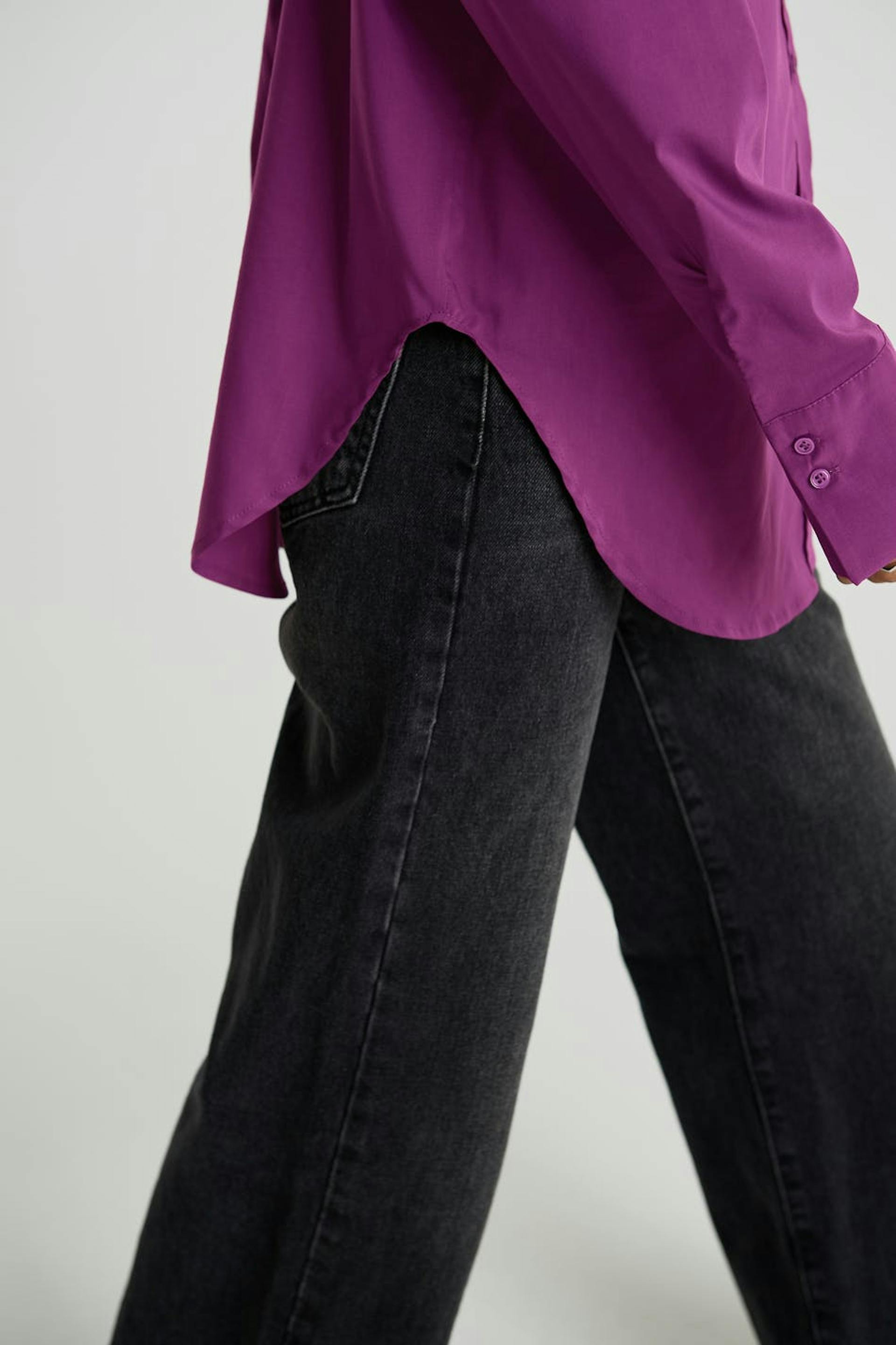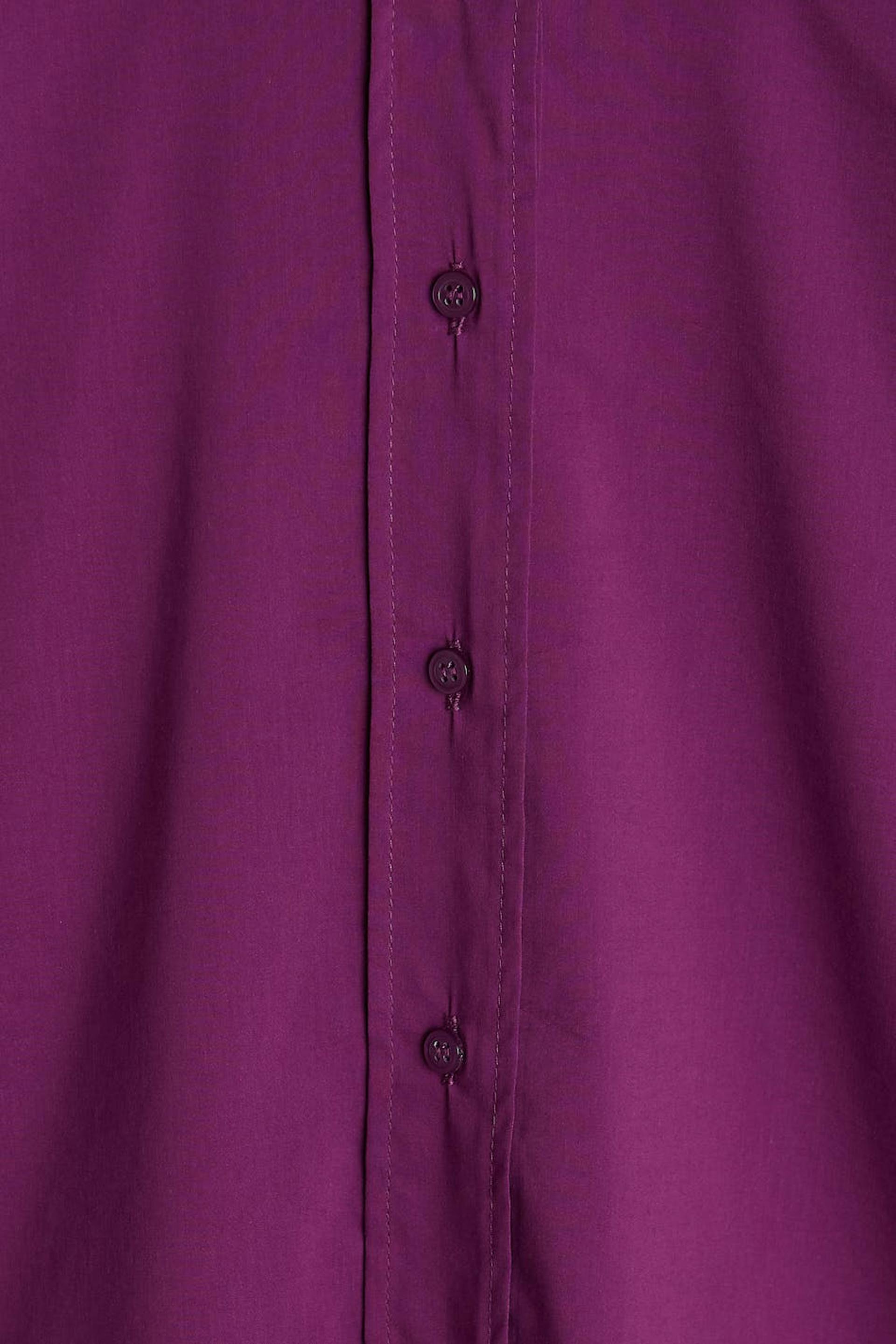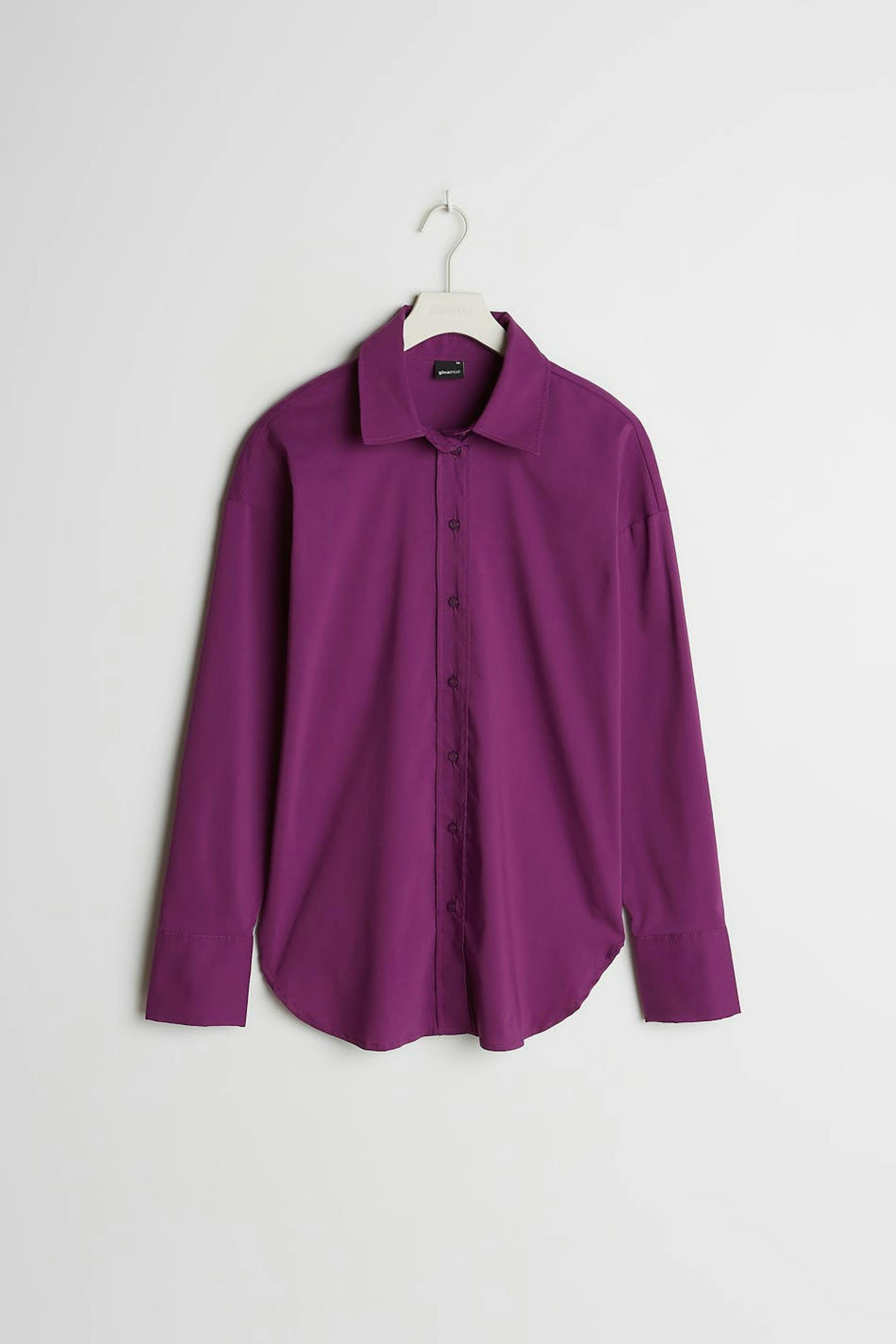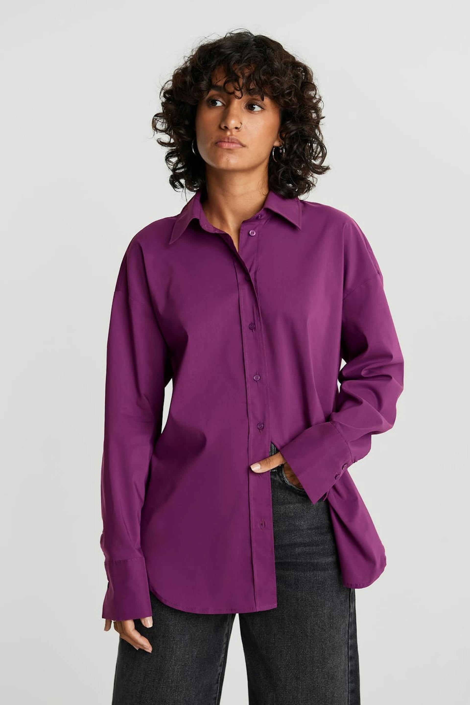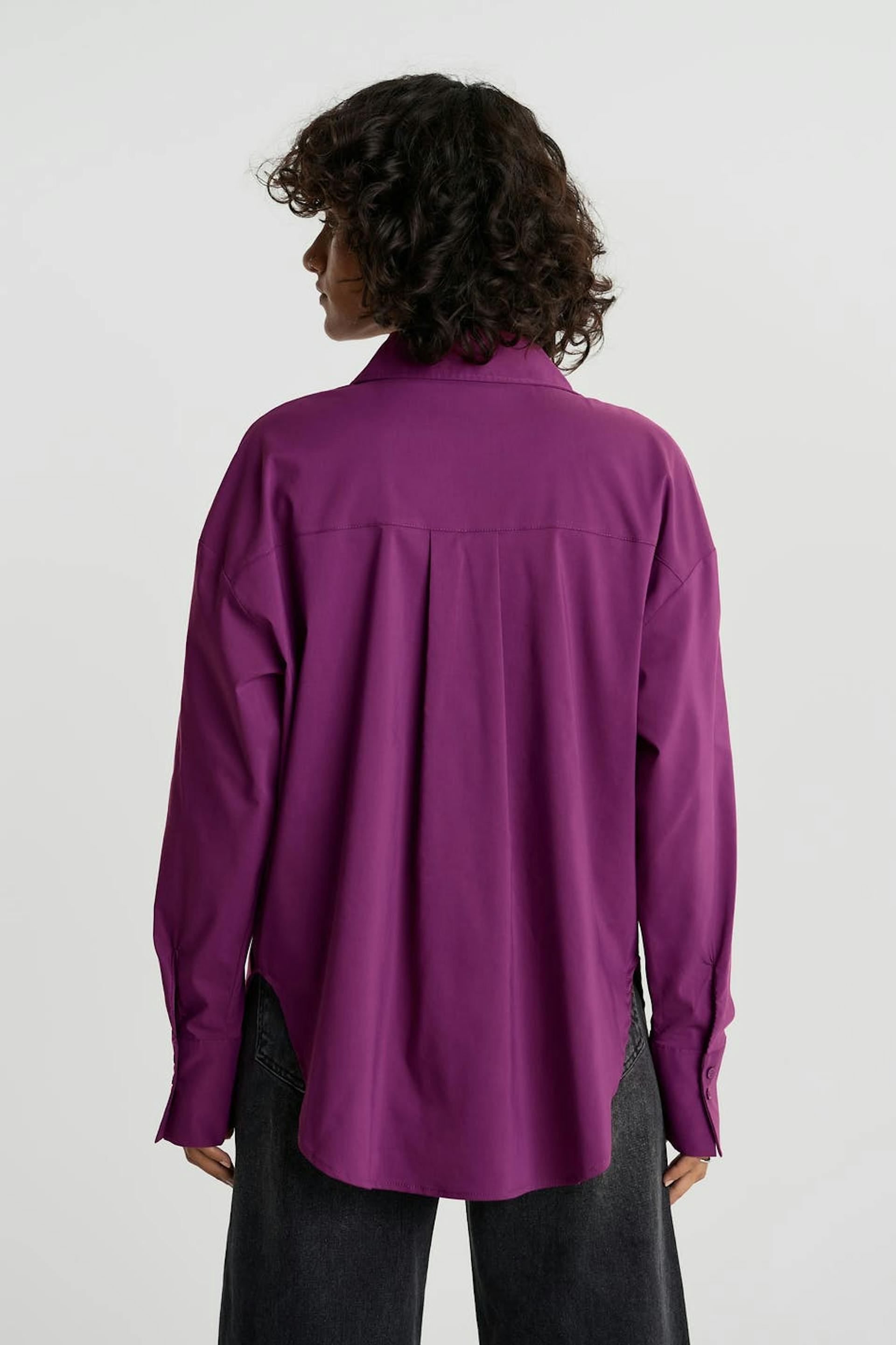 Übergroßes Hemd mit Knöpfen vorne. Das Hemd ist lila und etwas länger.