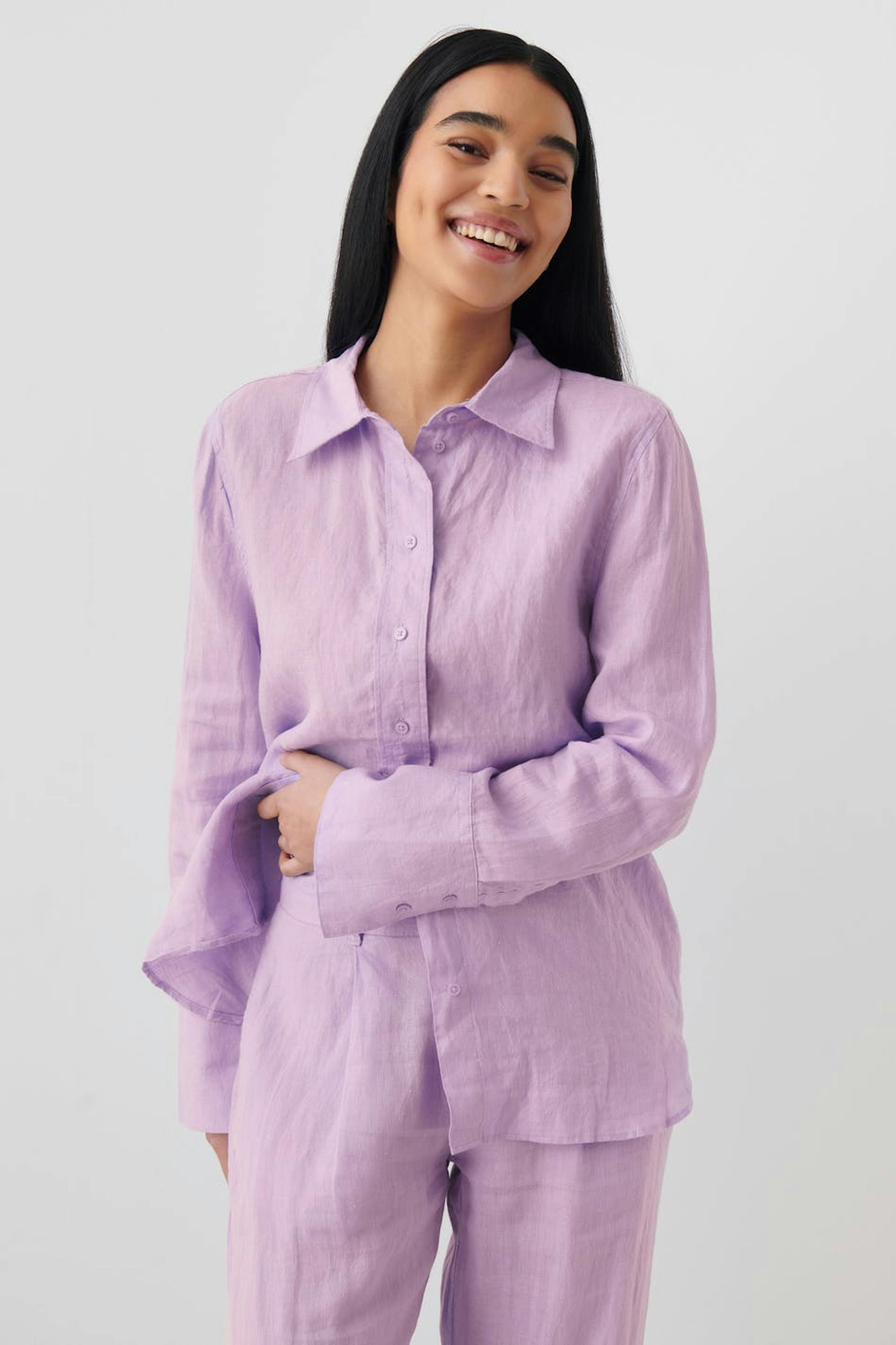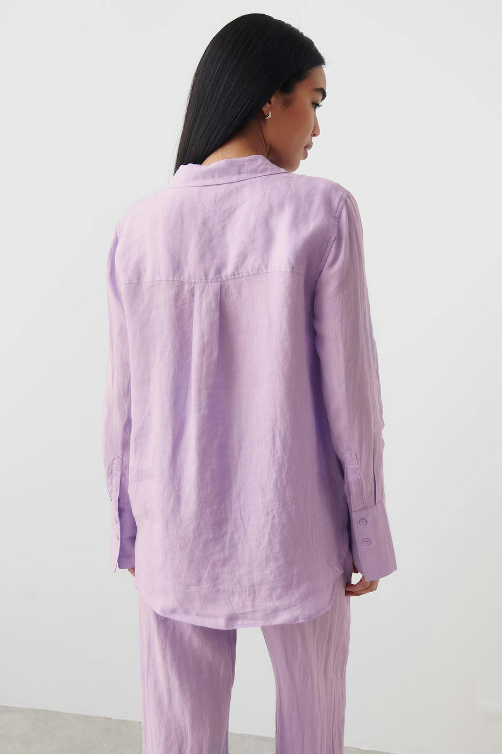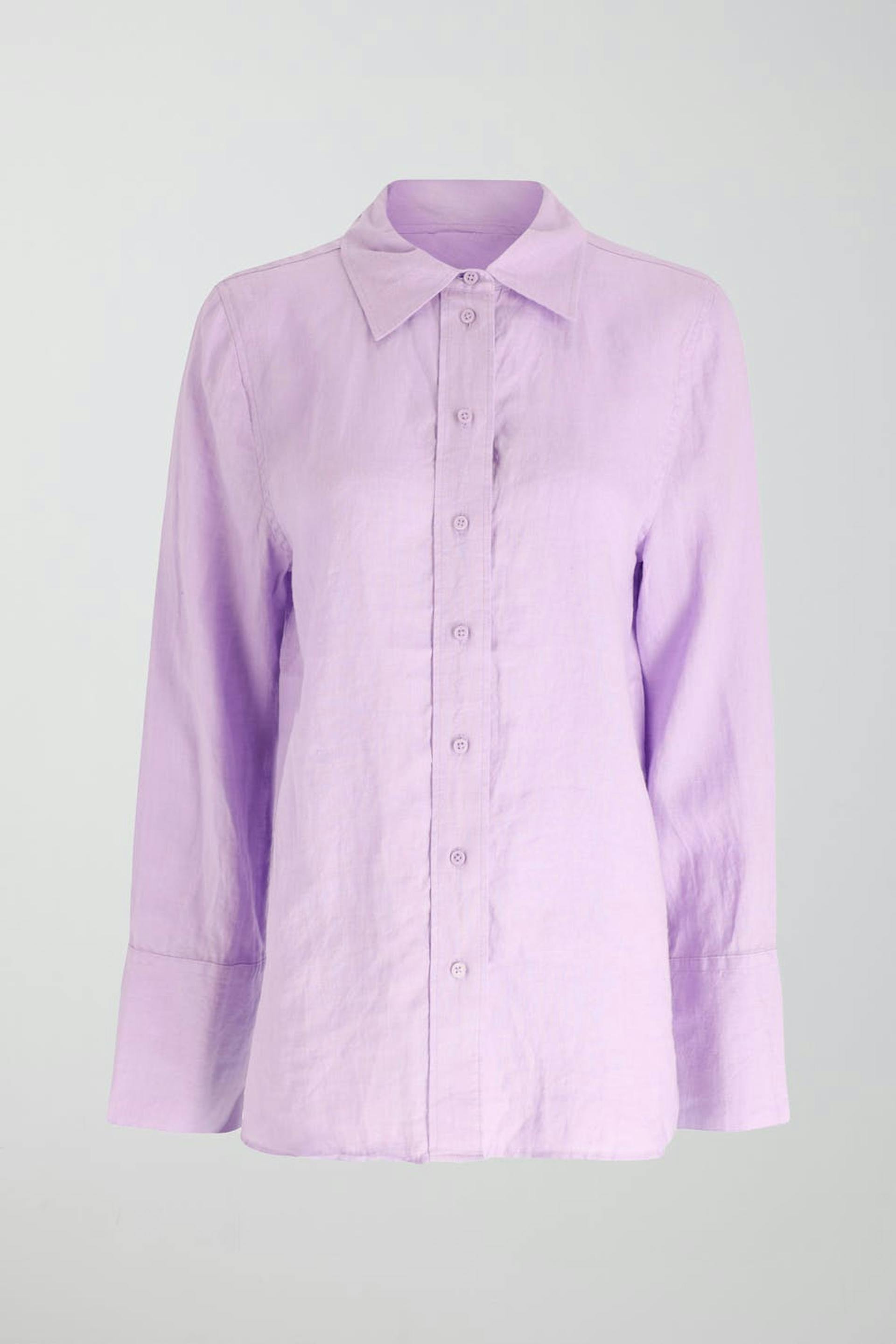 Leinenhemd mit Oversize-Passform. Das Hemd ist lila und hat Knopfleiste vorne. Es hat Kragen, Passe mit Falten auf der Rückseite und langen Ärmel mit Knopf und Manschette.