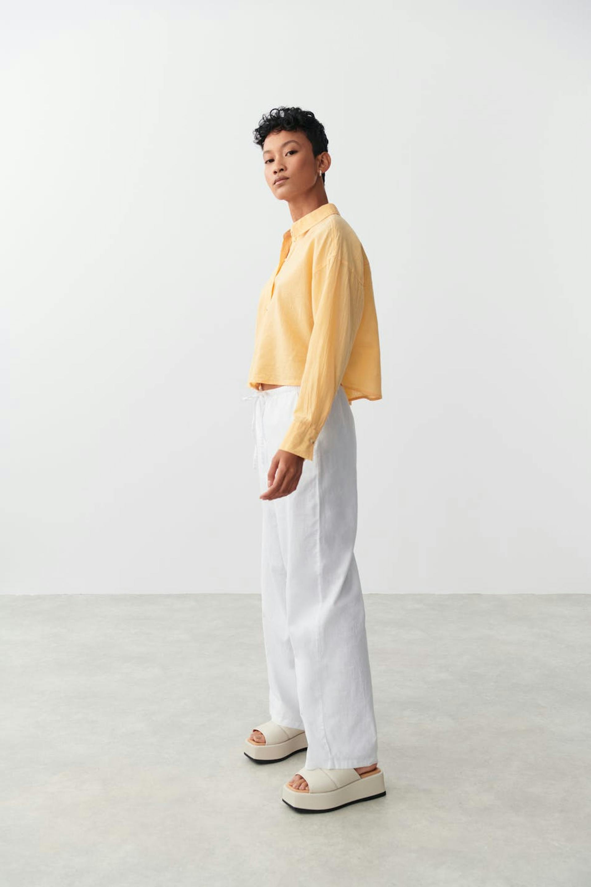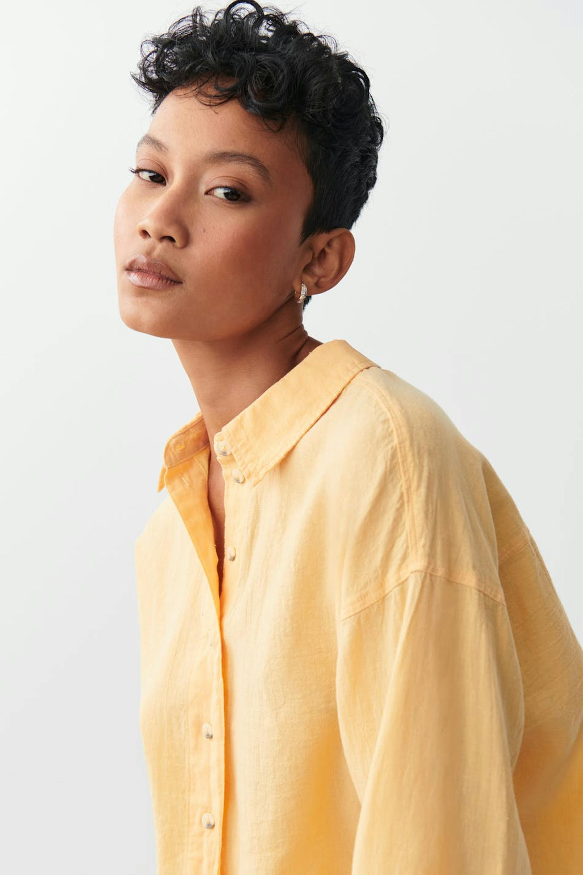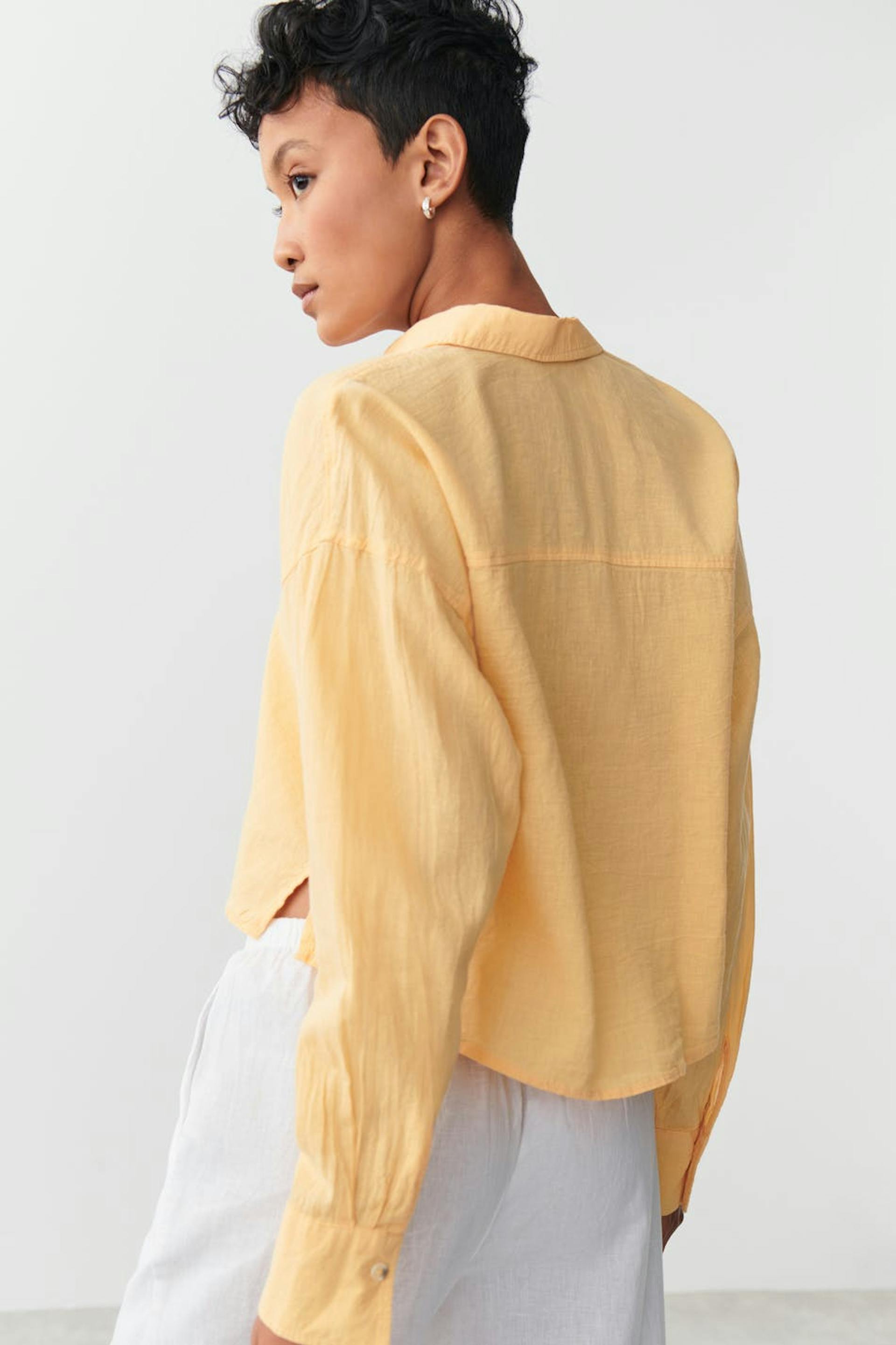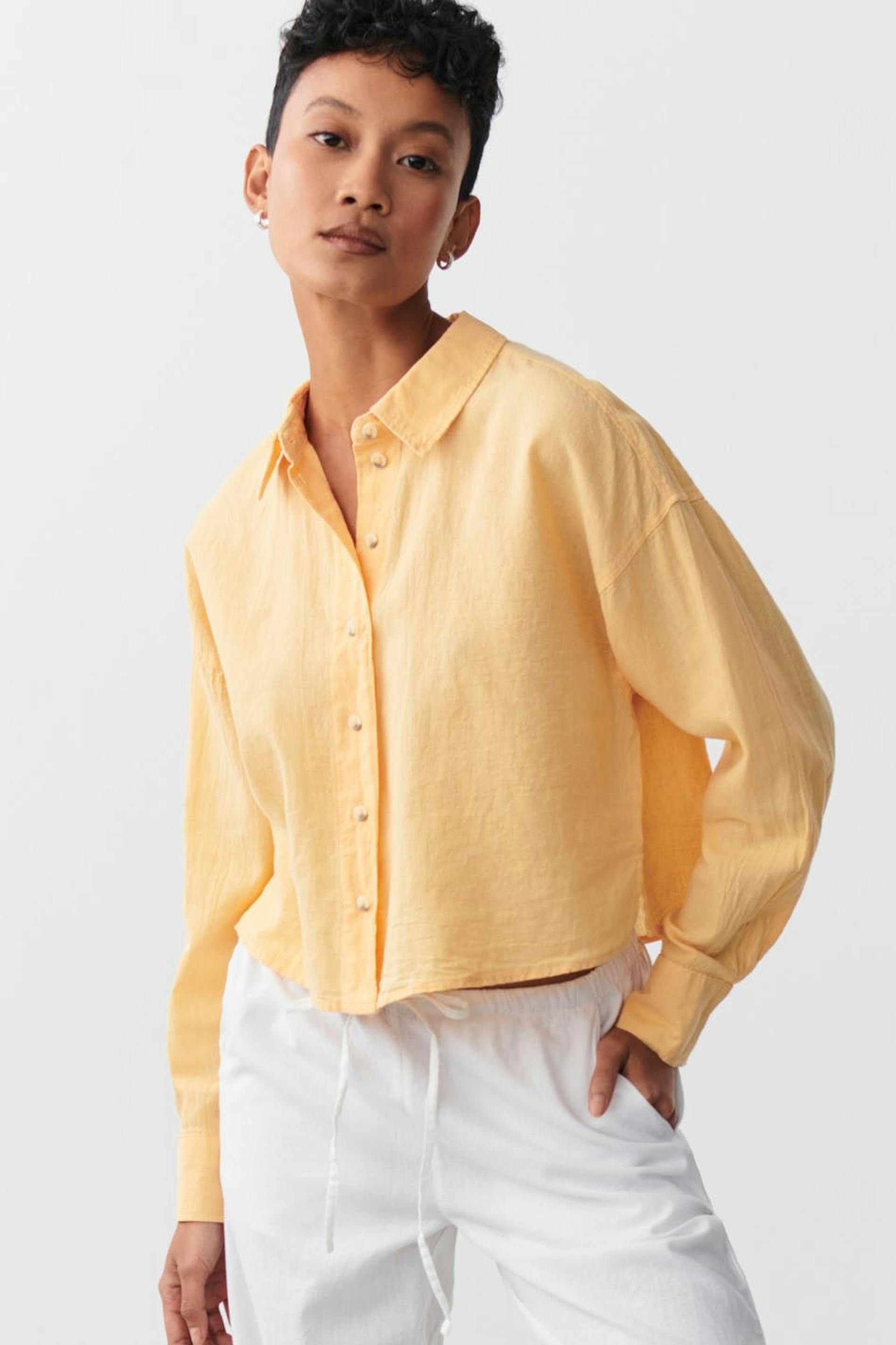 Abgeschnittenes Leinenhemd mit lockerer Passform. Das Hemd ist gelb, gewebt und langärmlig. Es hat Kragen, Knopfleiste vorne und langen Ärmel mit Knopf und Manschette.