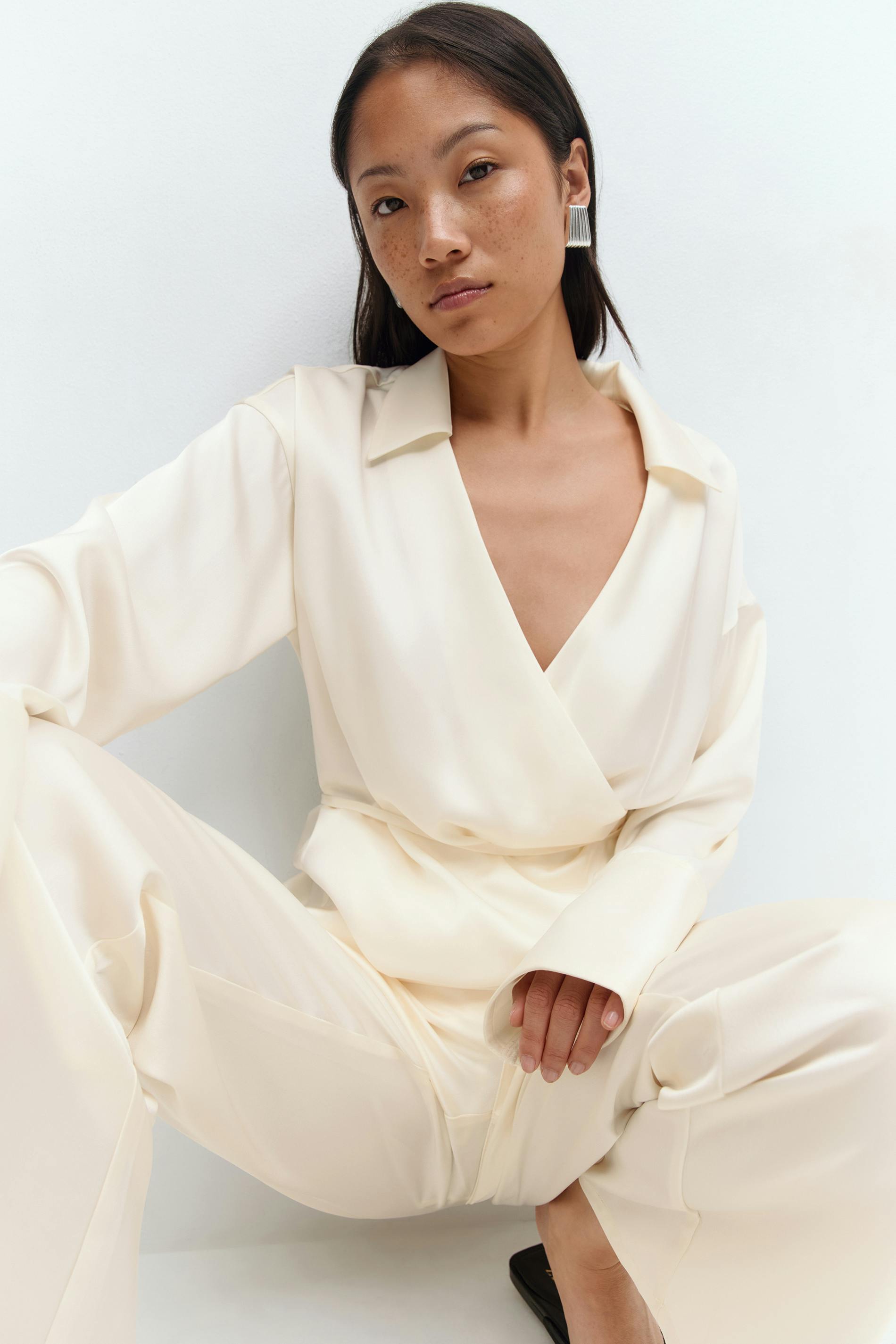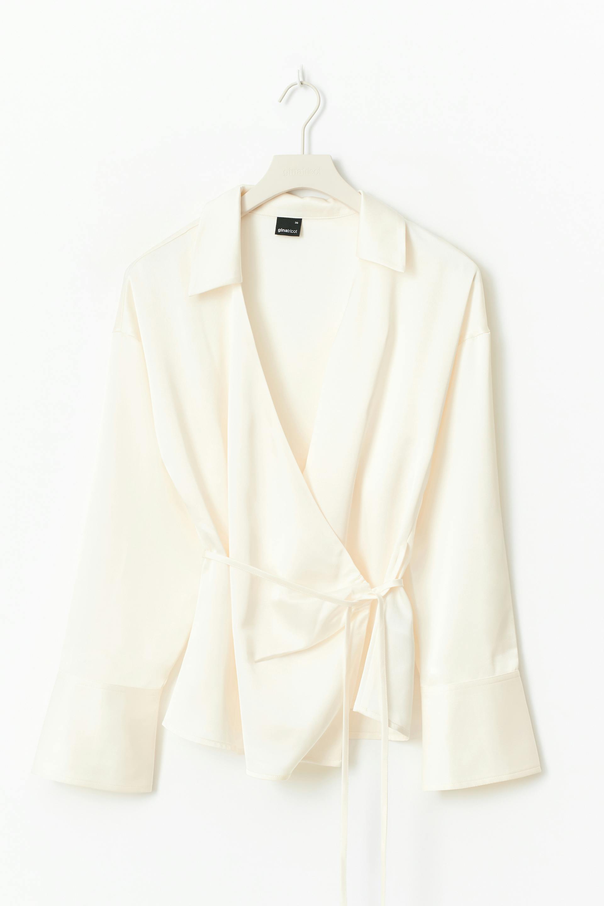 Hemd mit Selbstbindung in der Taille. Das Hemd ist cremefarben und hat Wickel-Design. Es hat V-Ausschnitt, Kragen, normale Passform und langen Ärmel mit Manschette.