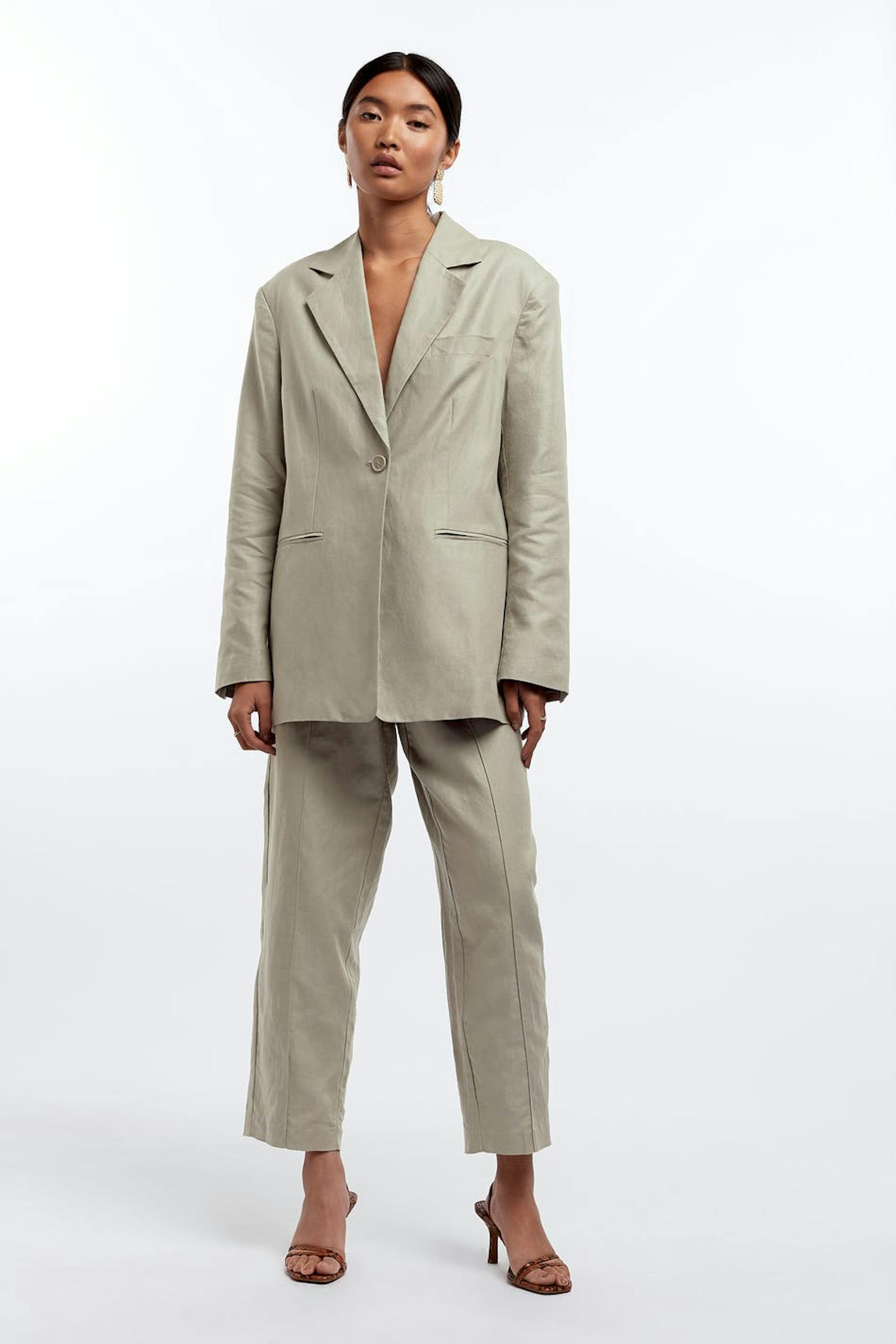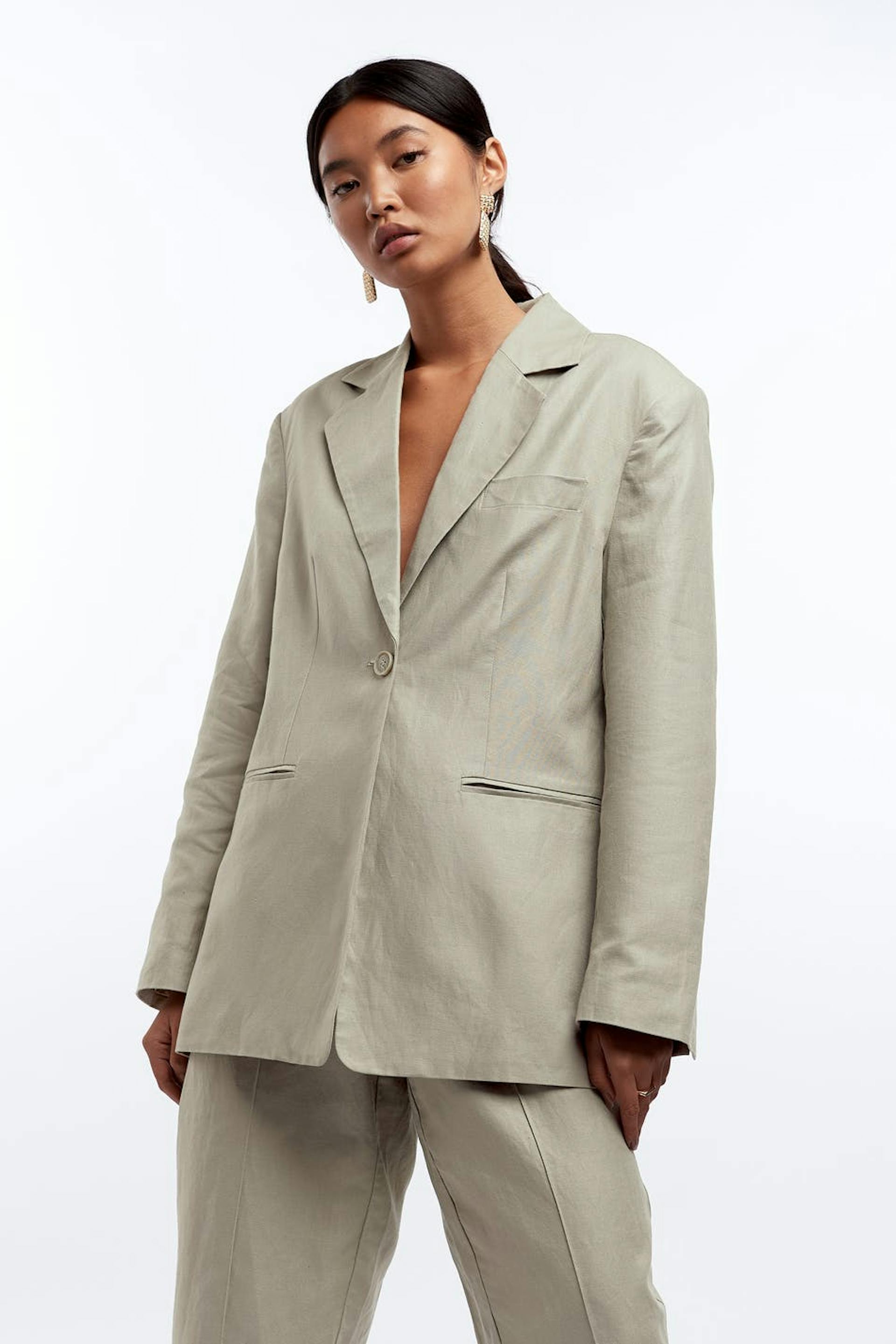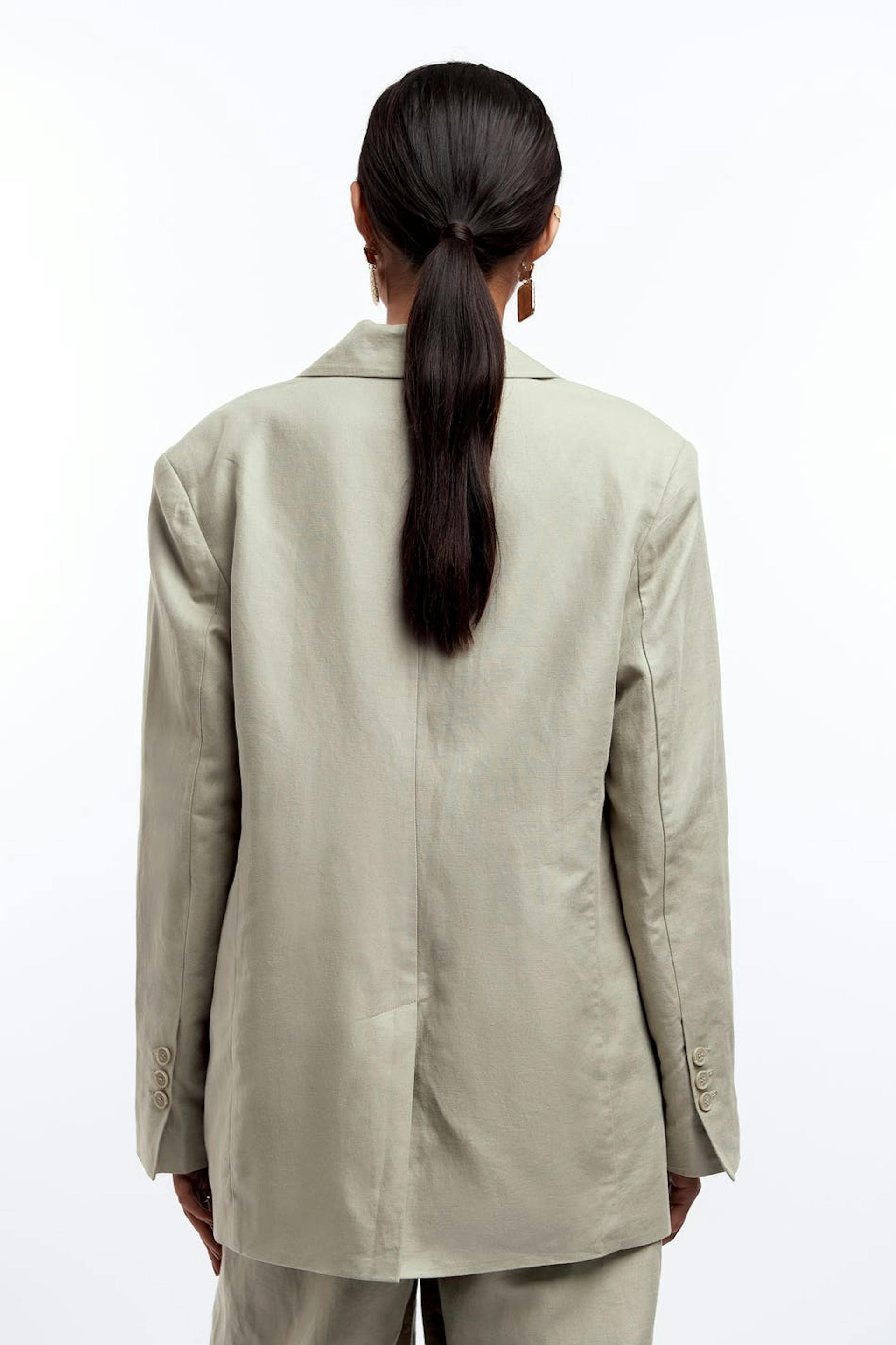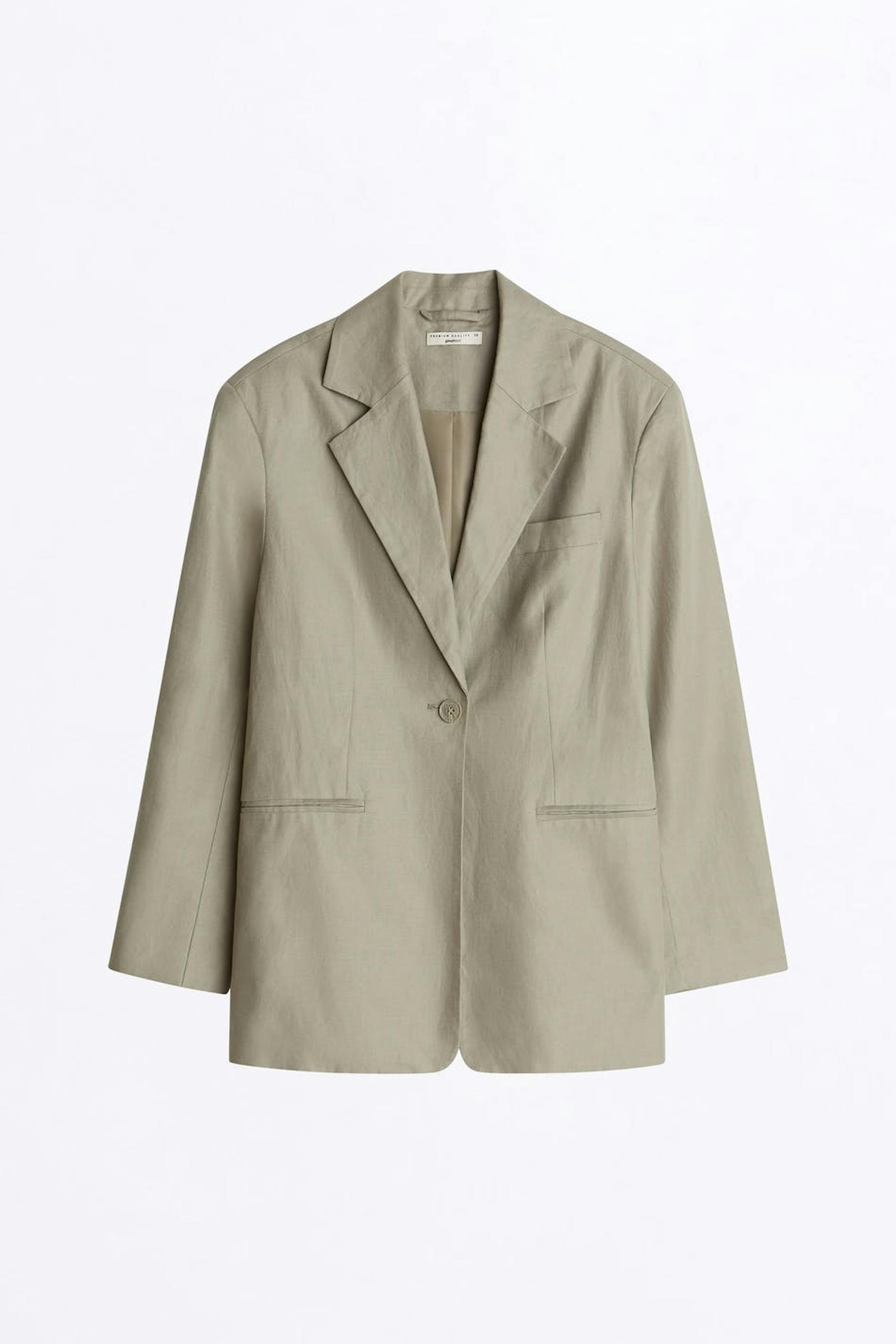 Gerades Sakko. Das Sakko ist beige. Es ist hergestellt aus Leinen und Baumwolle.