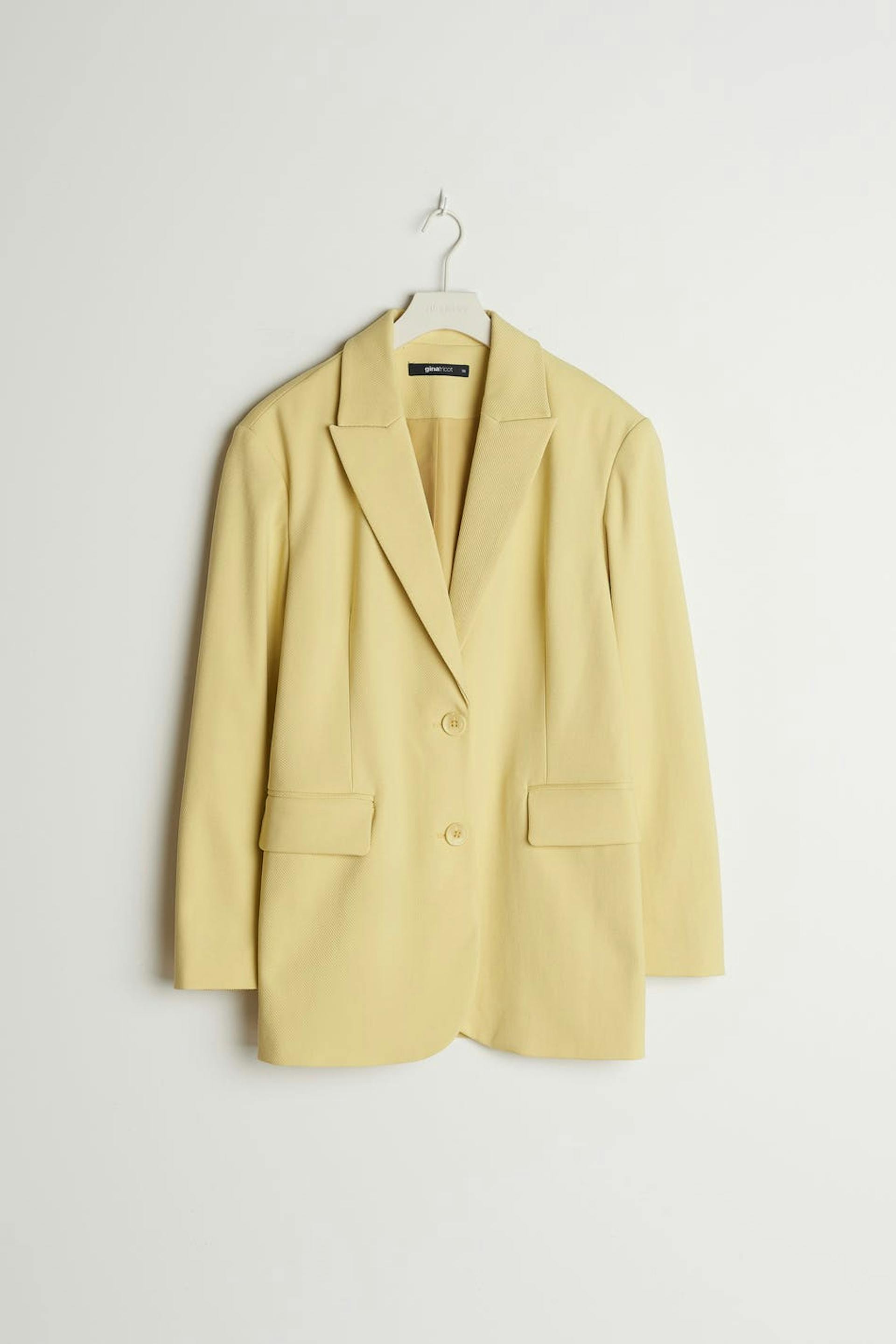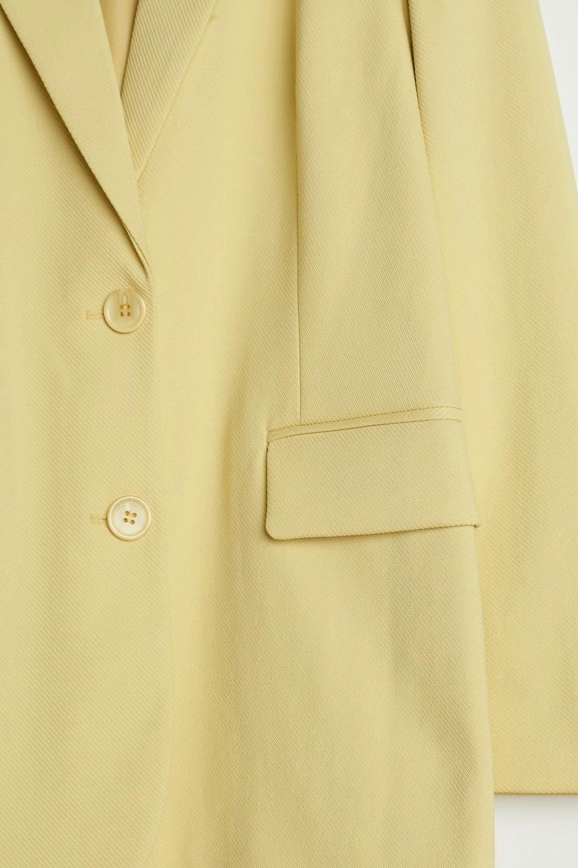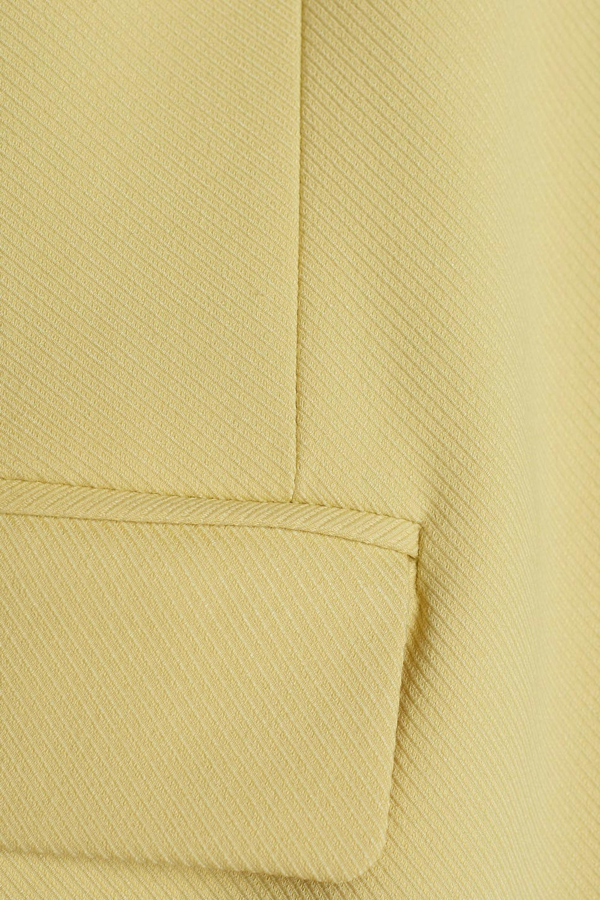 Zugeschnittenes Sakko mit Knopfleiste vorne. Das Sakko ist gelb und hat einen behandelten Stoff. Es hat rahmengenähte Klappentaschen, Knöpfe an den Ärmelenden, klassischen Kragen mit Revers und doppelte Öffnung auf der Rückseite.