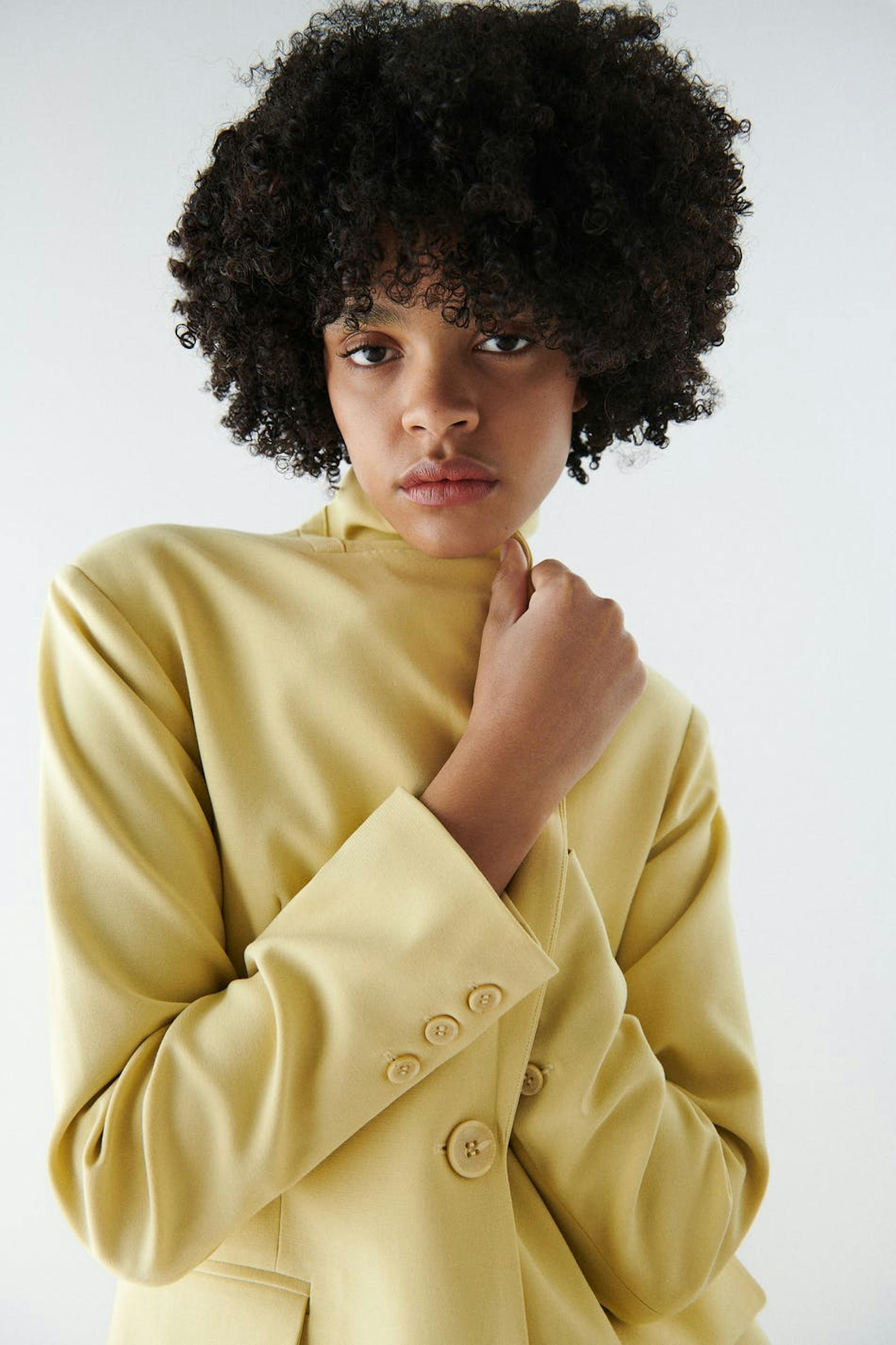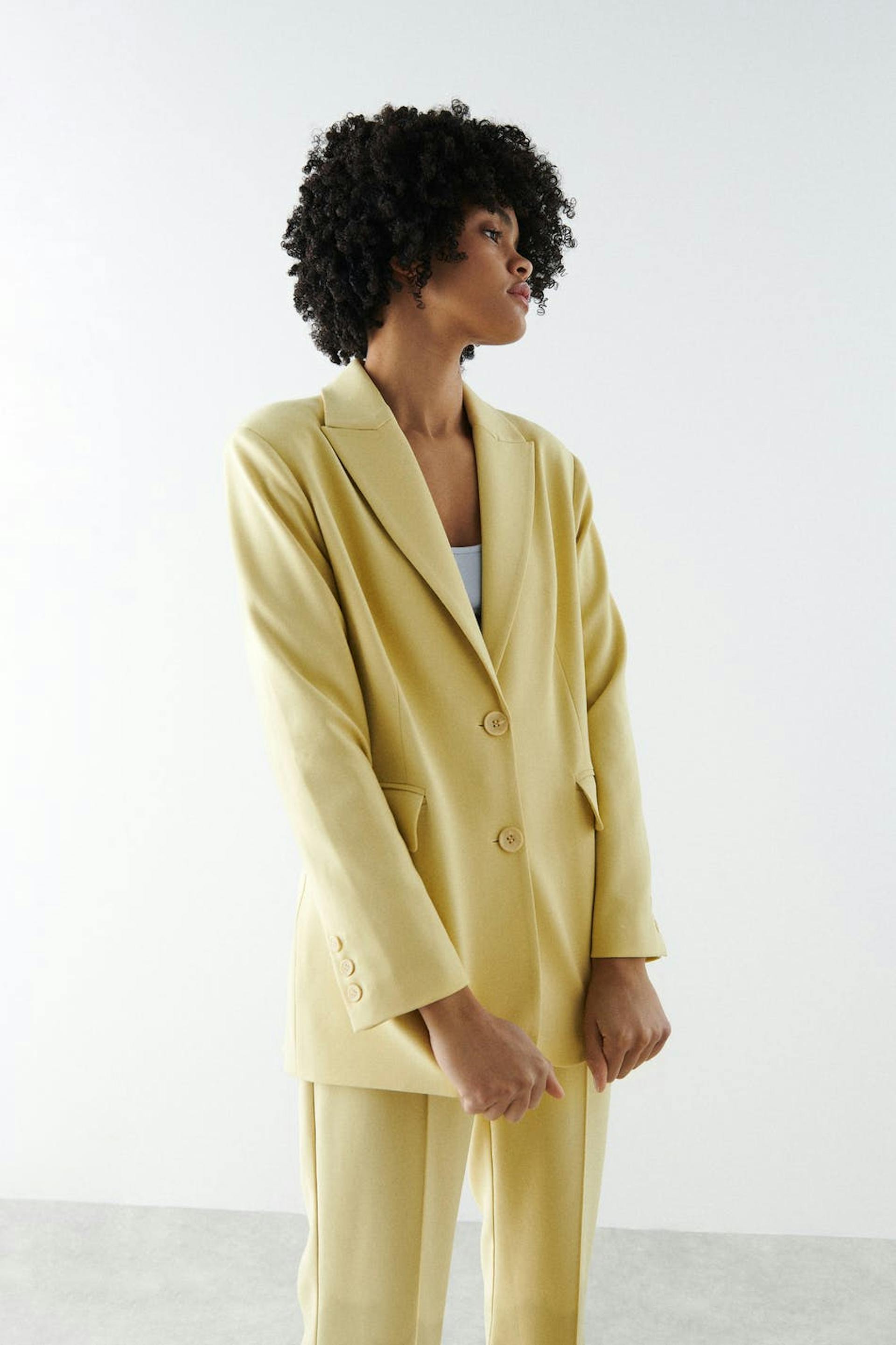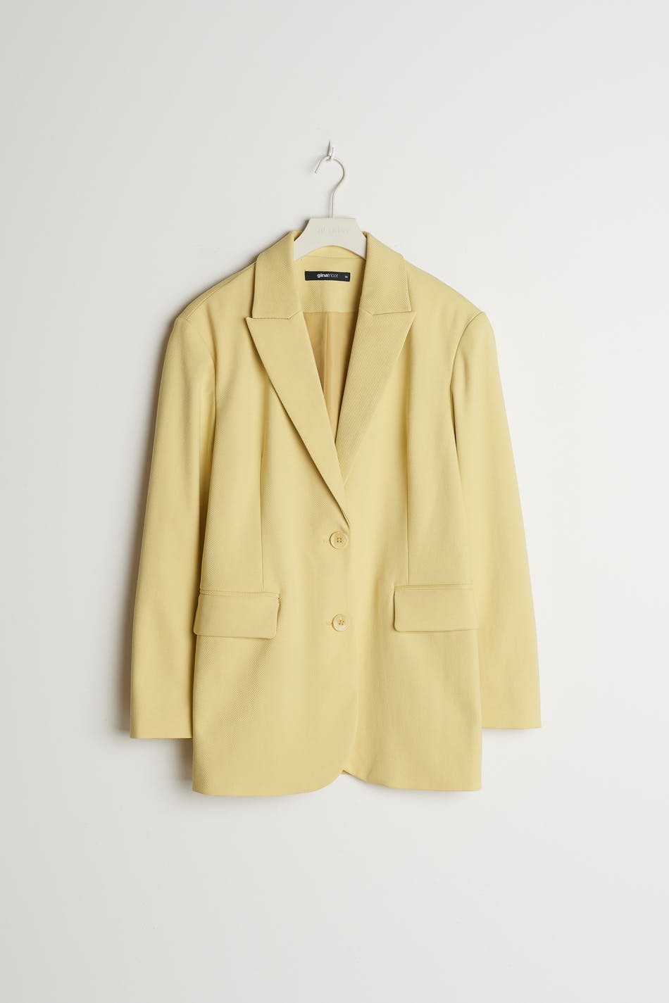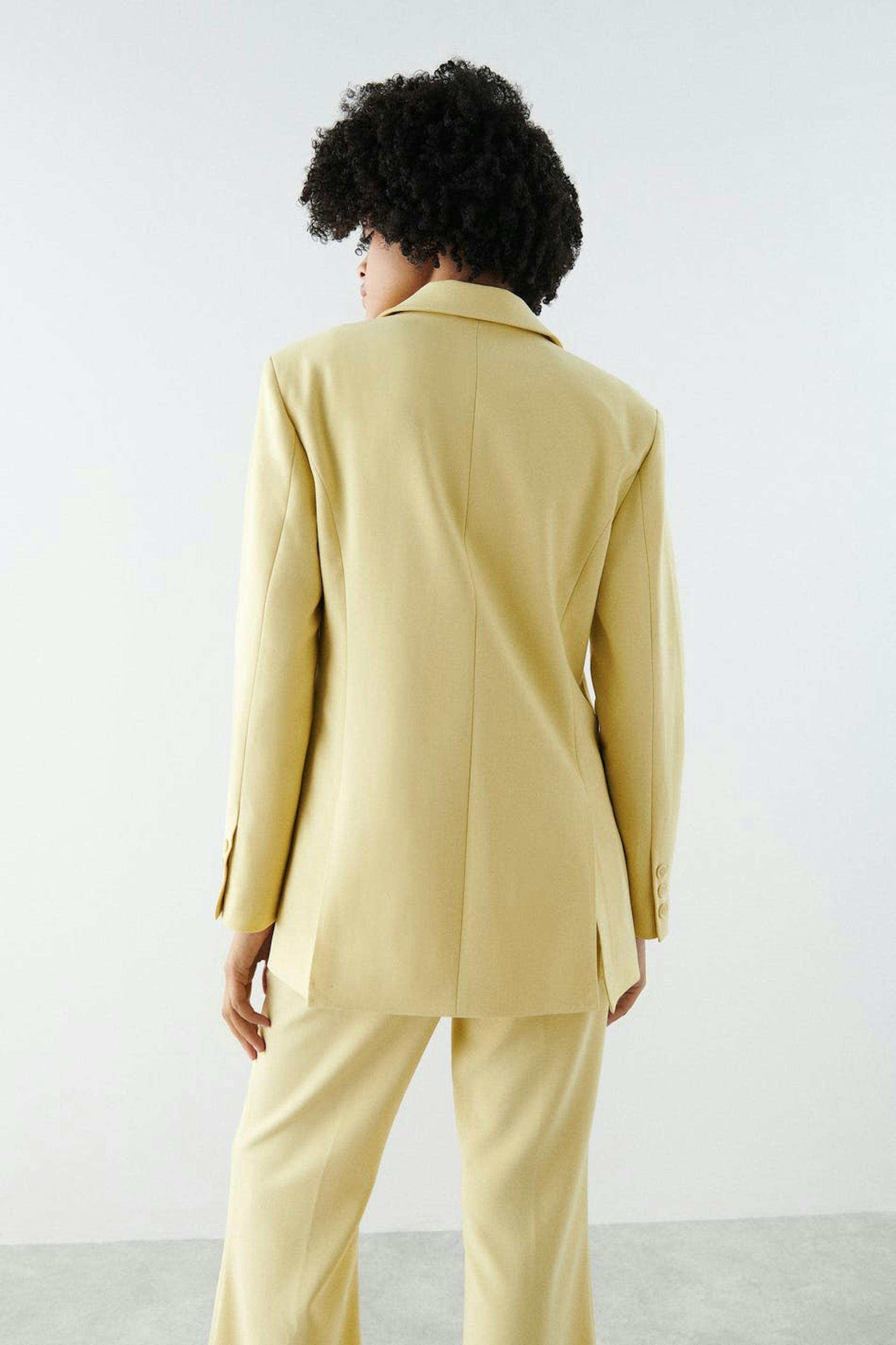 Zugeschnittenes Sakko mit Knopfleiste vorne. Das Sakko ist gelb und hat einen behandelten Stoff. Es hat rahmengenähte Klappentaschen, Knöpfe an den Ärmelenden, klassischen Kragen mit Revers und doppelte Öffnung auf der Rückseite.