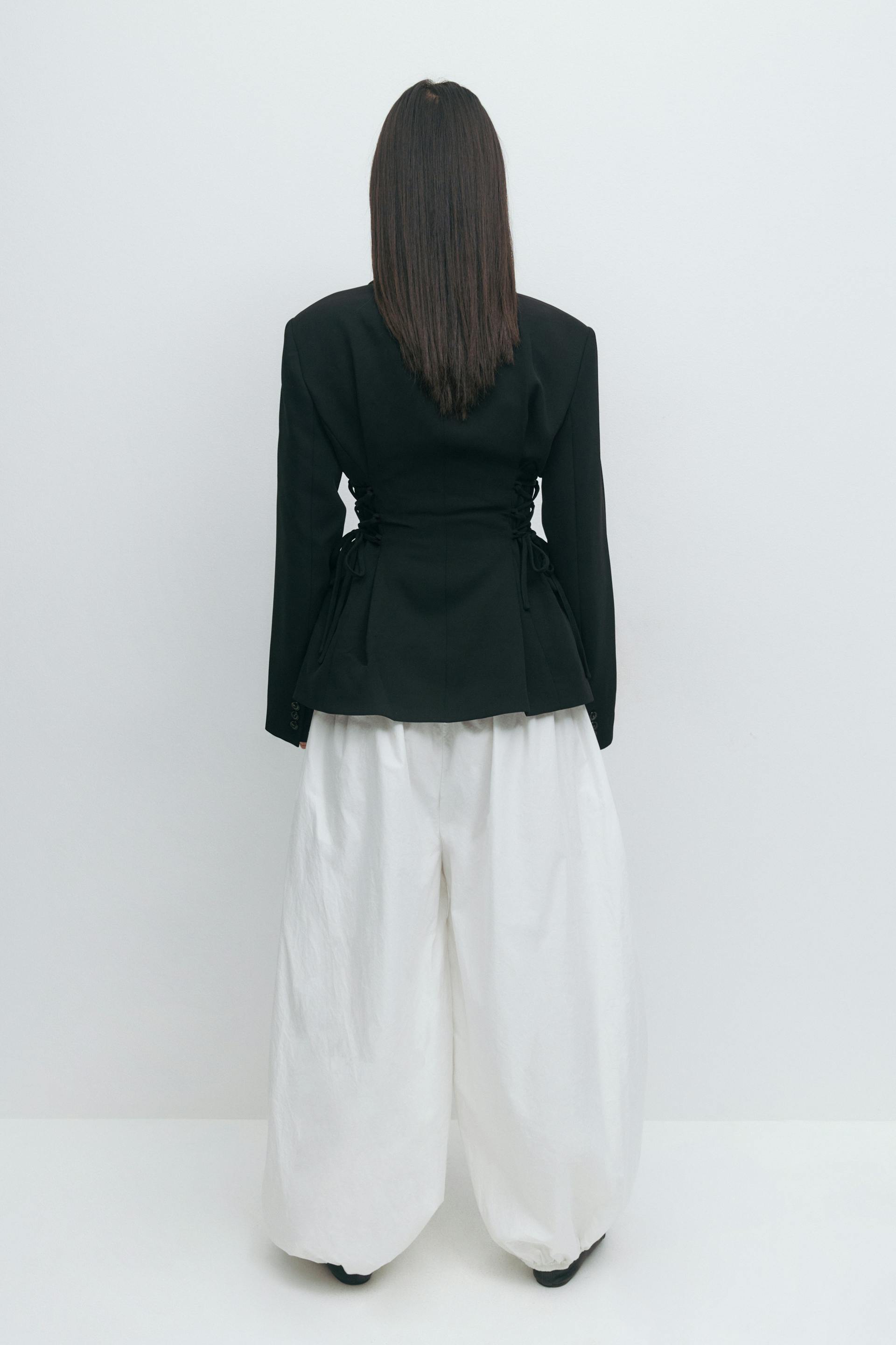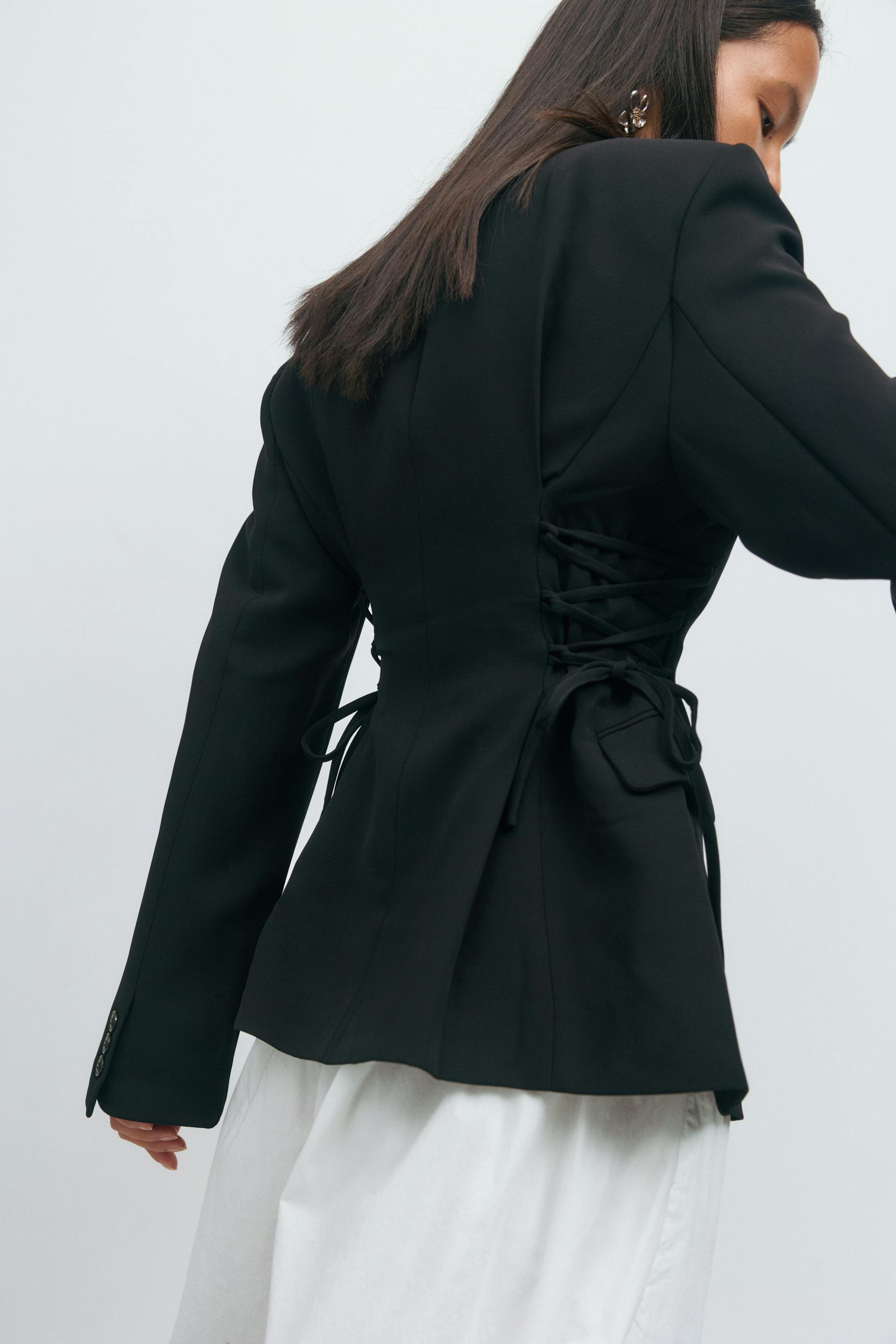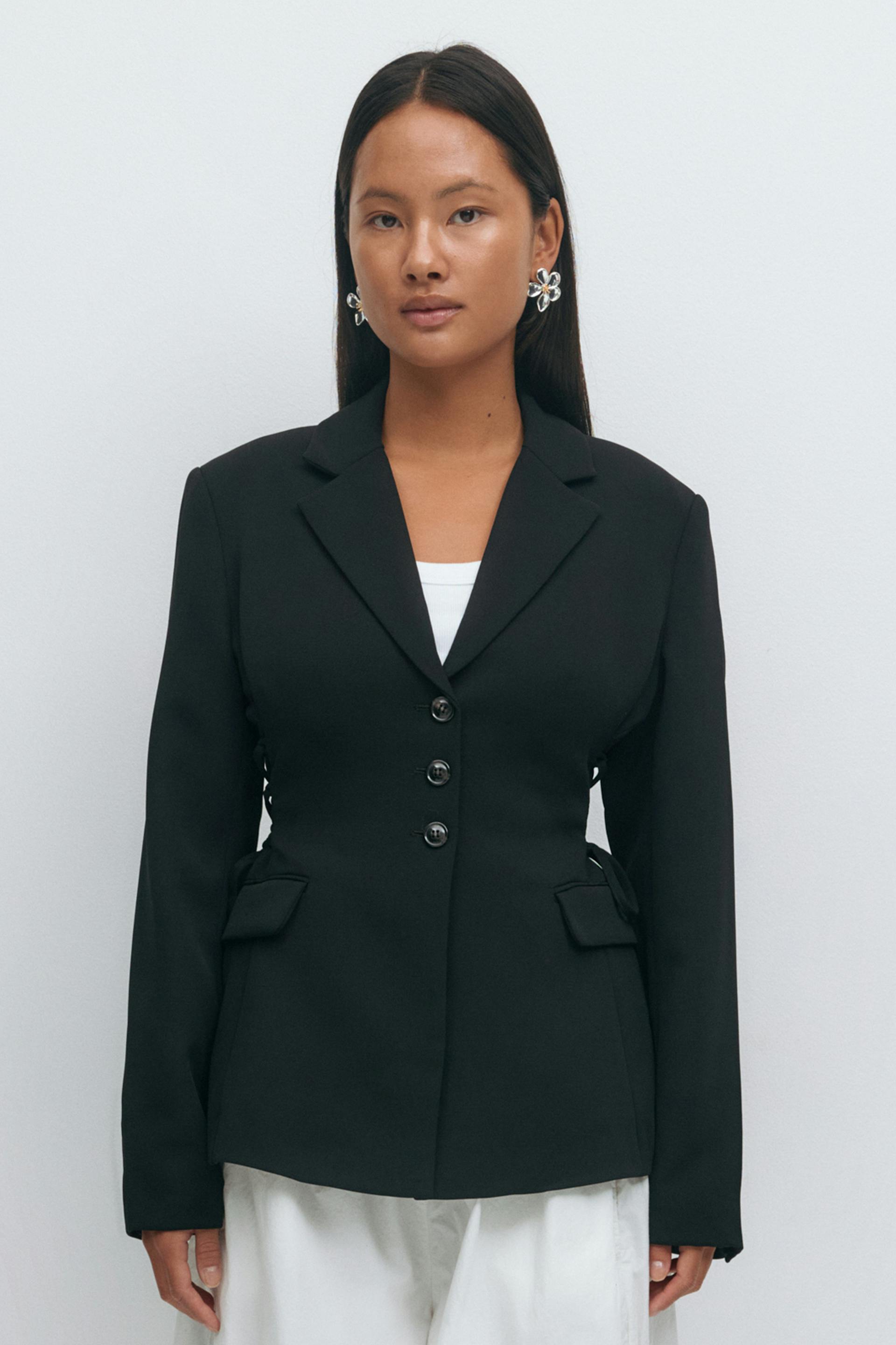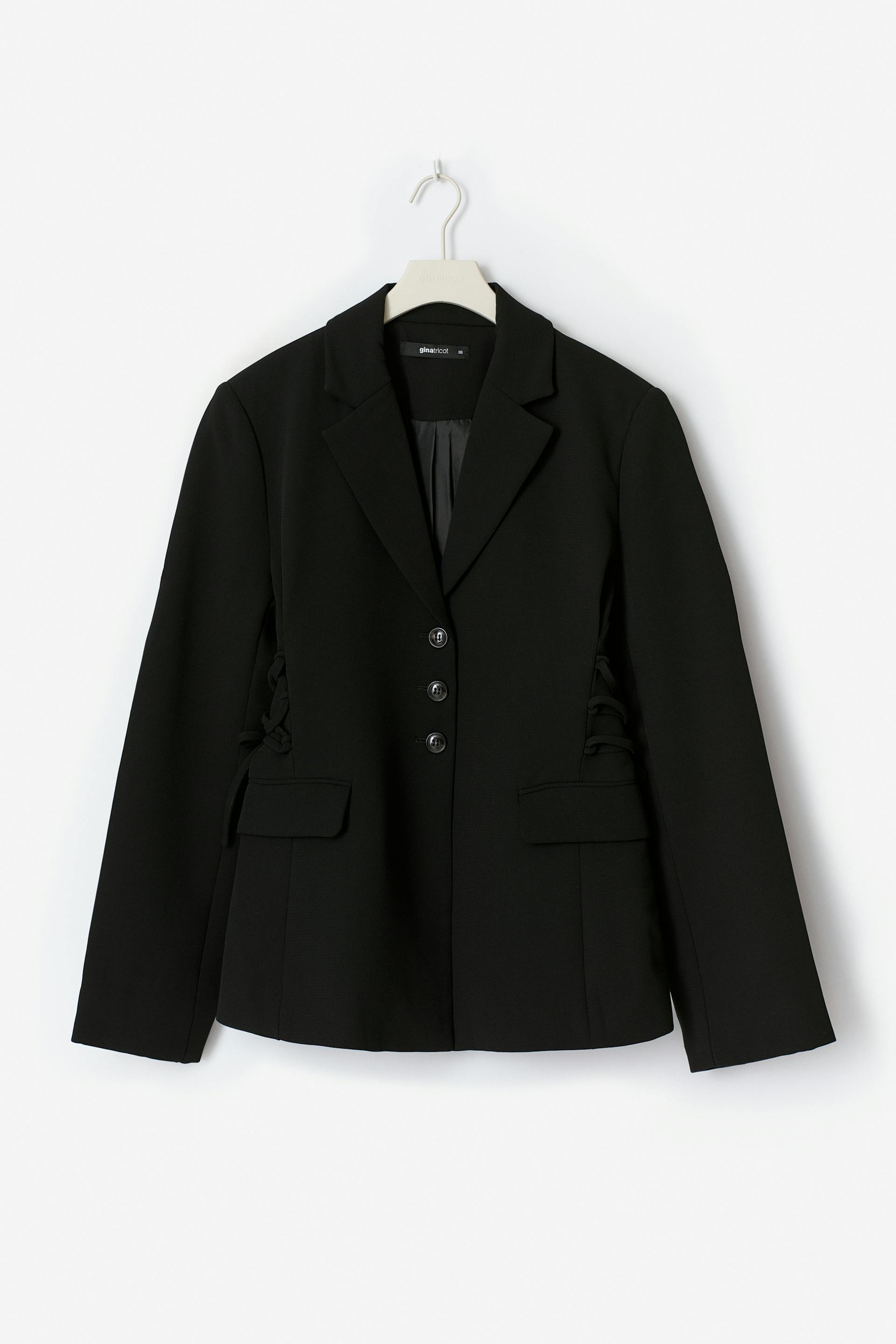 Figurbetontes Sakko mit Schnürung in den Seiten. Die Jacke ist schwarz und hat Knöpfung vorne. Sie hat figurbetonte Passform, Kragen mit Revers, zulaufende Taille, Klappentaschen in den Seiten, lange Ärmel und Knöpfe an den Ärmelenden. Vollständig gefüttert.
