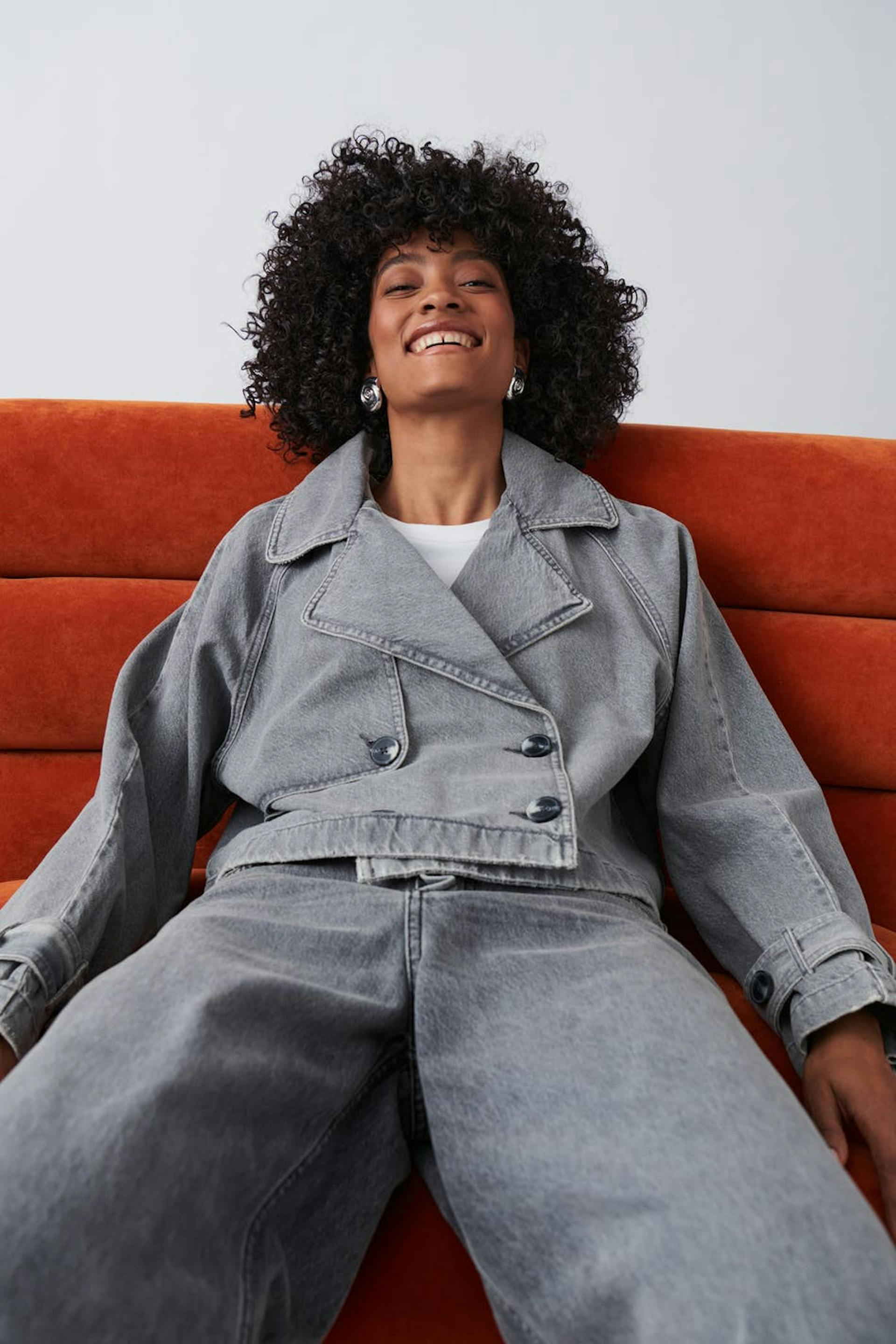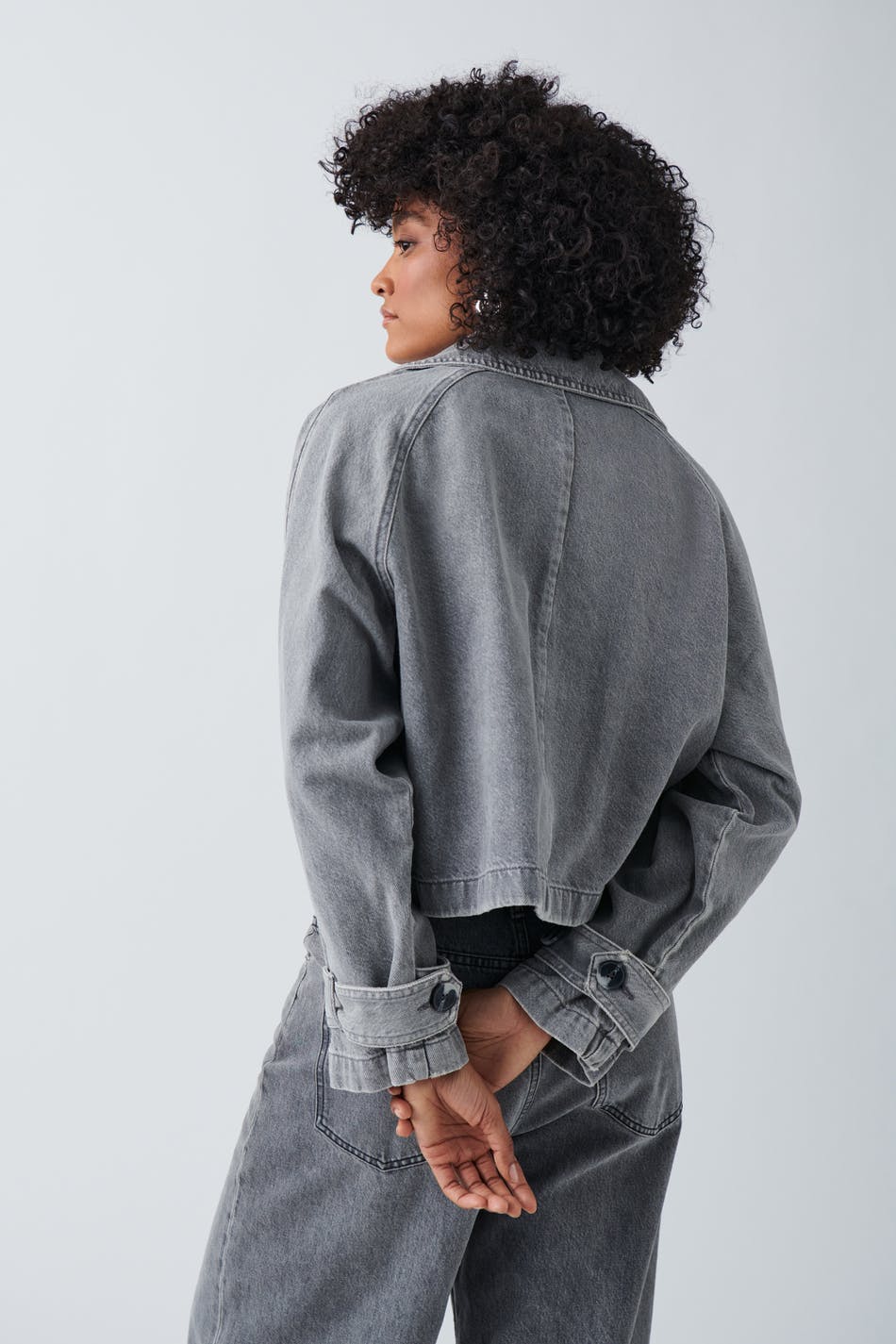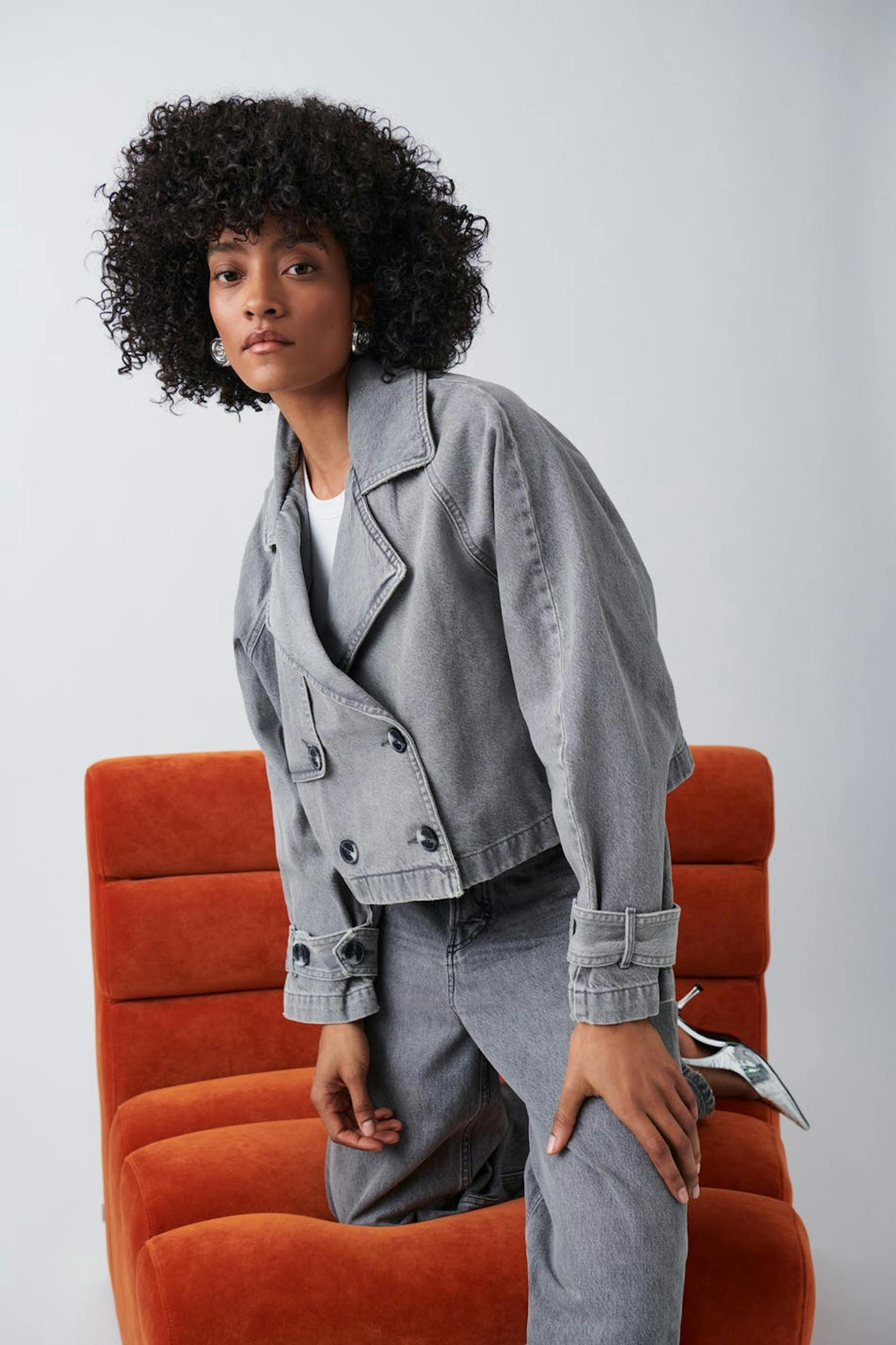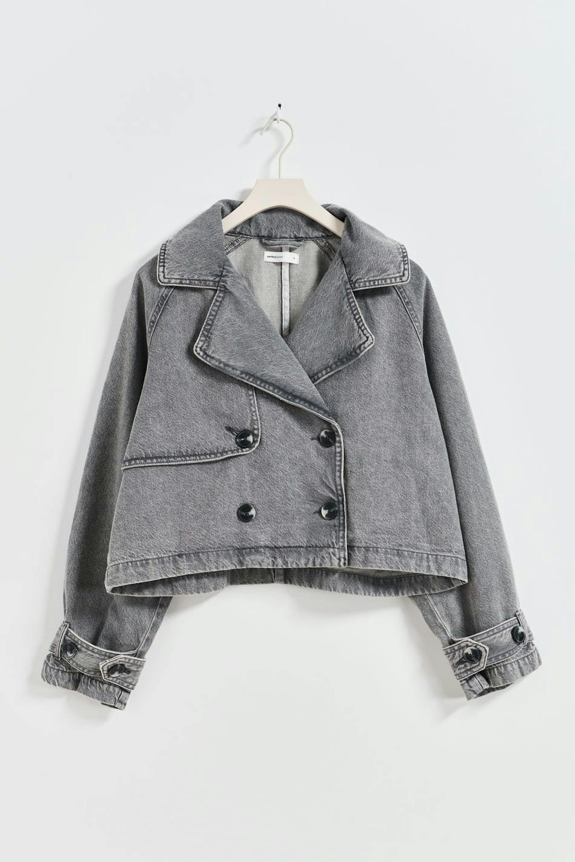 Kurzer Regenmantel aus Denim mit lockerer Passform. Der Mantel ist zweireihig, nicht dehnbar und grau. Er hat Kragen, breite Revers, Knöpfung vorne und einstellbaren Tab an den Ärmelenden.