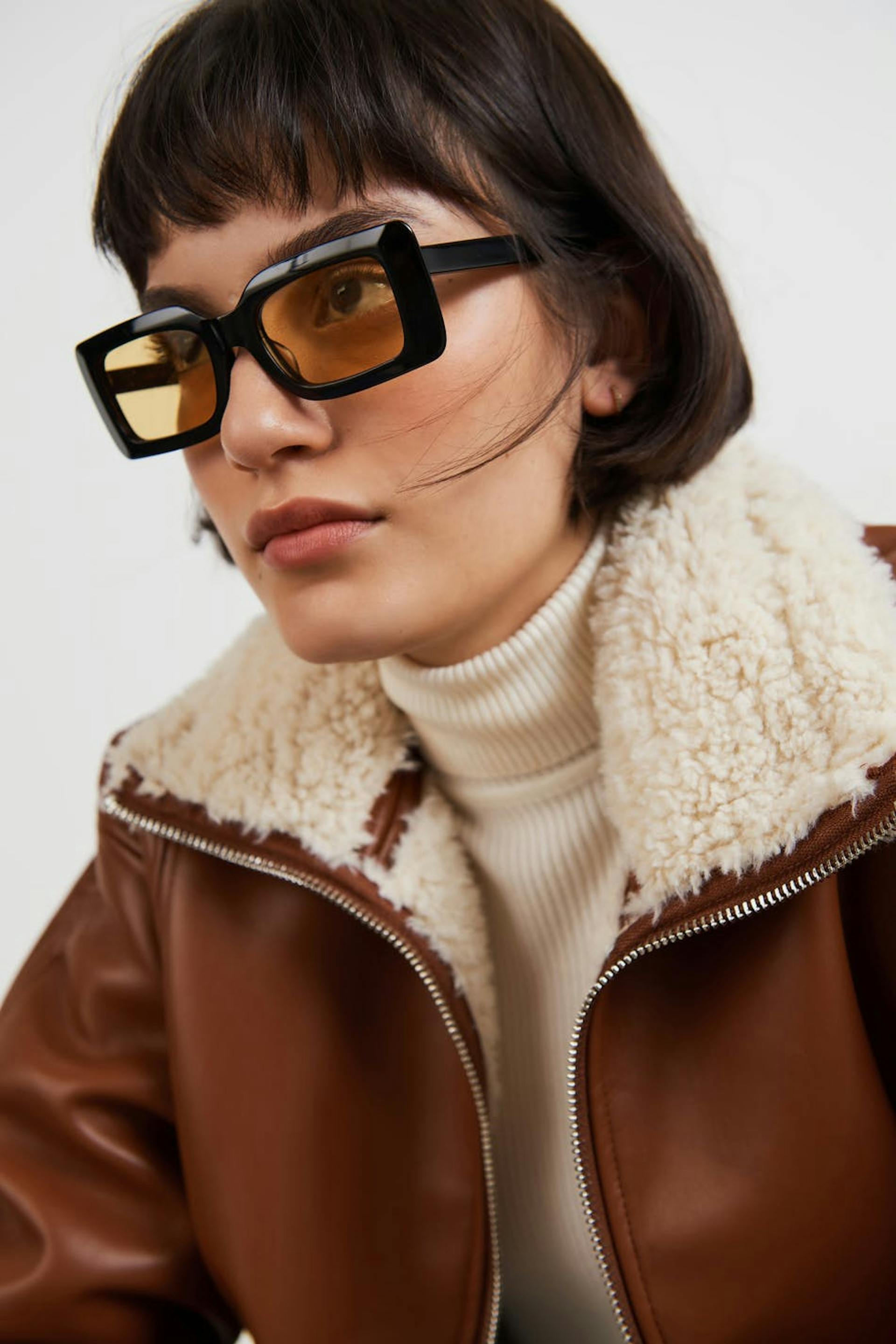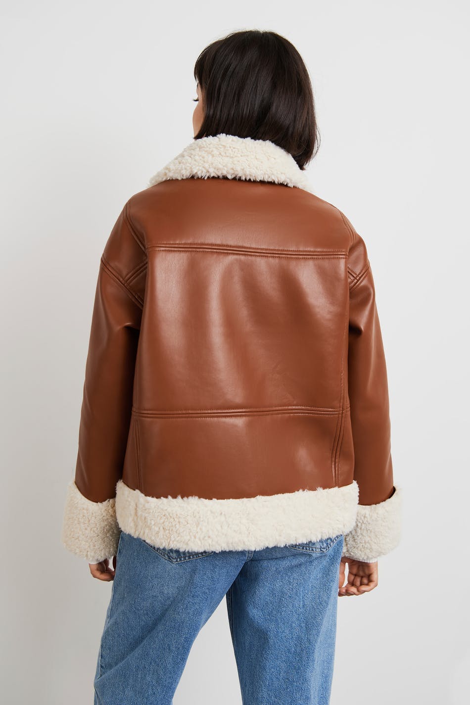 Gefütterte Jacke mit Hoher Kragen. Die Jacke ist braun und hat ein Kunstleder-Material. Sie hat einen Reißverschluss vorne, Taschen auf den Seiten und Details mit einem Teddy-Material unten und an den Ärmeln.