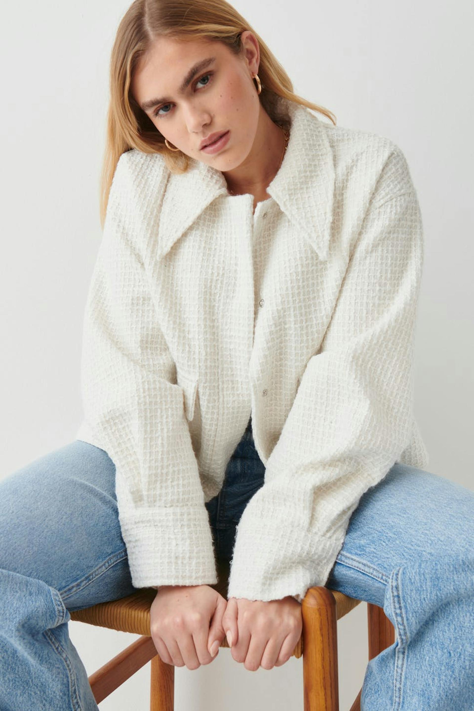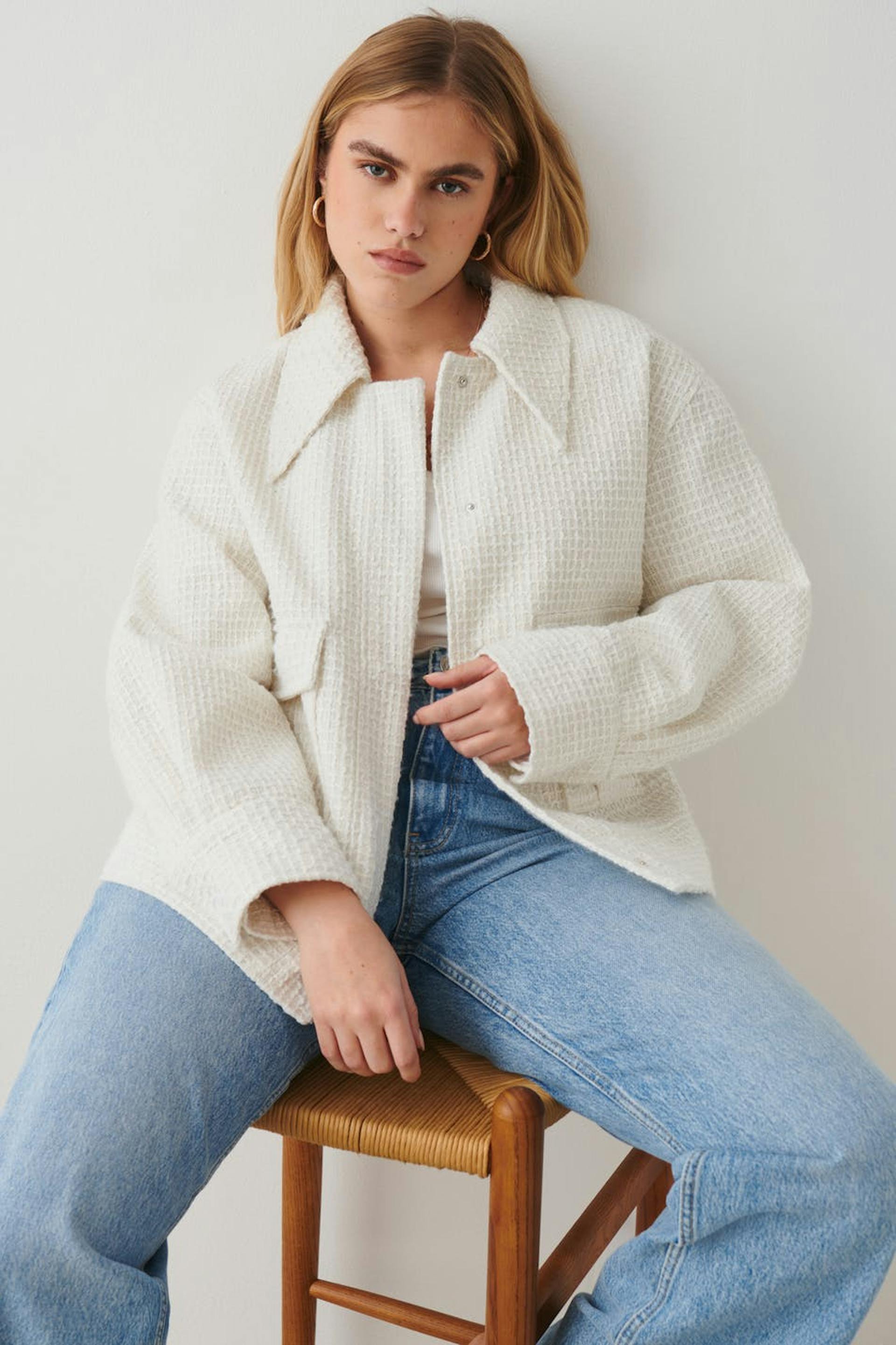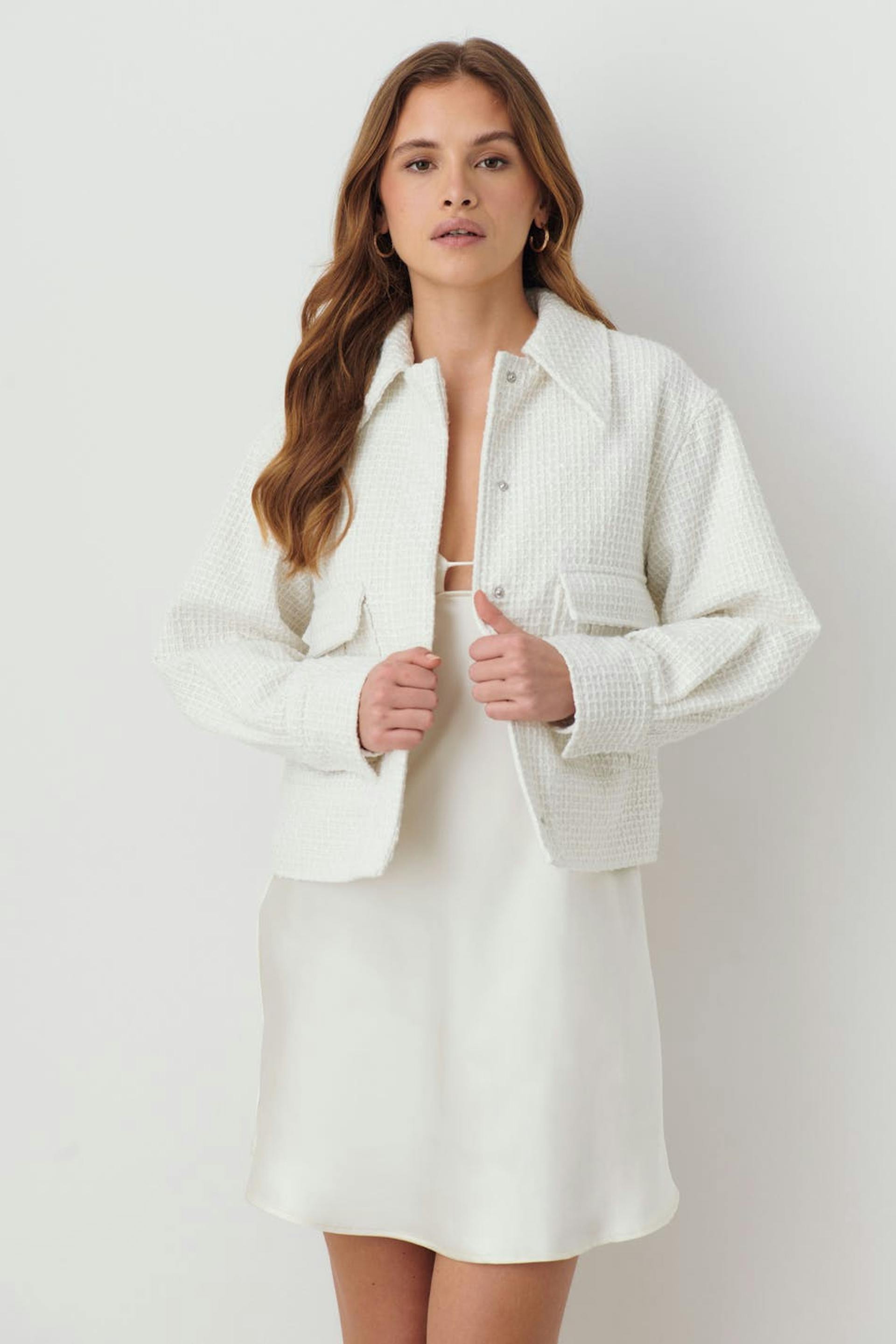 Jacke aus Tweed mit weit-geschnittenen Style. Die Jacke ist weiβ und hat verdeckten Druckknopfverschluss vorne. Sie hat Kragen und große Klappentaschen.