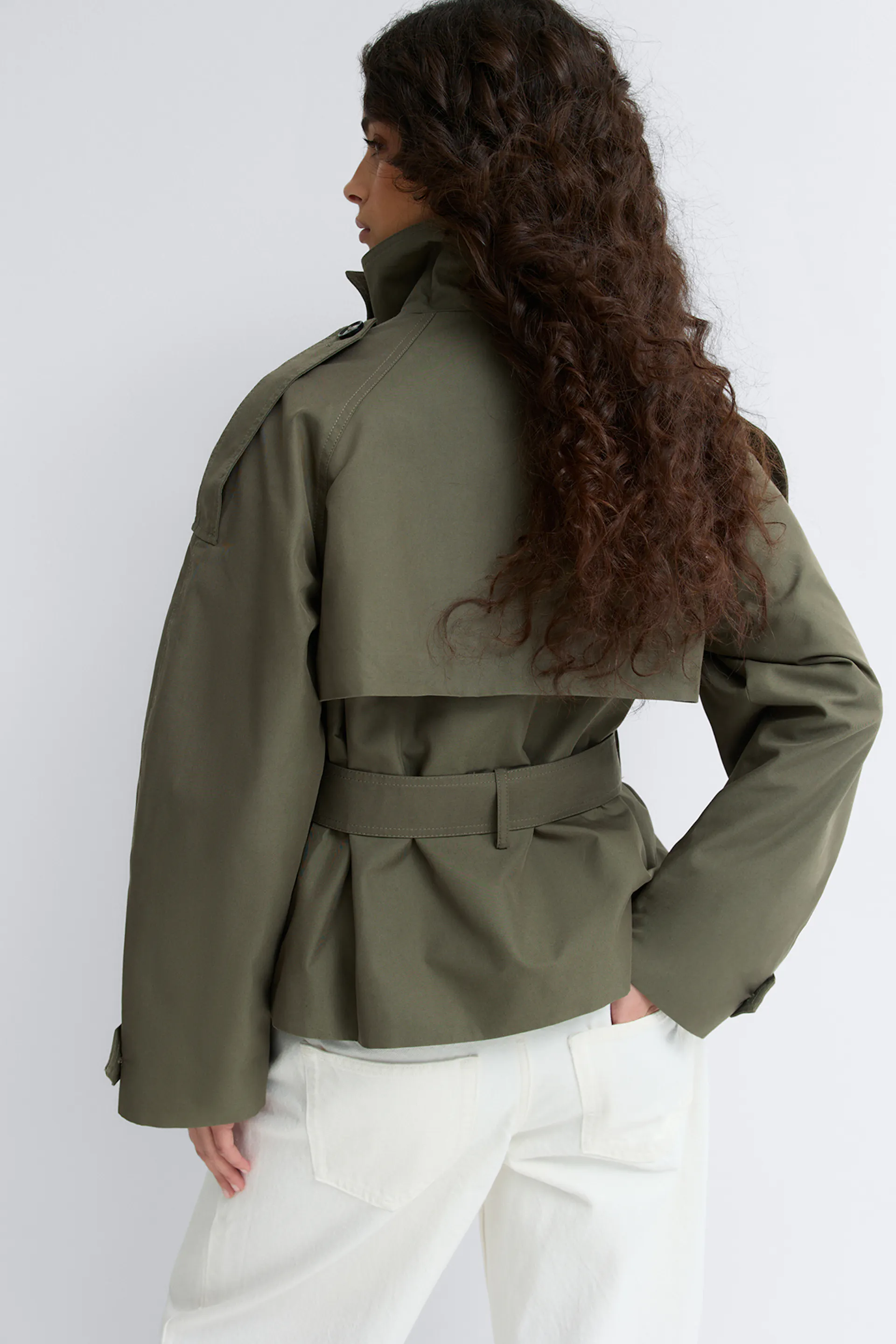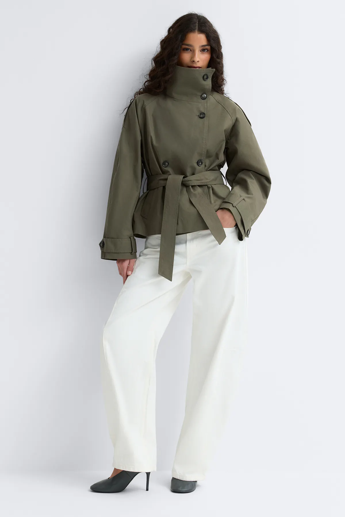 Olivgrüner Trenchcoat mit hohem, geknöpftem Stehkragen, Schulterklappen, verstellbaren Gürtelmanschetten und Taillengürtel, kombiniert mit einer weißen Hose.