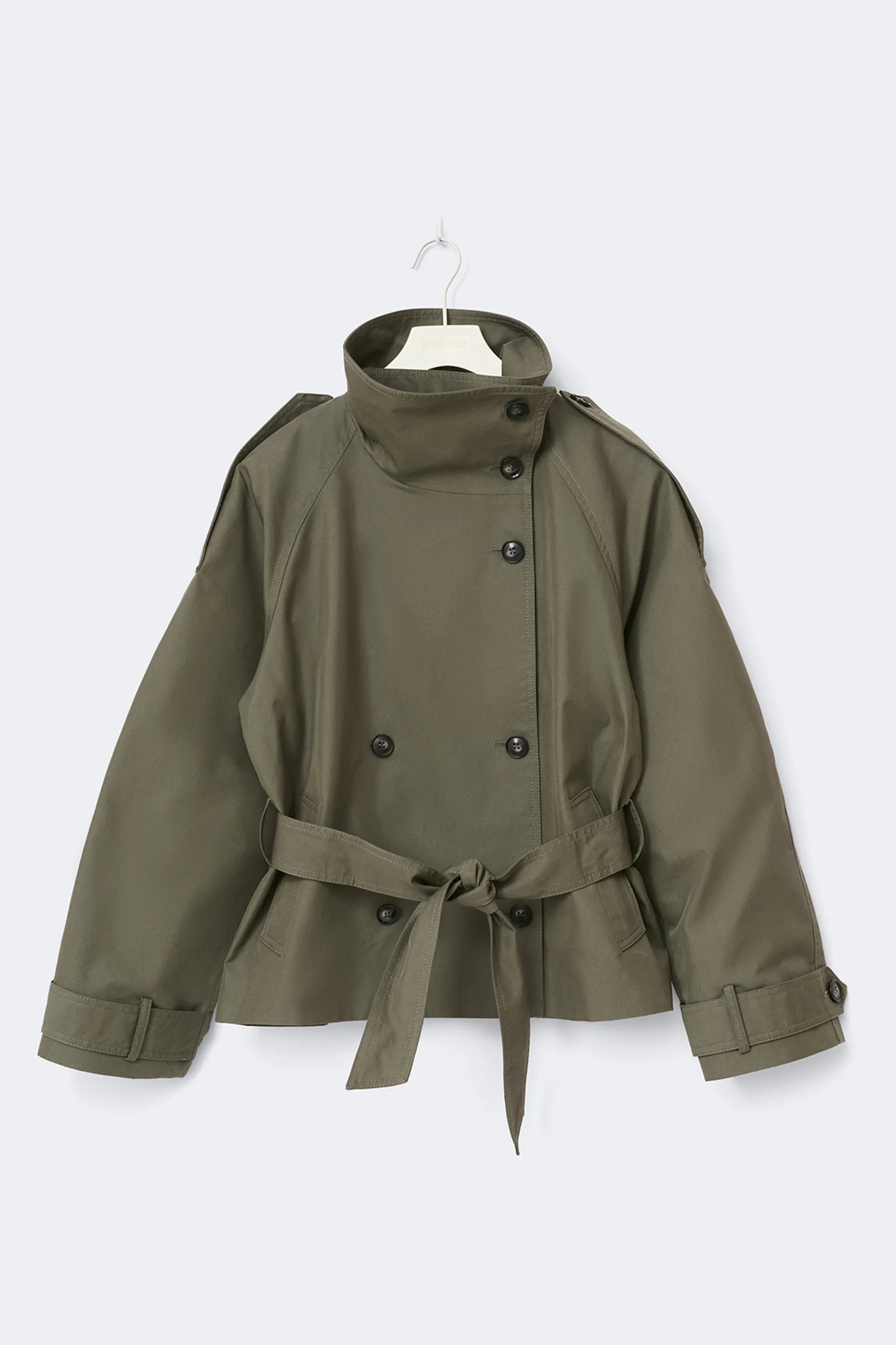 Kurzer Regenmantel mit Hoher Kragen. Der Mantel ist grün und hat lange Raglanärmel mit verstellbarem Riemchen an den Ärmelenden. Er hat großzügige Passform, Knopfverschluss, Schulterklappen, Gürtel in der Taille, Taschen in den Seiten und vollständig gefütterte Innenseite aus 100% recyceltem Polyester.