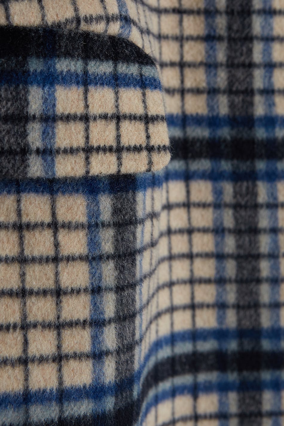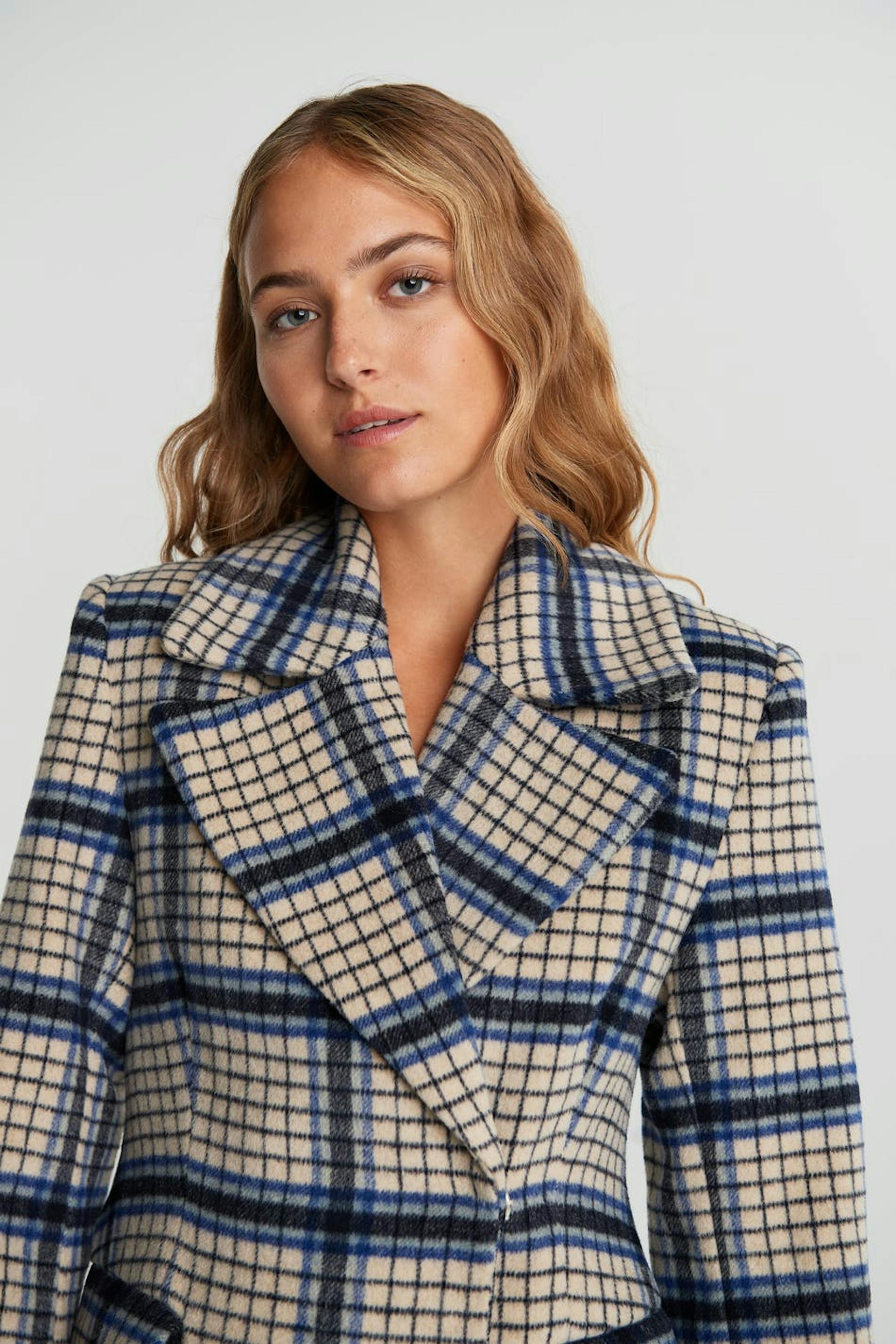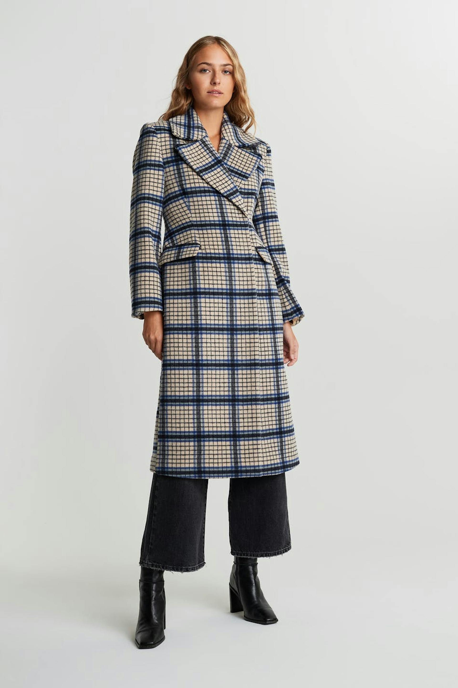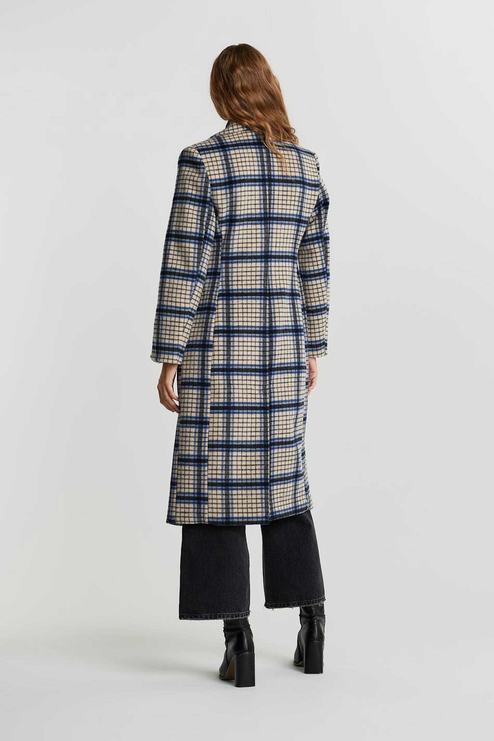 Kariert Mantel mit definierten Schultern. Der Mantel ist beige, blau und langwierig. Er ist hergestellt aus Wollmischung und hat eine schmale Taille, geformten Ärmel, Taschen vorne und einen verdeckten Druckknopfverschluss.