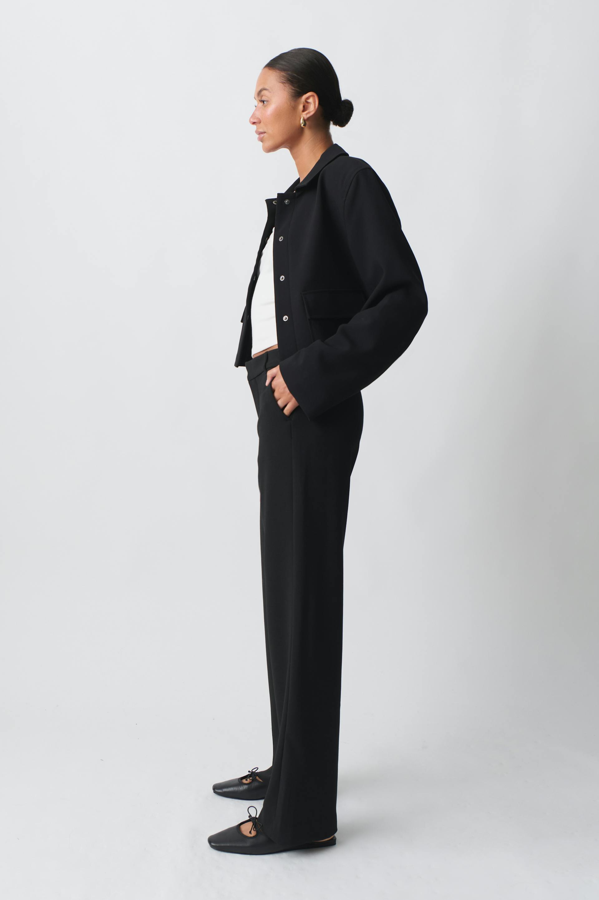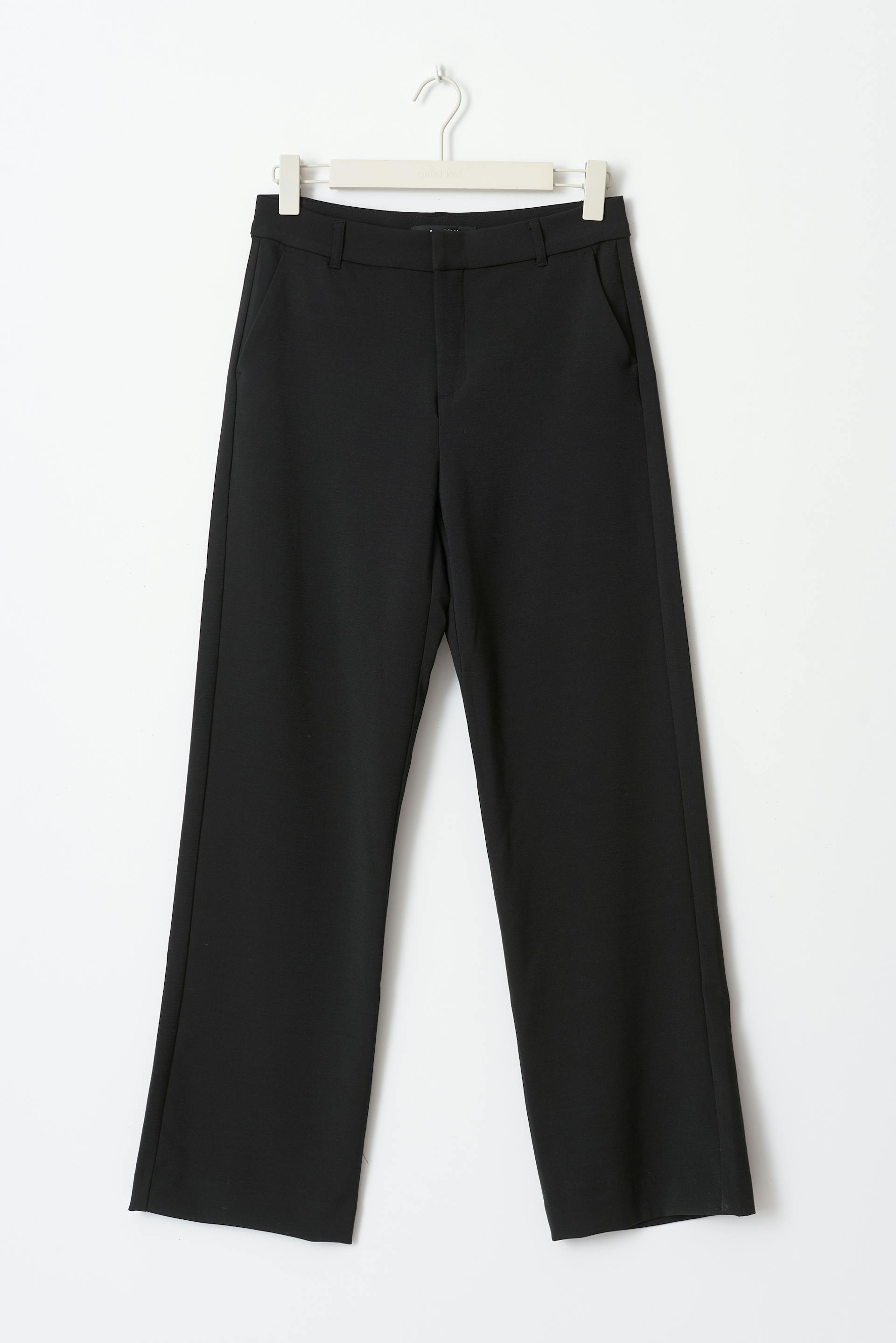 Hosen mit geradem Schnitt. Die Hosen sind schwarz und haben Taschen in den Seiten. Sie haben Reißverschluss und Haken- und Ösenverschluss.