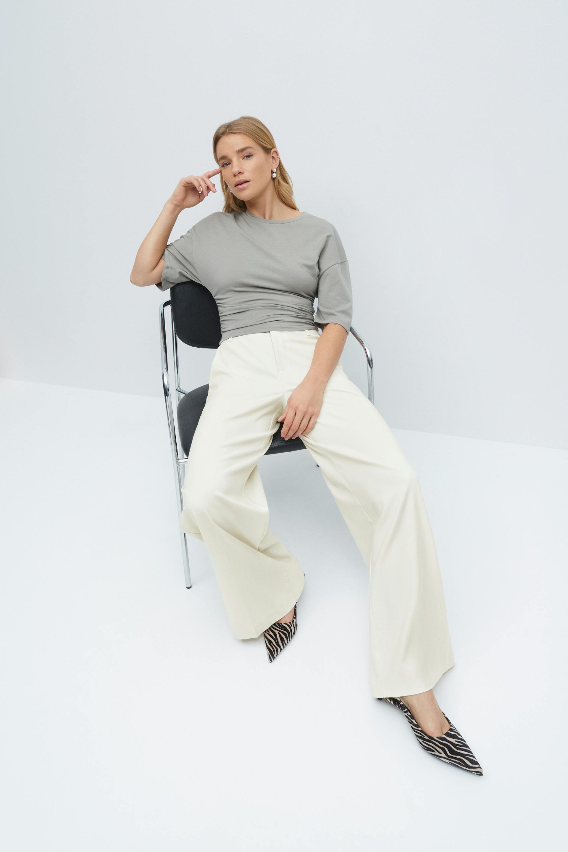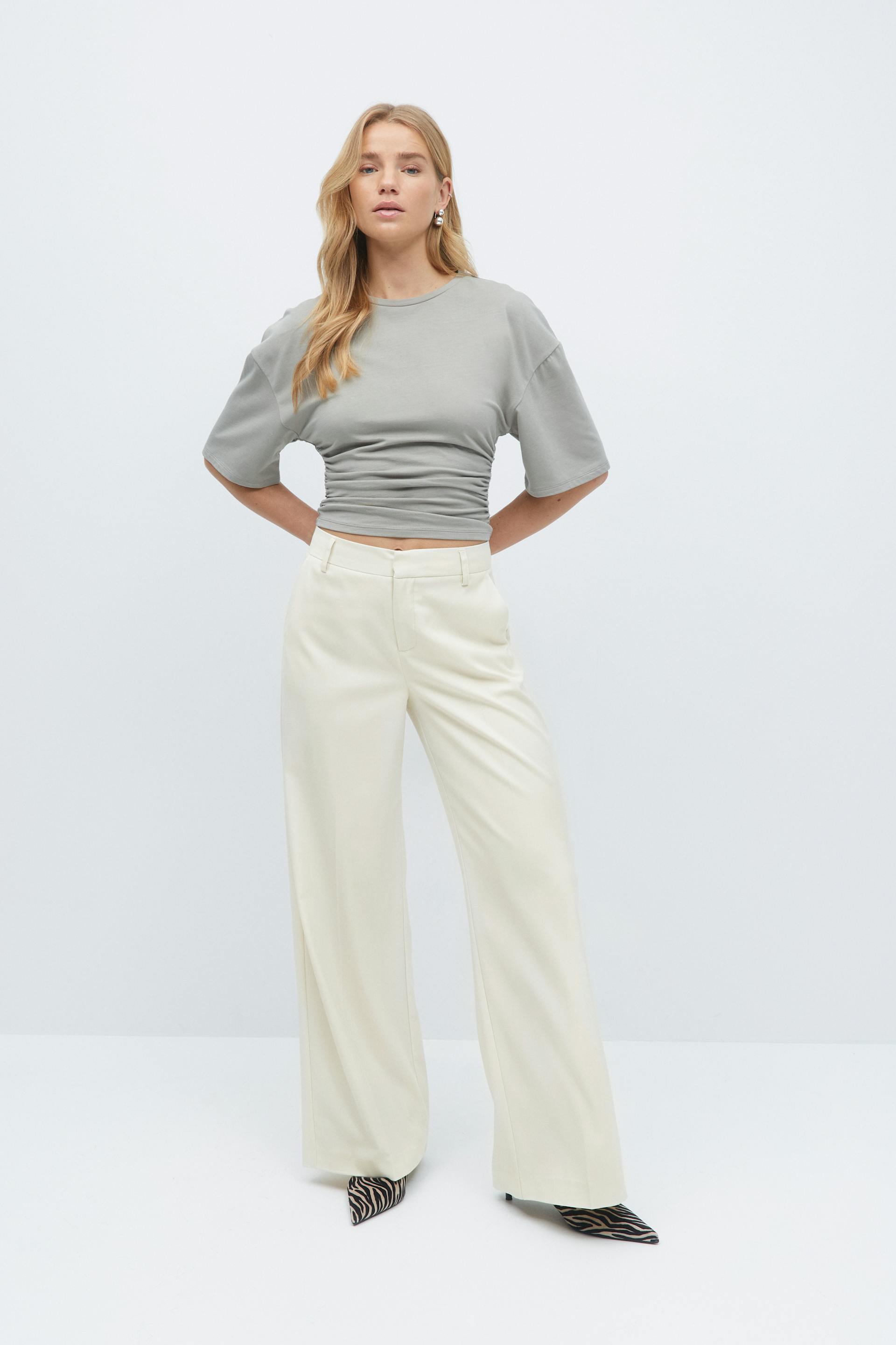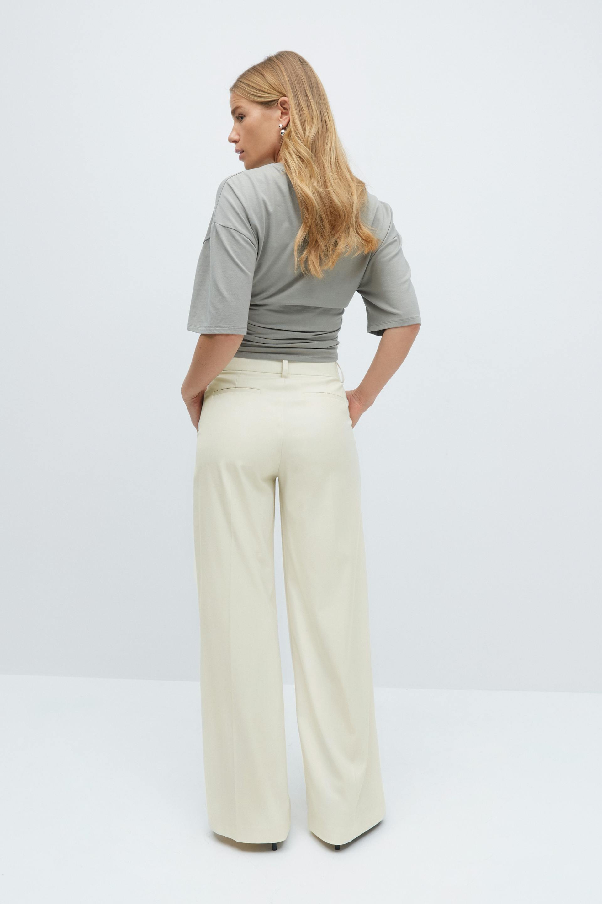 Breite Anzughosen mit Knitterfalten vorne. Die Hosen sind beige und haben Taschen in den Seiten. Sie haben Reißverschluss und Gürtelschlaufen.
