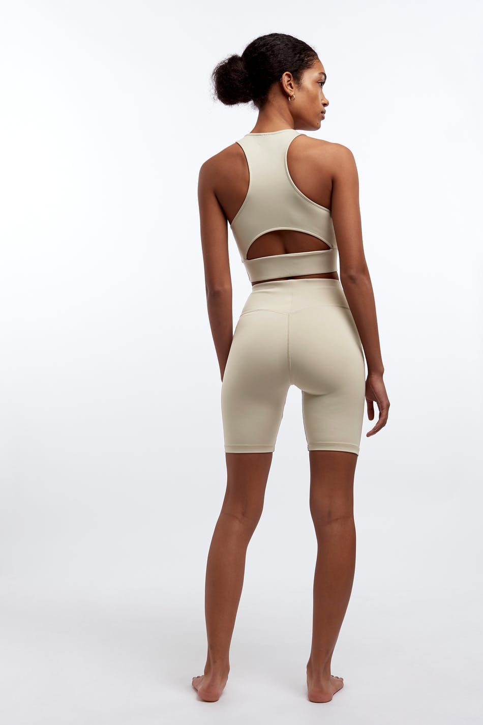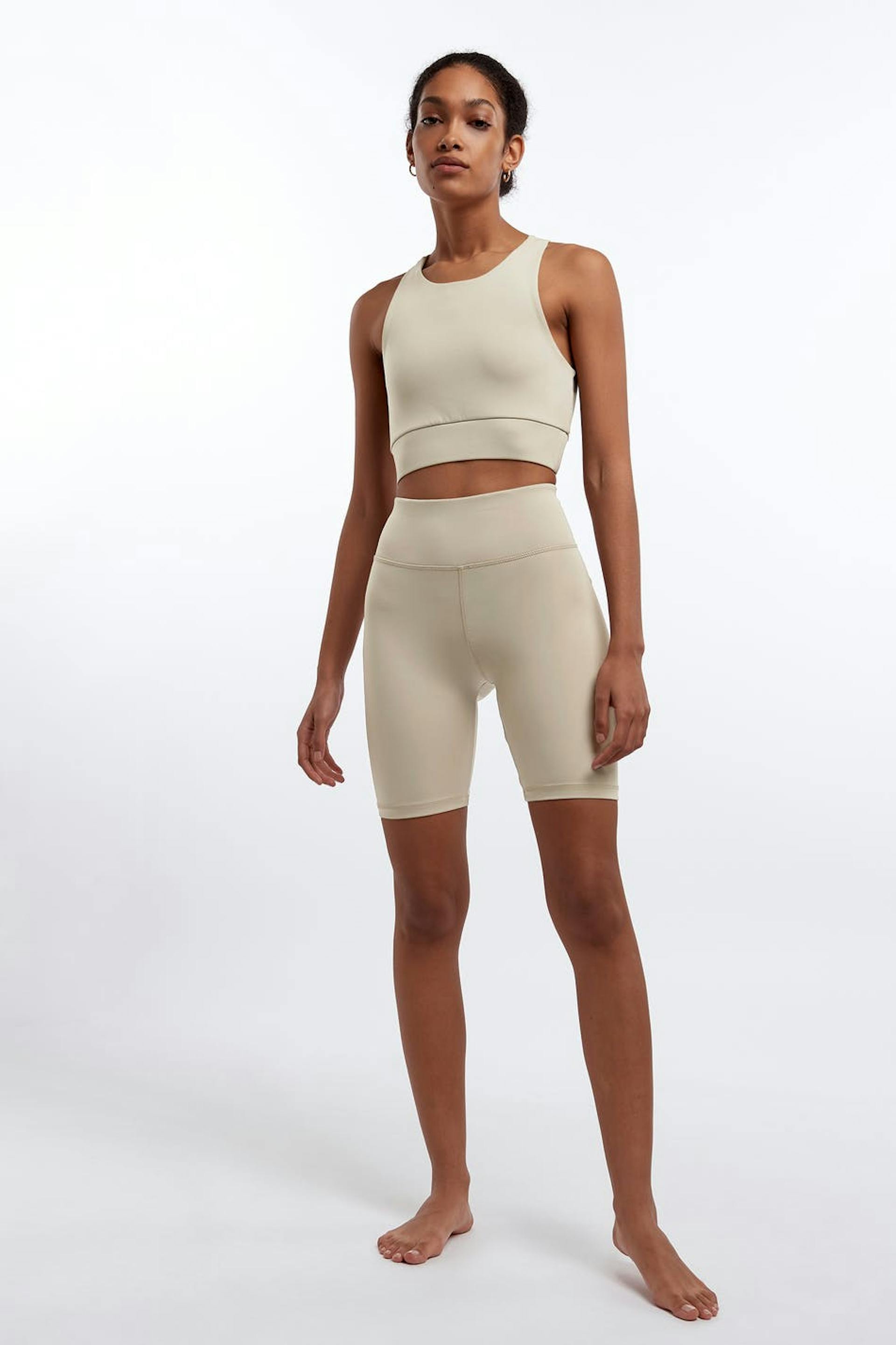 Bikershorts mit einer taillierten Passform. Die Shorts sind beige und haben einen hohen Bund. Sie haben ein Gummiband in der Taille.