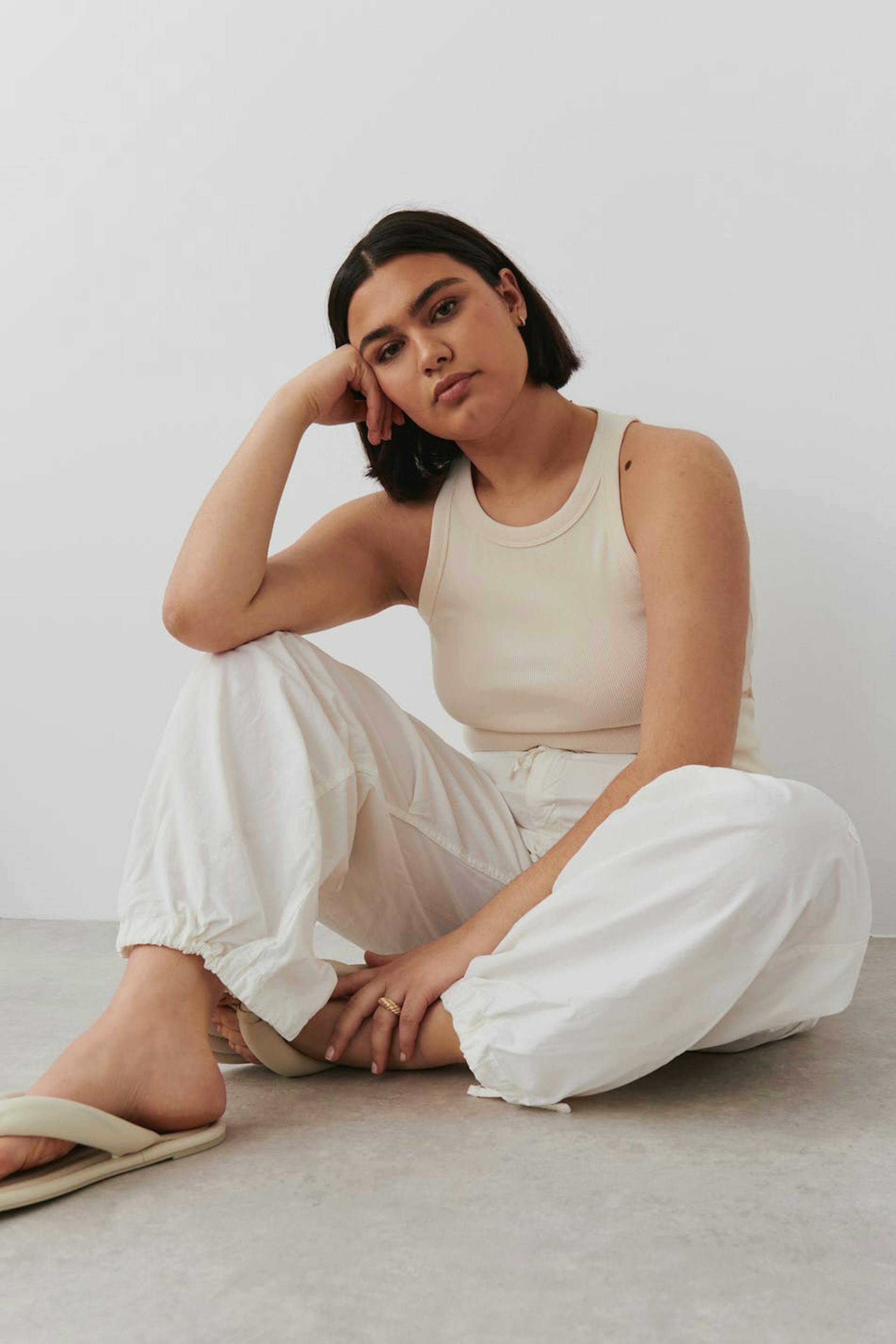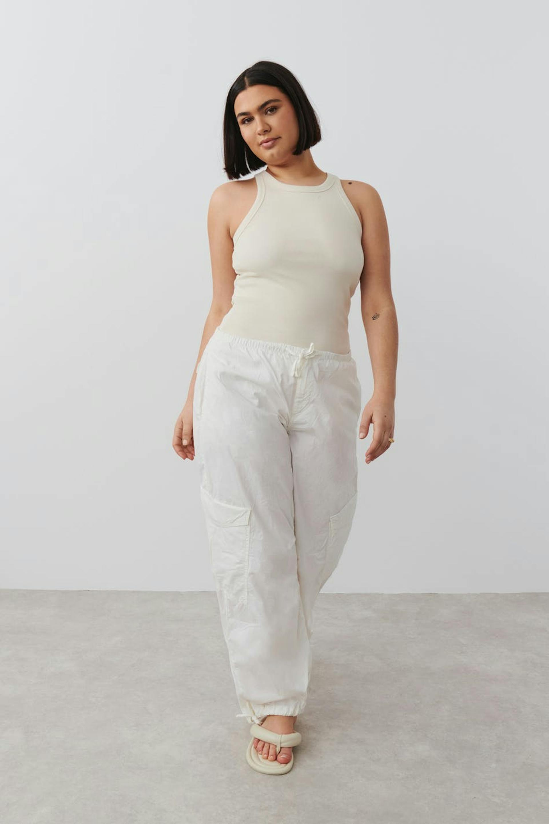Cargohose mit breiten Beinen. Die Hose ist beige und hat ein sportliches Design. Sie hat Gummiband mit Kordelzug in der Taille und am Beinende, Cargo-Taschen am Bein und eine Klappentasche hinten.