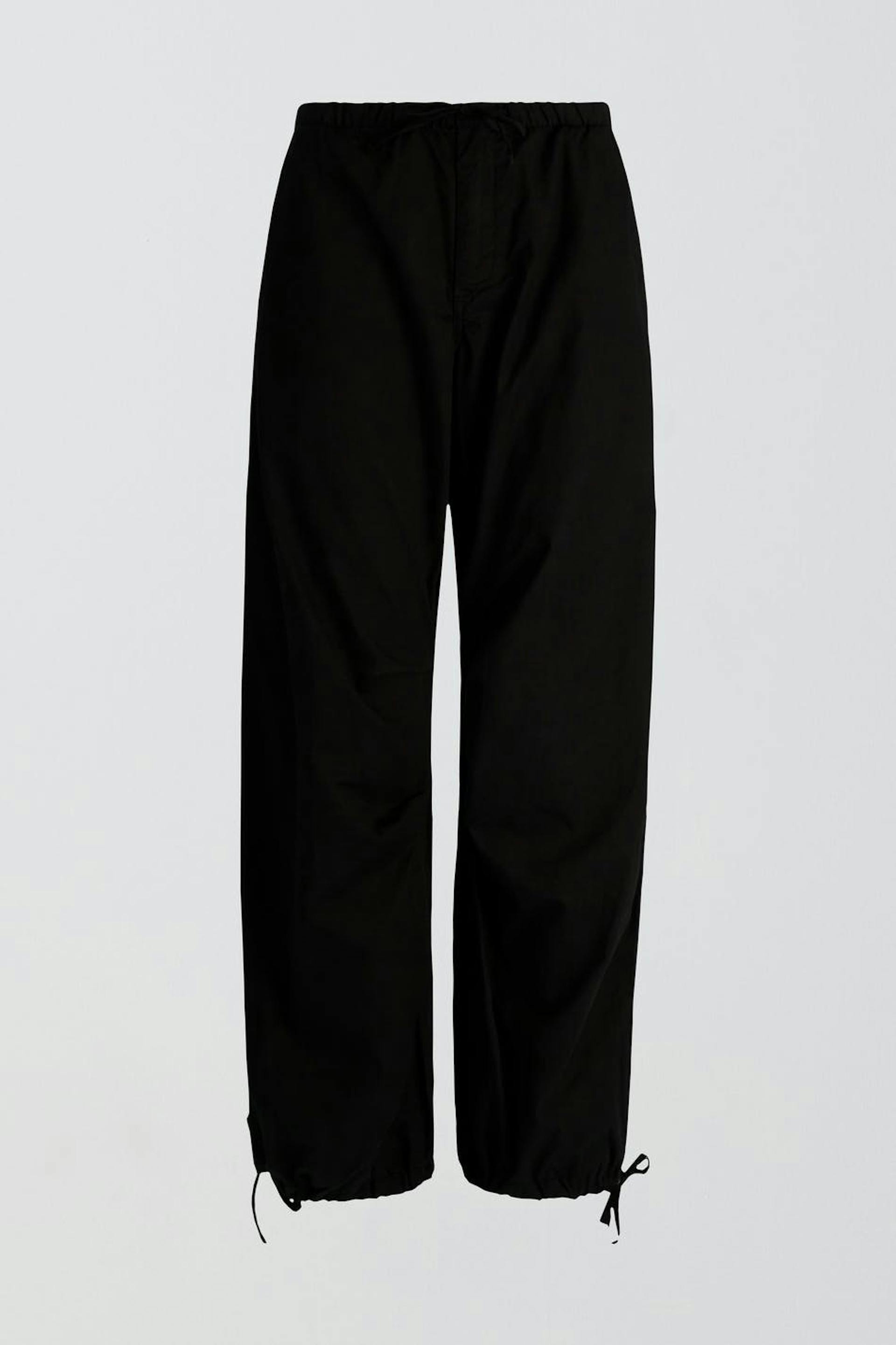 Fallschirmhosen aus weicher Baumwolle mit breiten Beinen. Die Hosen sind schwarz und haben ein sportliches Design mit Kordelzügen in der Taille und am Beinende. Sie haben Seitentaschen, Eingrifftaschen mit Patten hinten und Gummiband in der Taille. Ideal bei einer Körpergröße ab 1,75 m.
