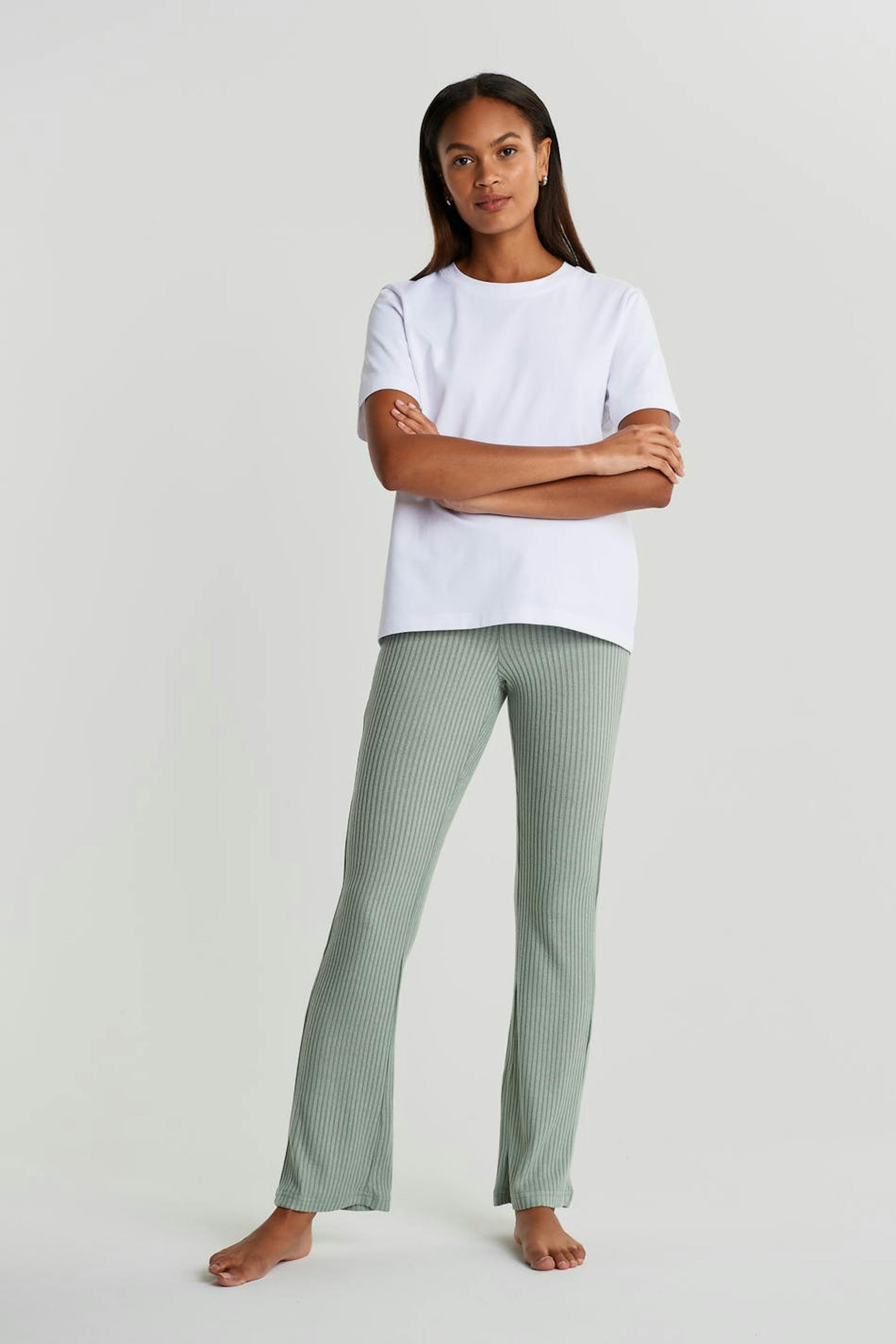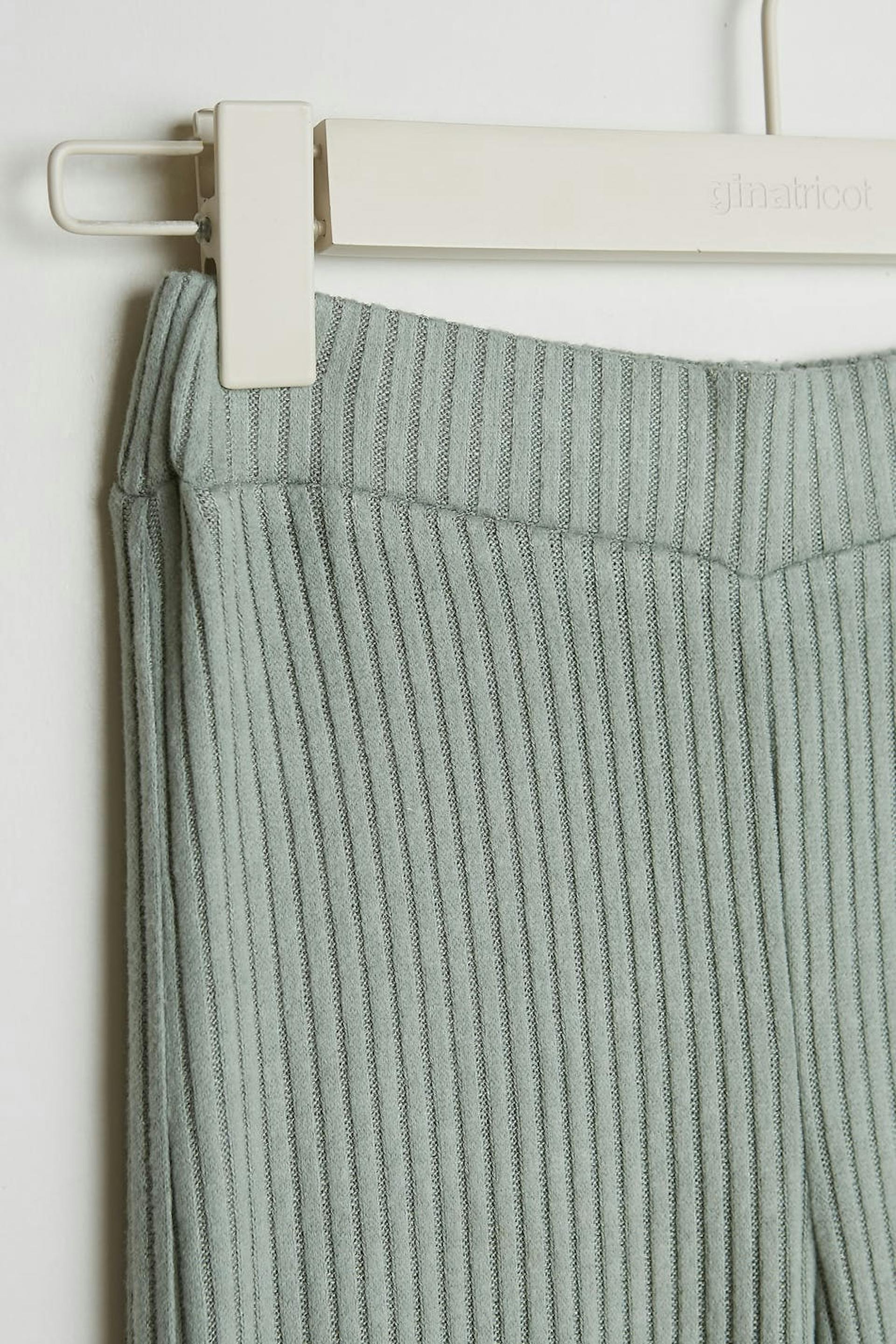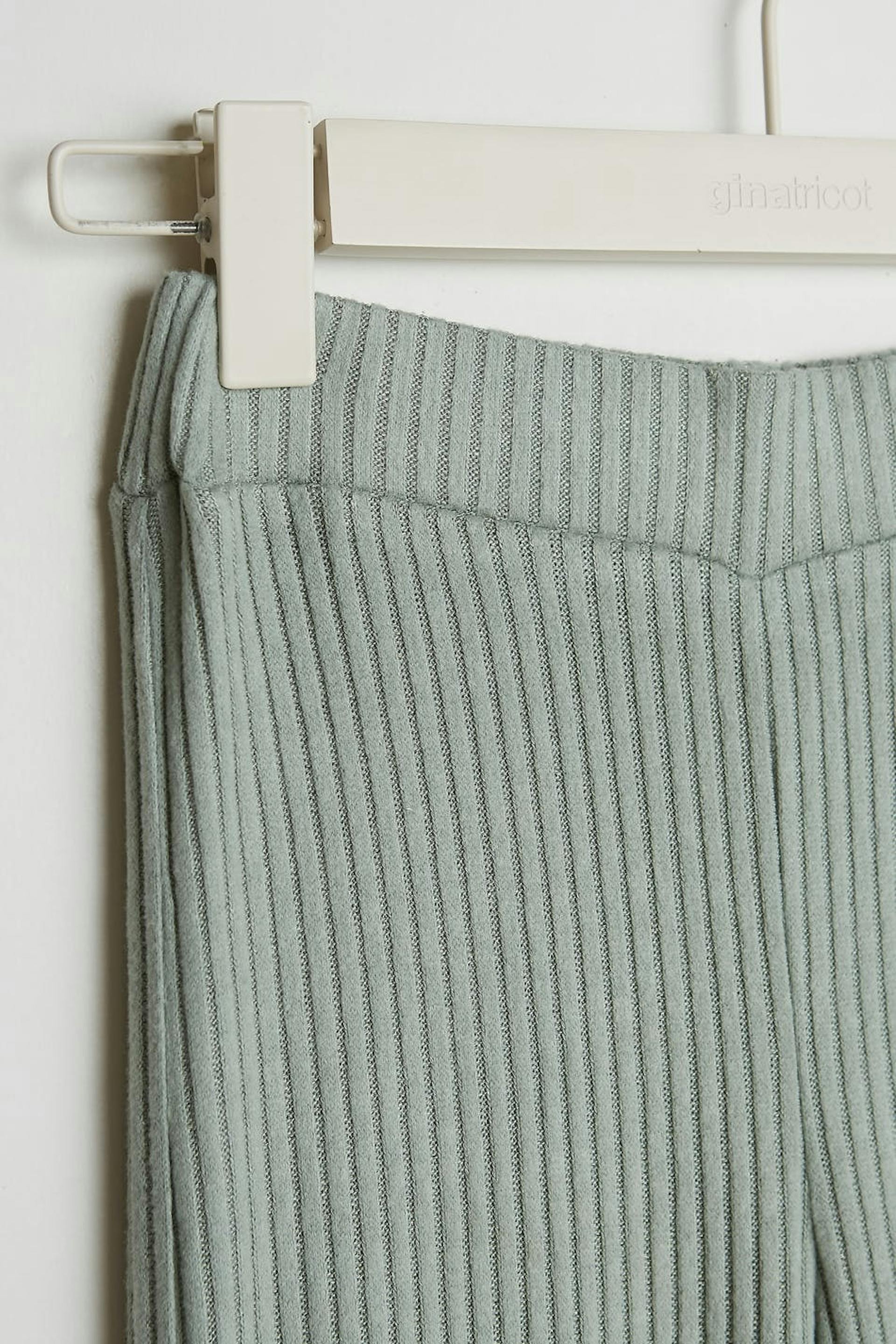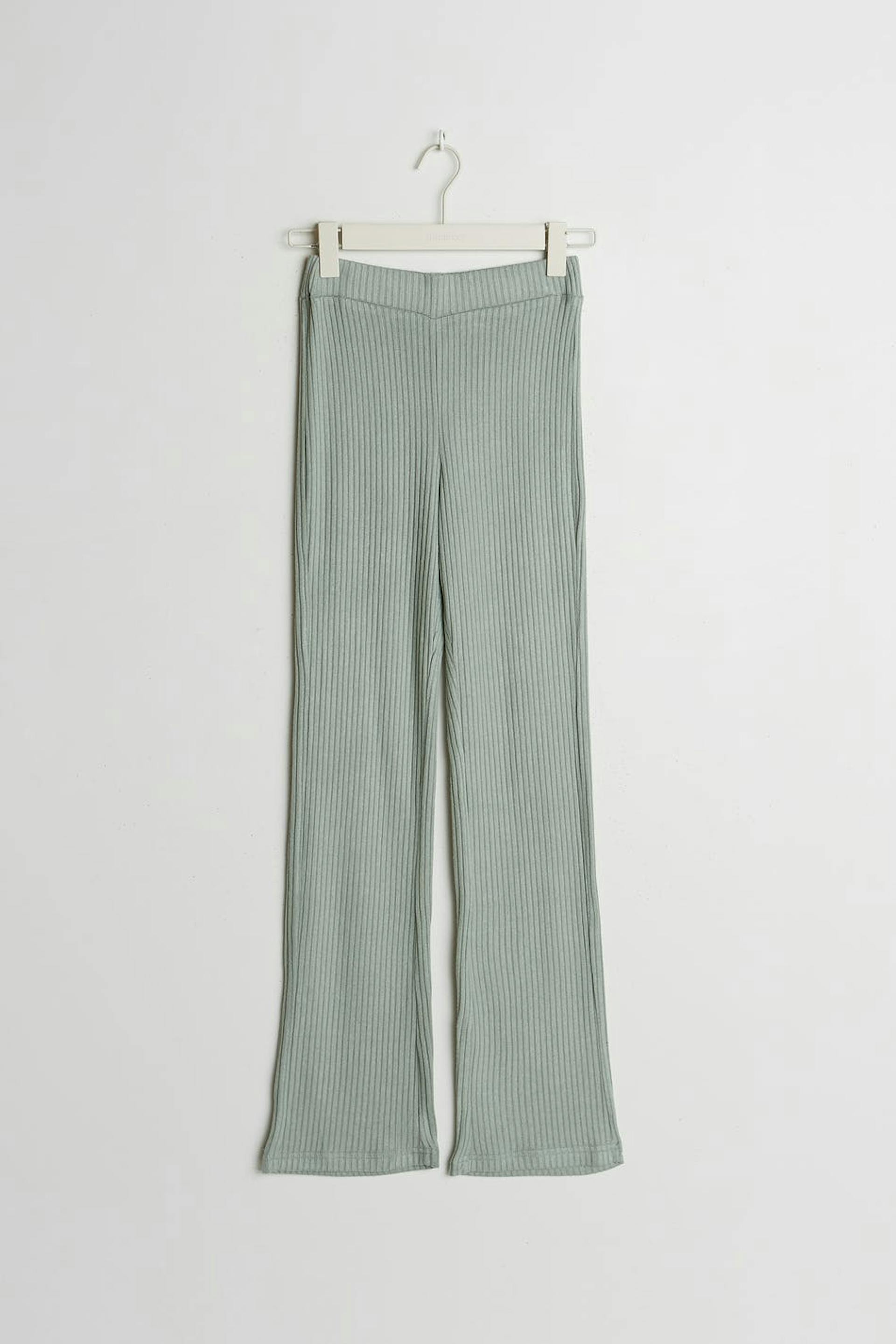 Hose mit einem Rippenstrick und einer normaler Passform. Die Hose ist grün und hat gerade Beine. Sie hat ein weiches Gummiband in der Taille.