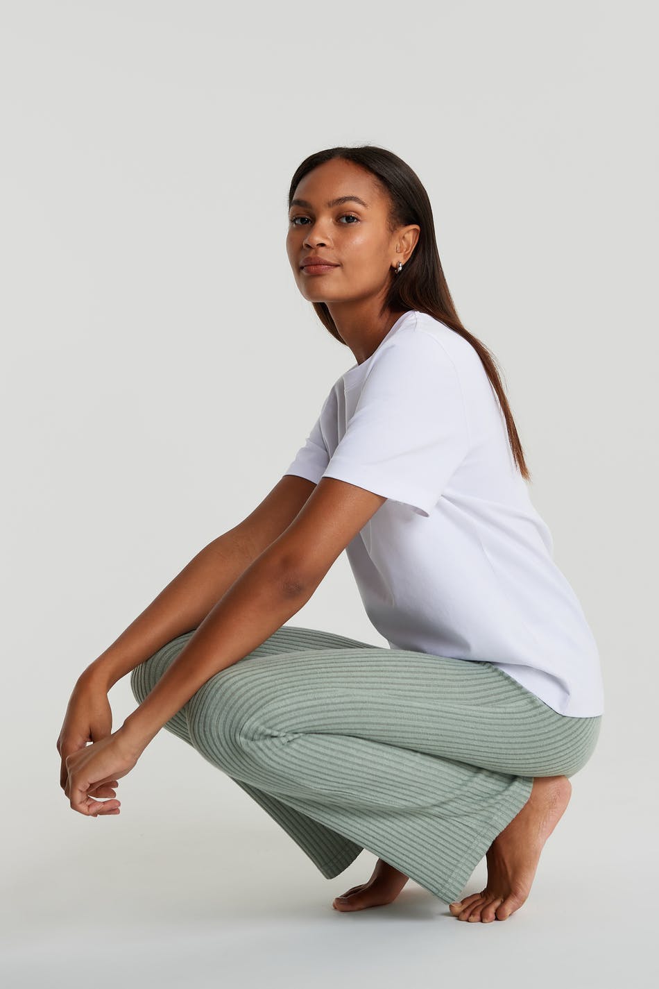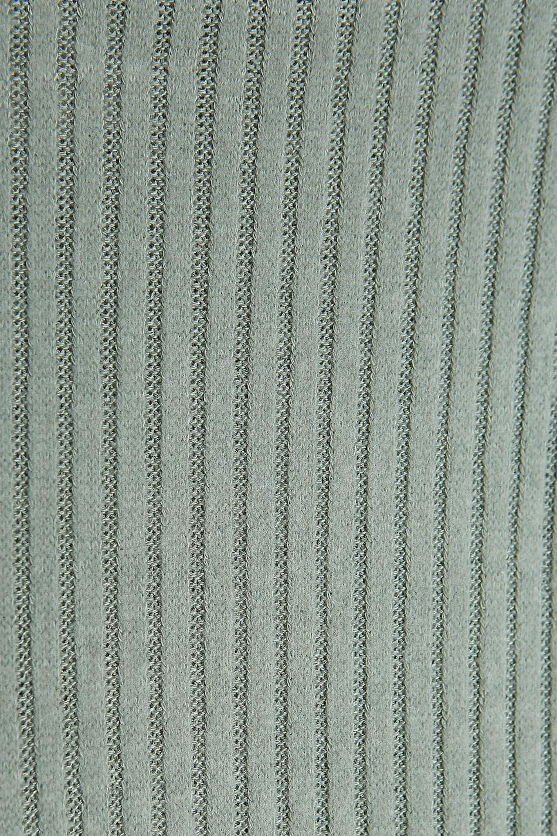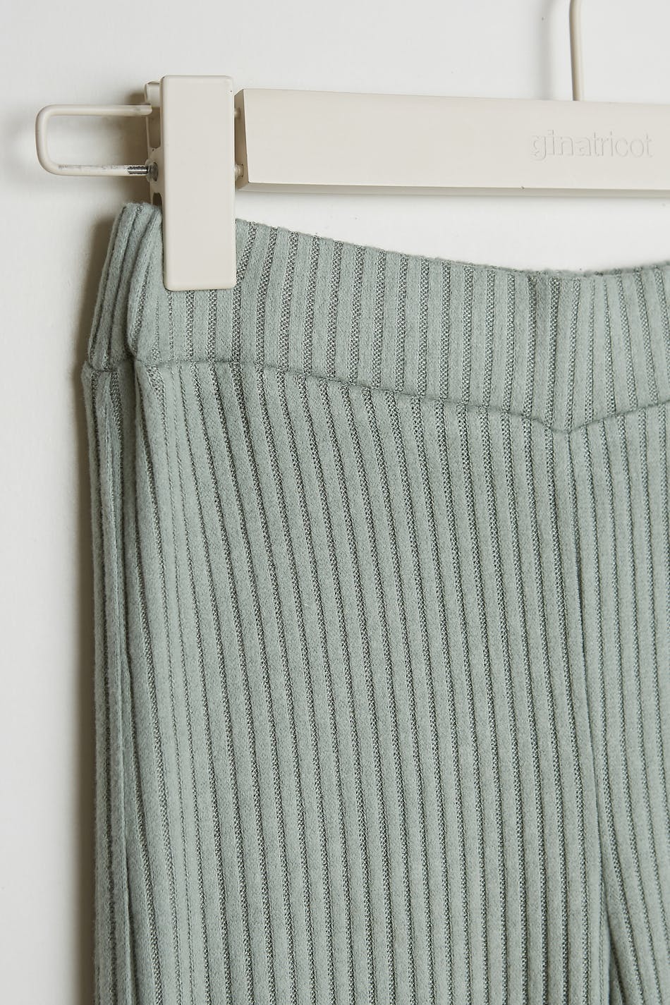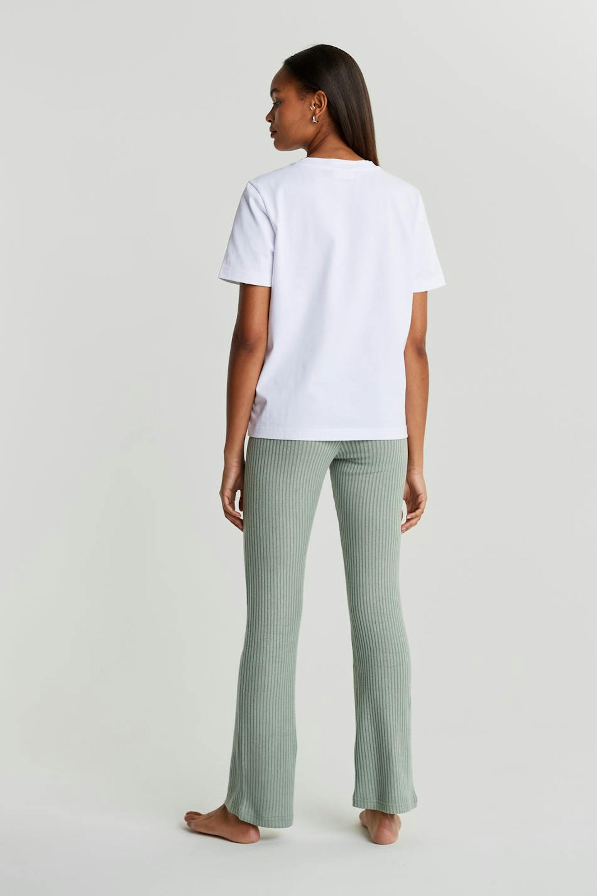 Hose mit einem Rippenstrick und einer normaler Passform. Die Hose ist grün und hat gerade Beine. Sie hat ein weiches Gummiband in der Taille.