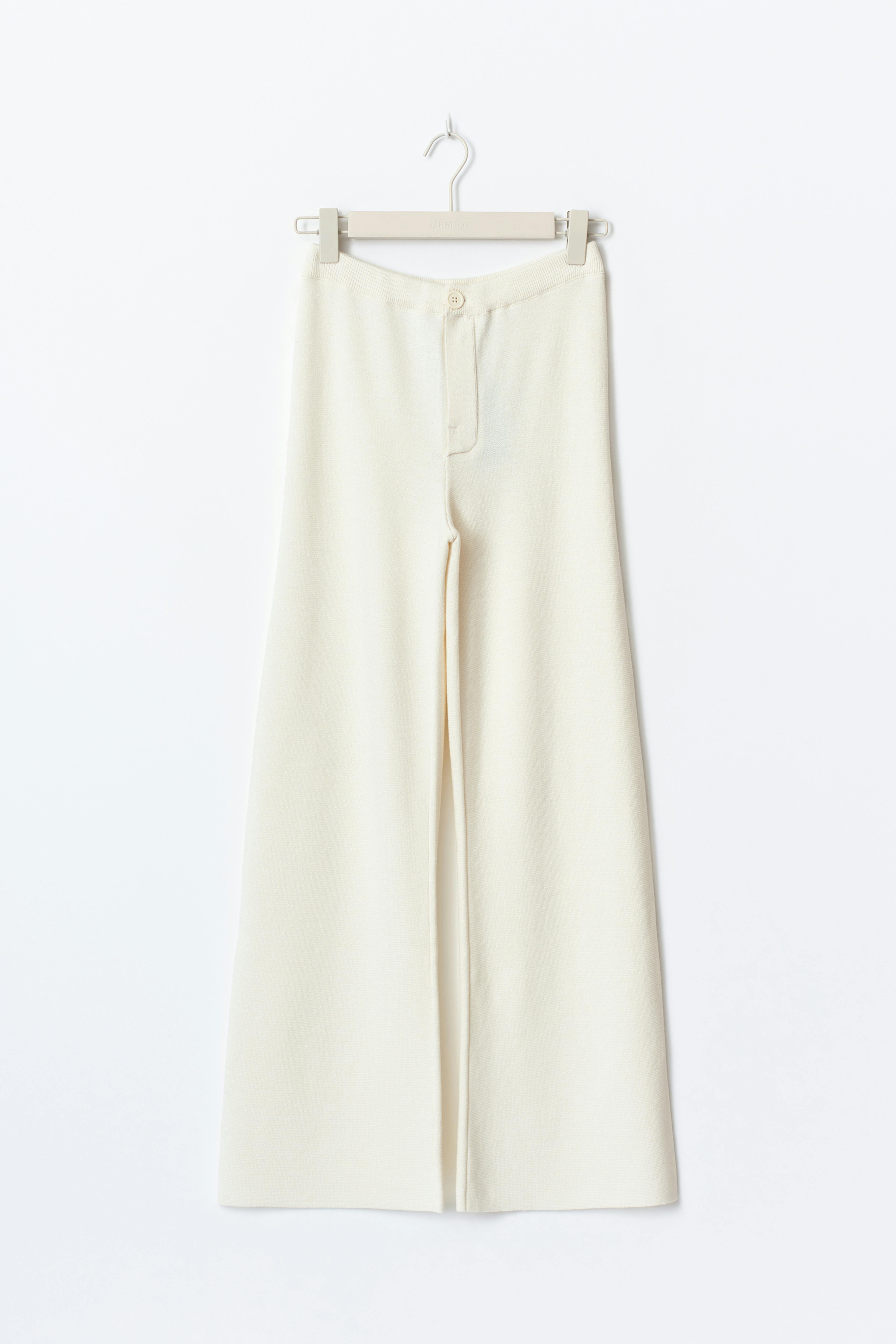 Gestrickte Hosen mit einer normalen Taille. Die Hosen sind knochenweiß und haben gerade Beine. Sie haben eine Selbstbindung in der Taille und eine falsche Tasche hinten.