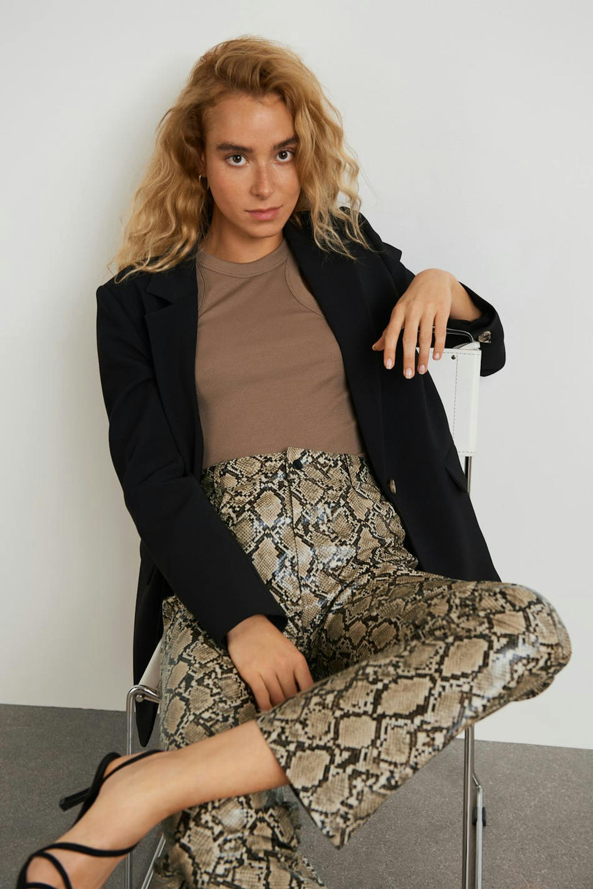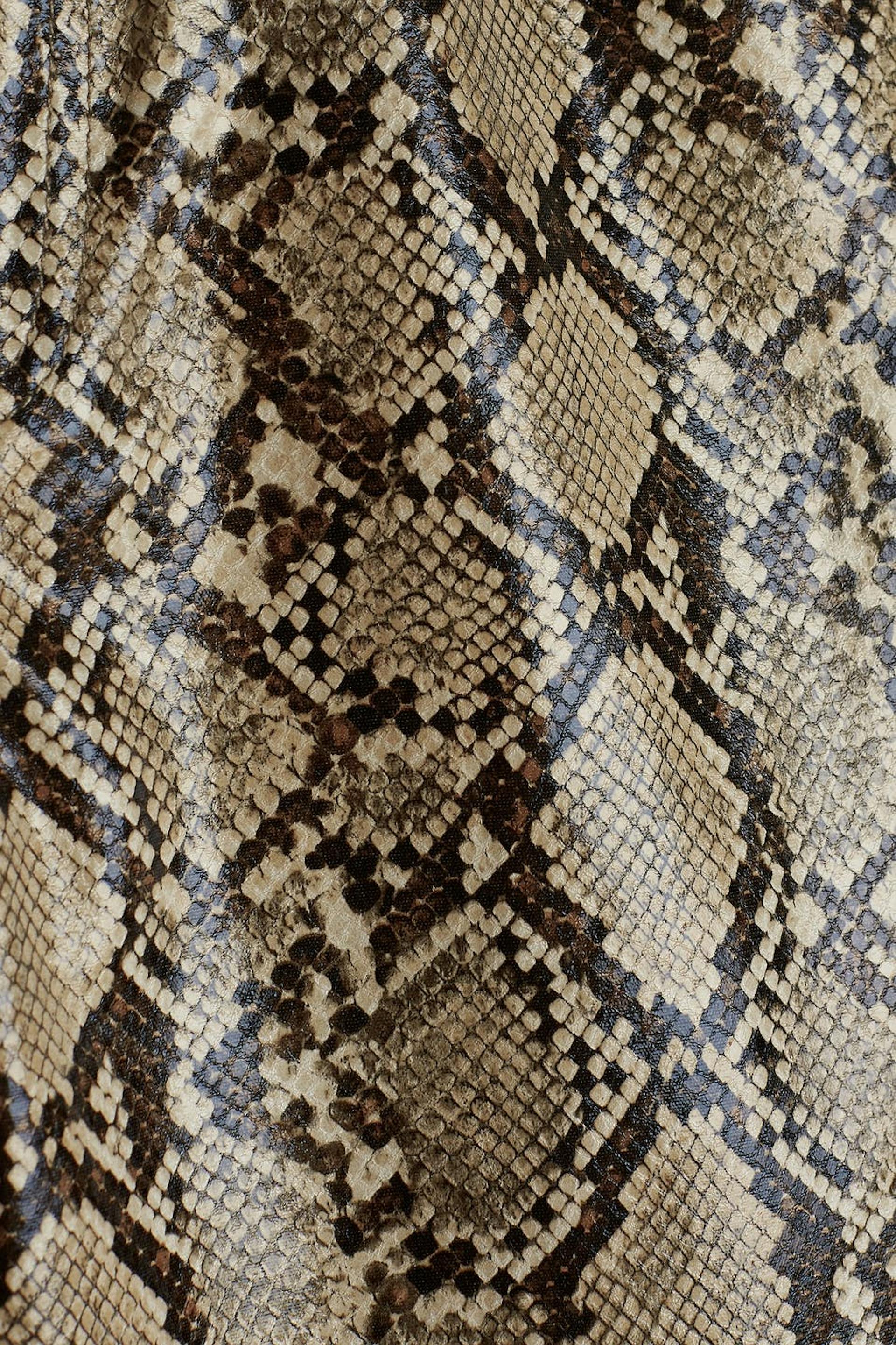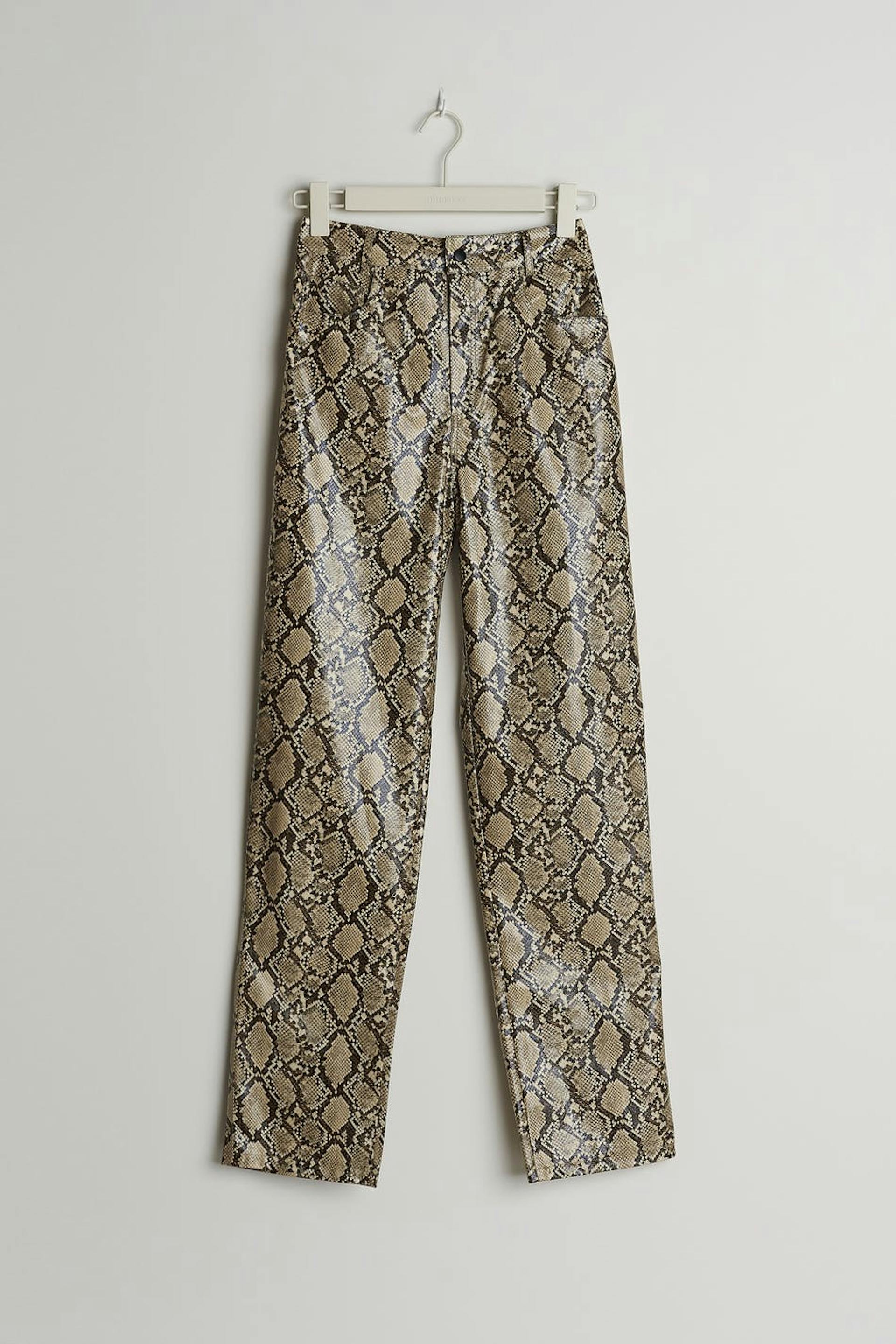 Hosen mit einem Schlangenmuster und einem hohem Bund. Die Hosen sind gerade und haben Hosenbeine mit einer voller Länge.