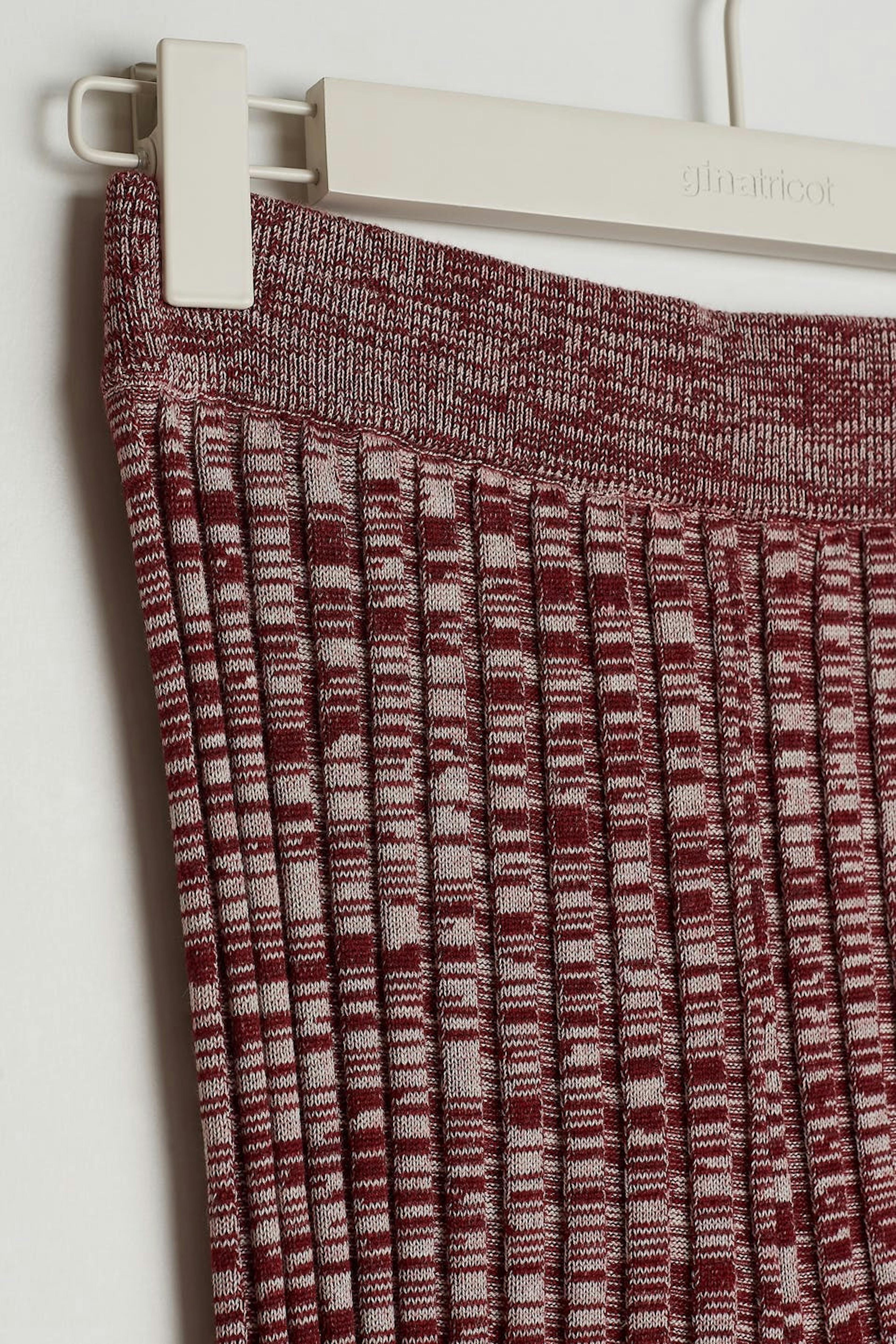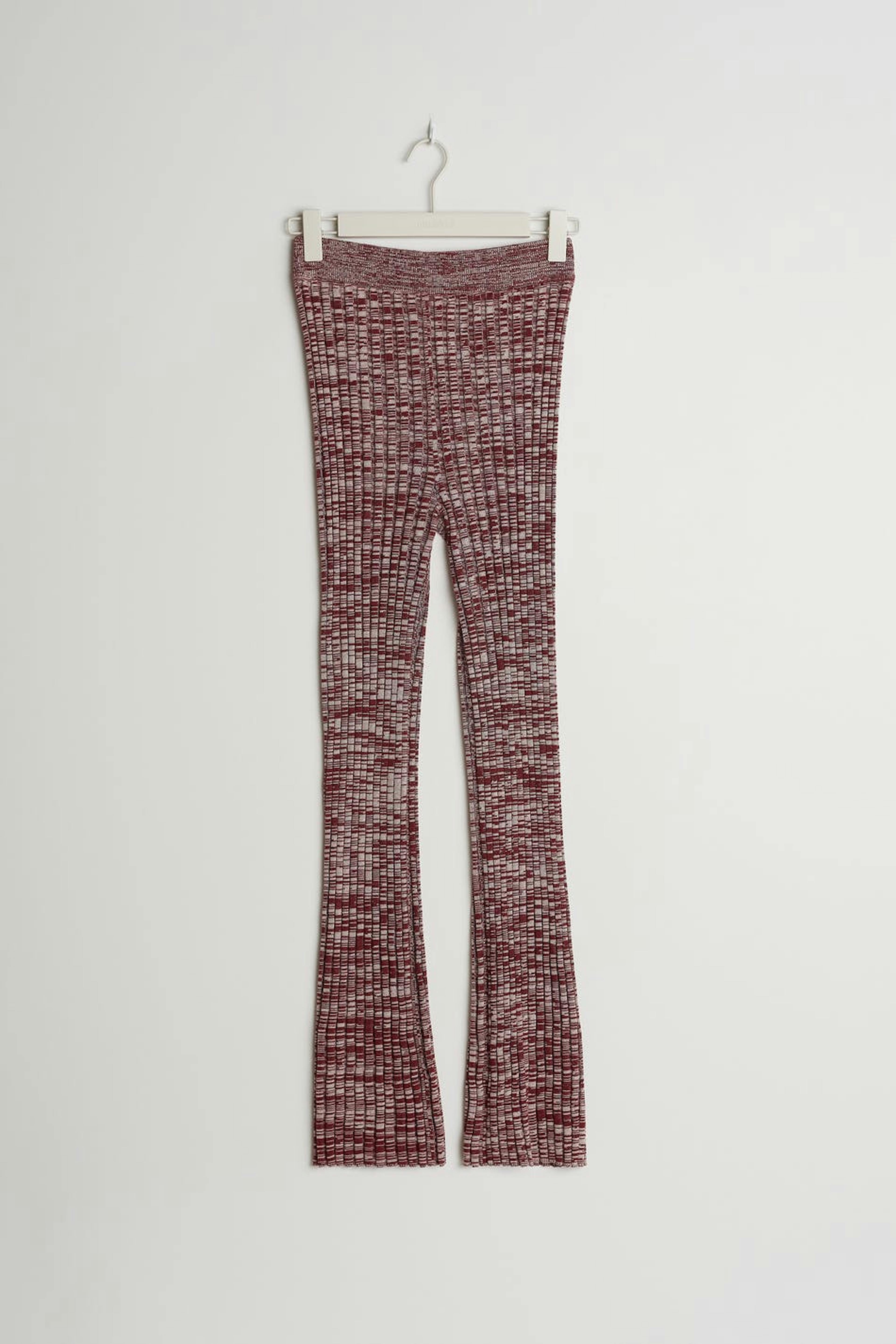 Gerippte Hosen mit einem hohem Bund. Die Hosen sind rot und haben ausgestellte Hosenbeine mit einer voller Länge. Sie haben ein Gummiband in der Taille.