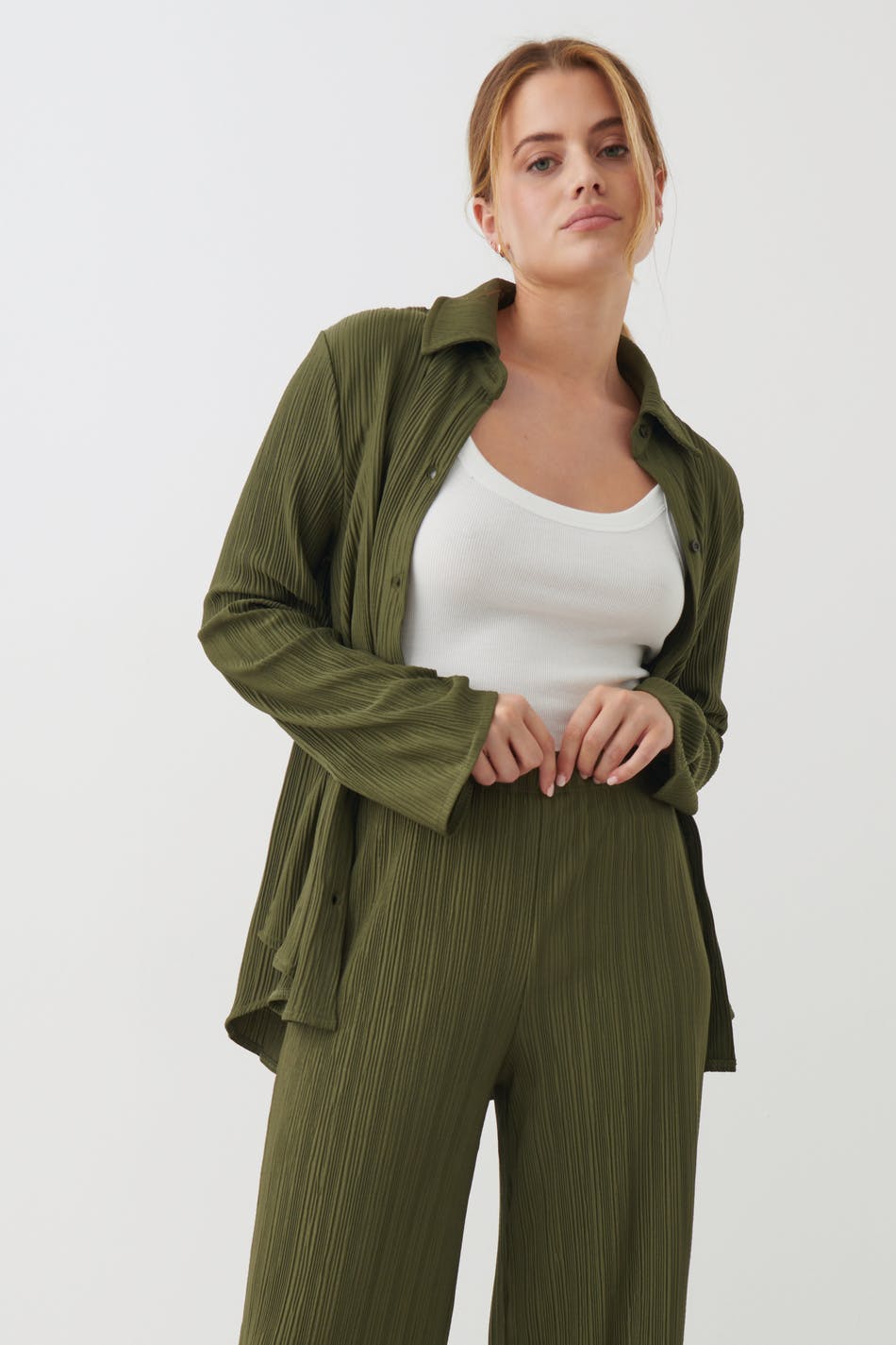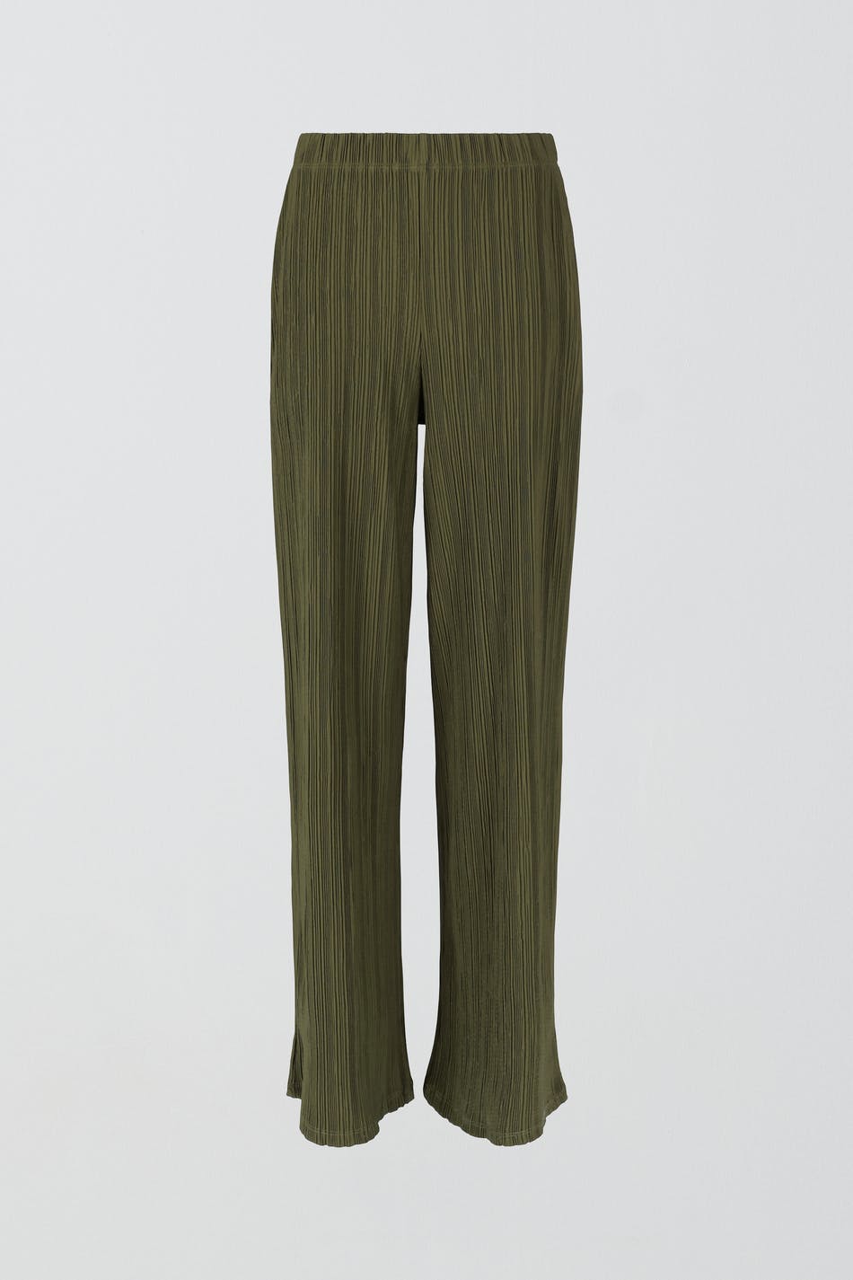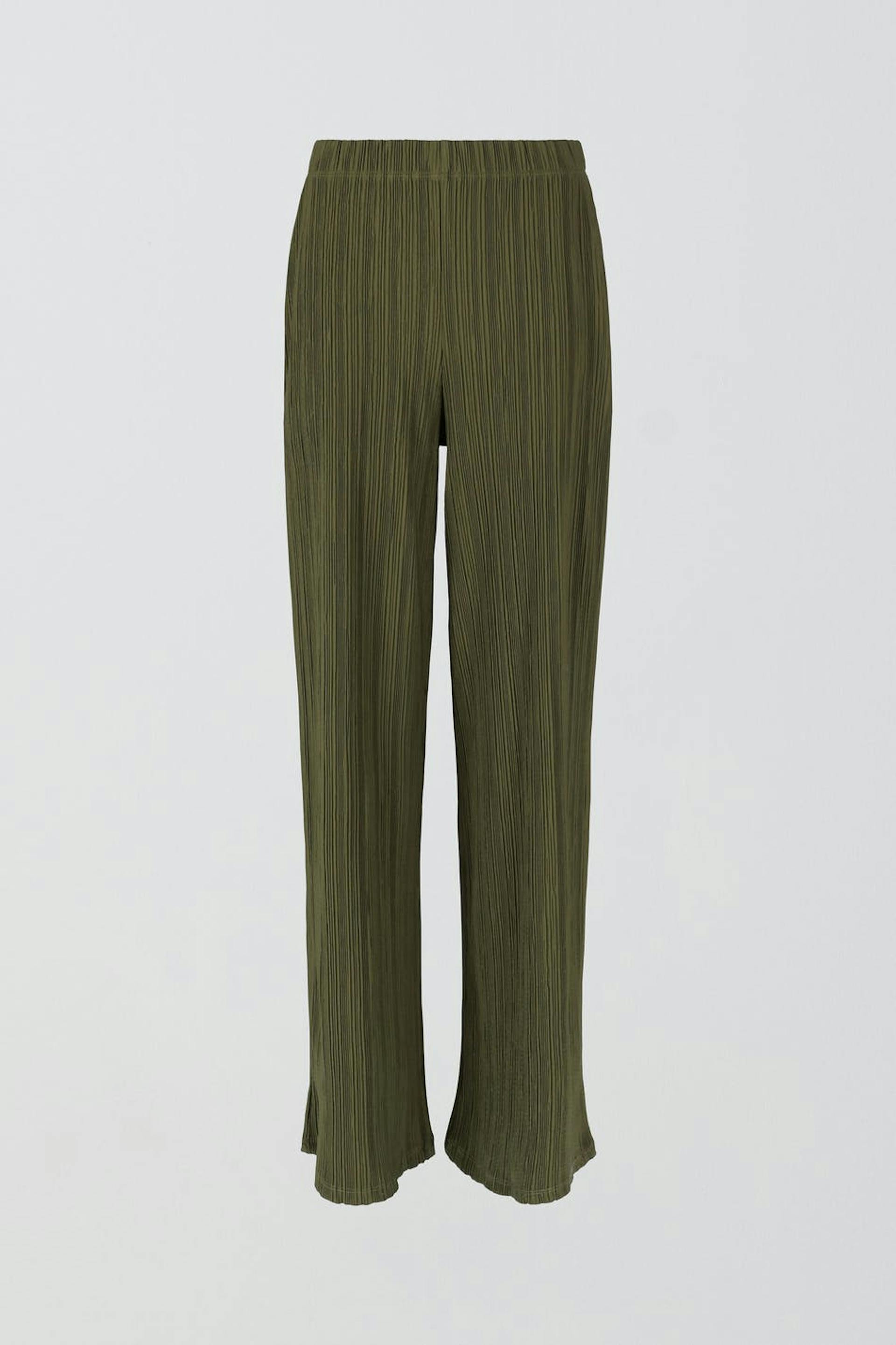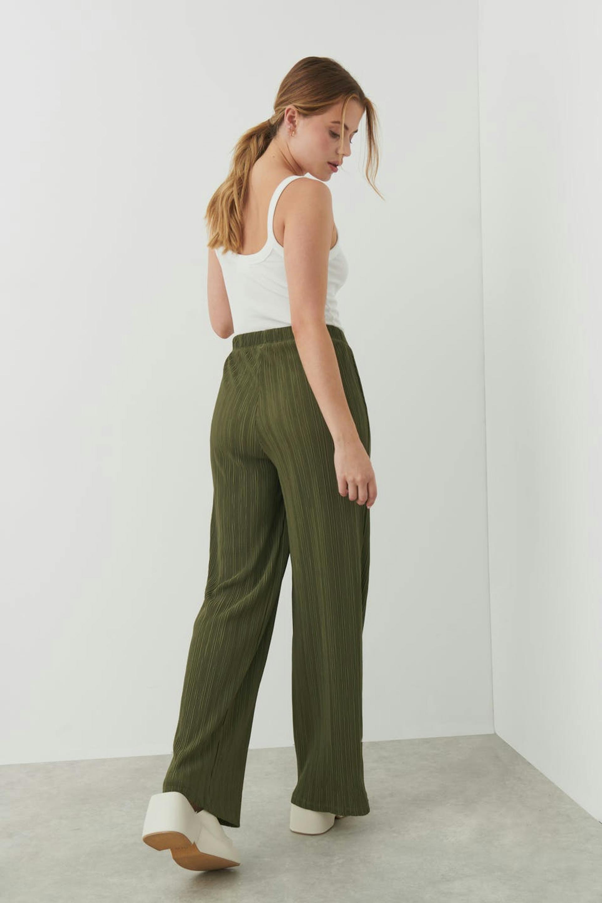 Plissierte Hosen aus Jersey mit breiten Beinen. Die Hosen sind grün und haben ein weiches Gummiband in der Taille.