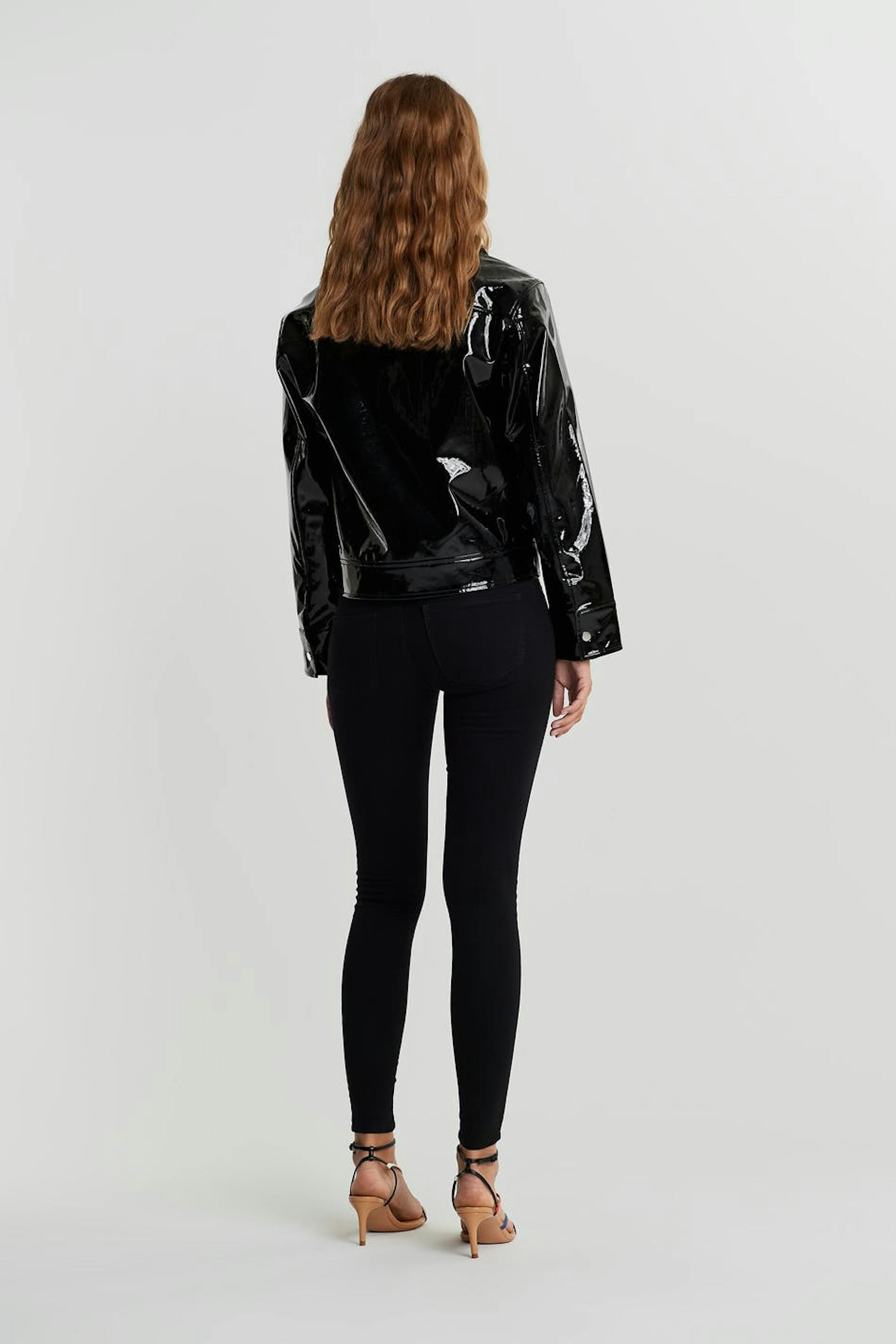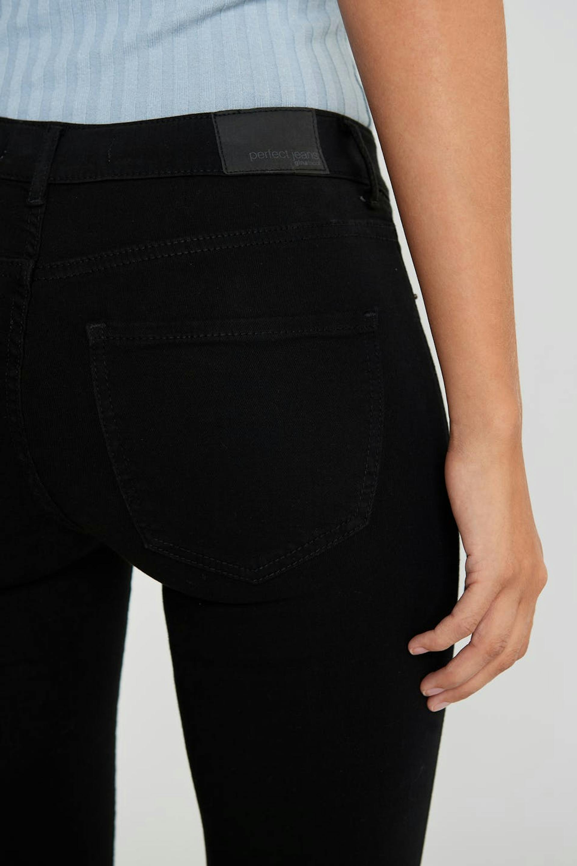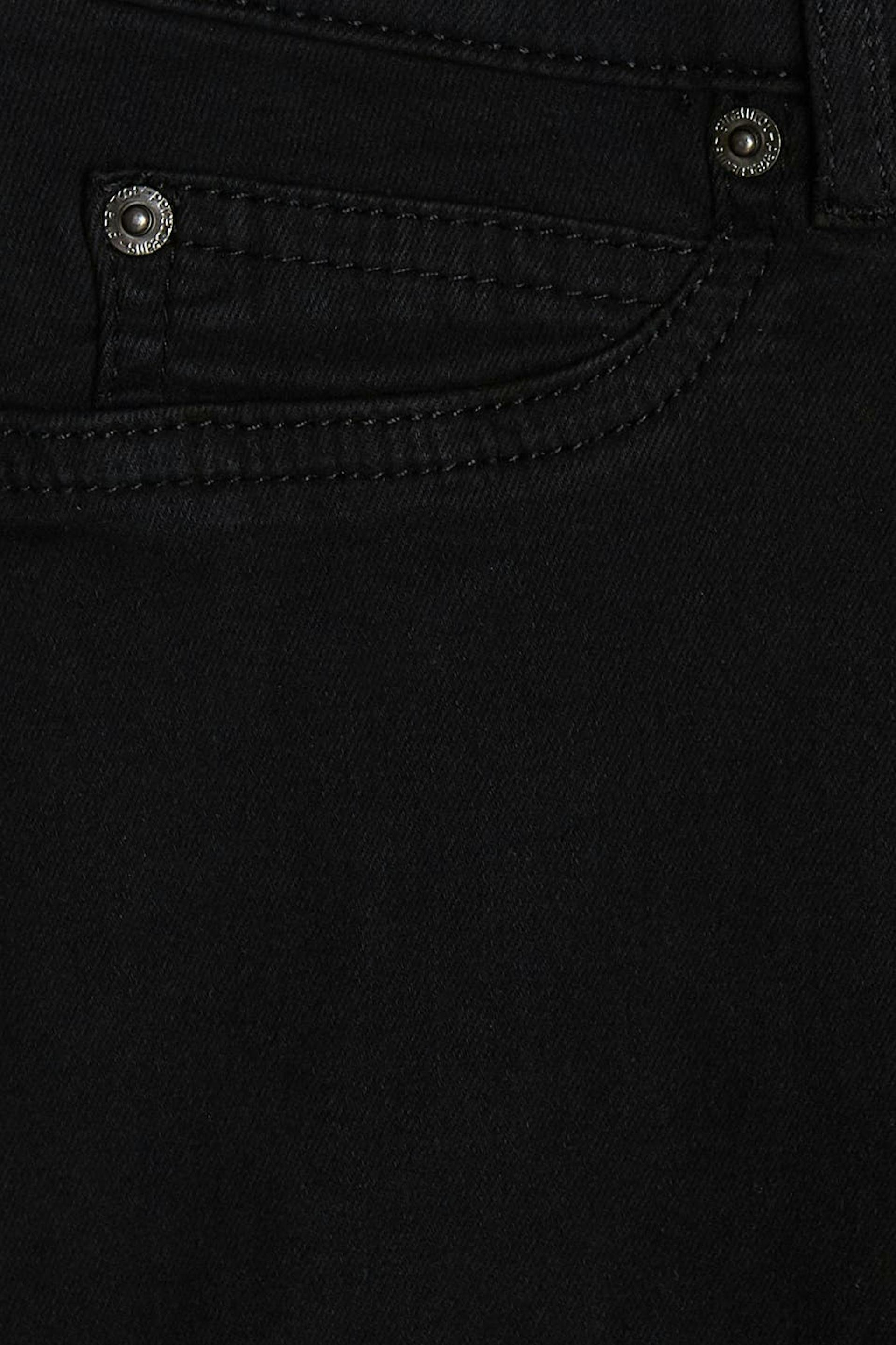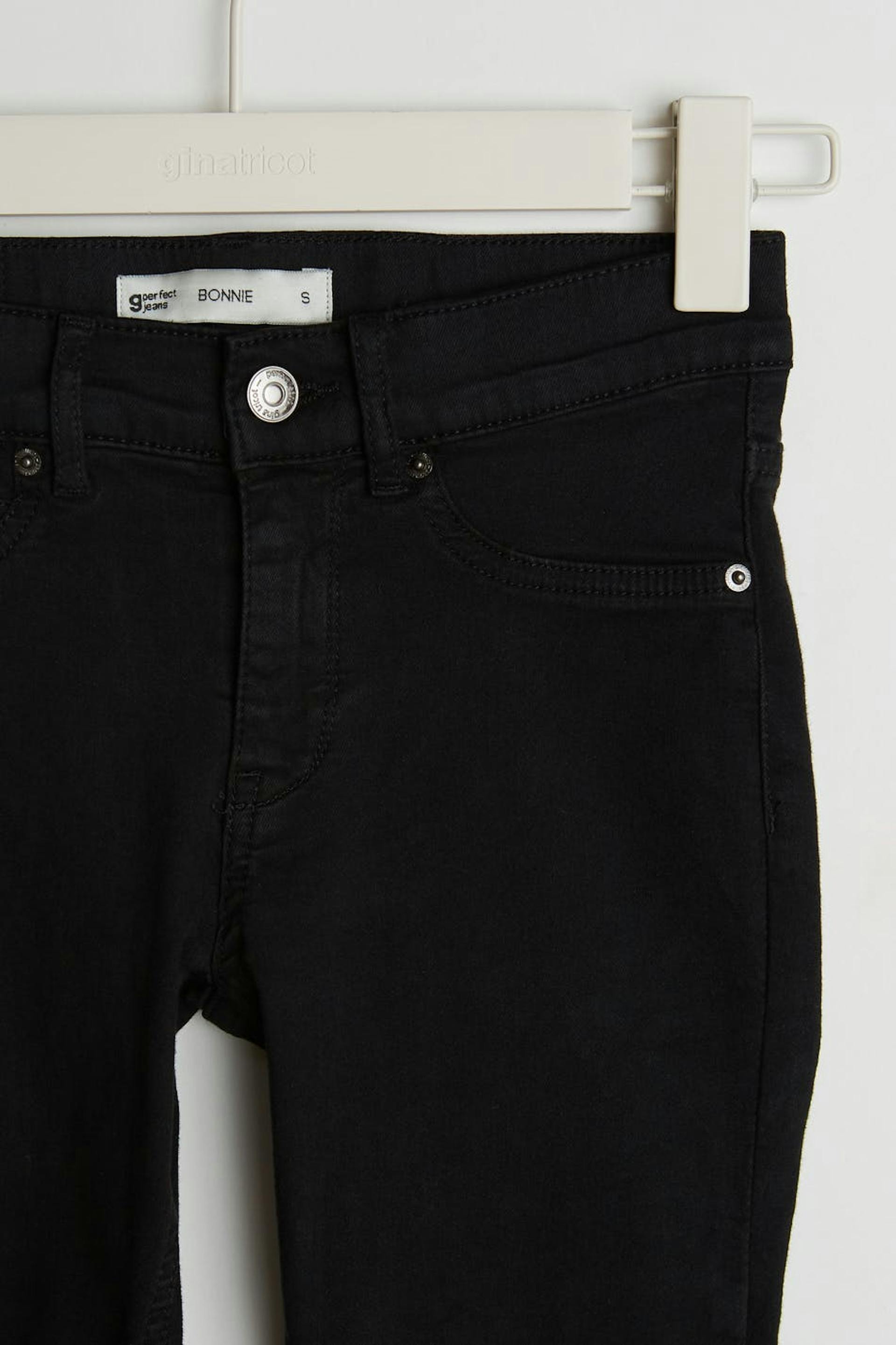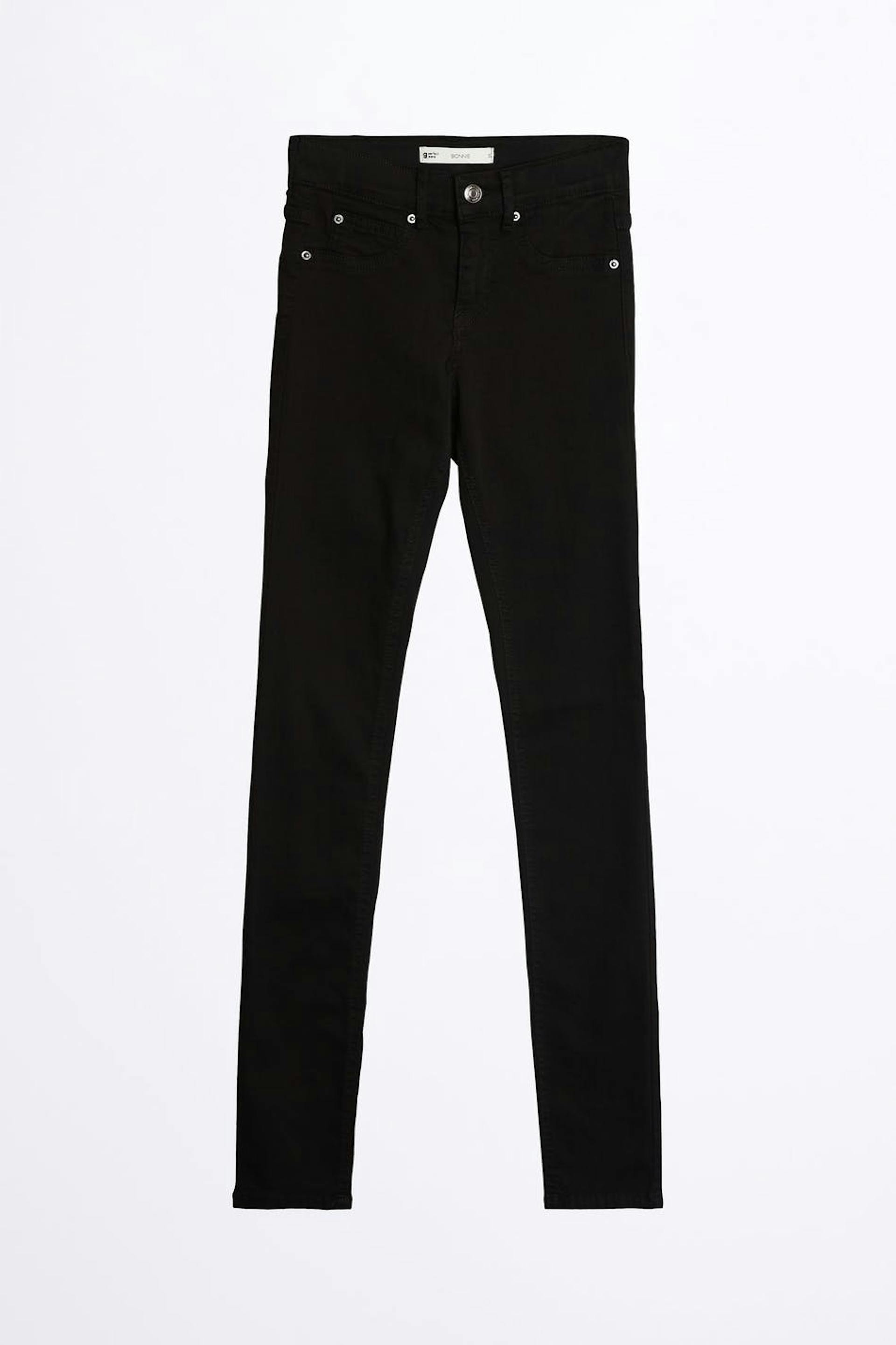 Superstretch Jeans mit einer taillierten Passform. Die Jeans ist schwarz und hat eine enge Passform. Sie hat eine tiefe Taille.