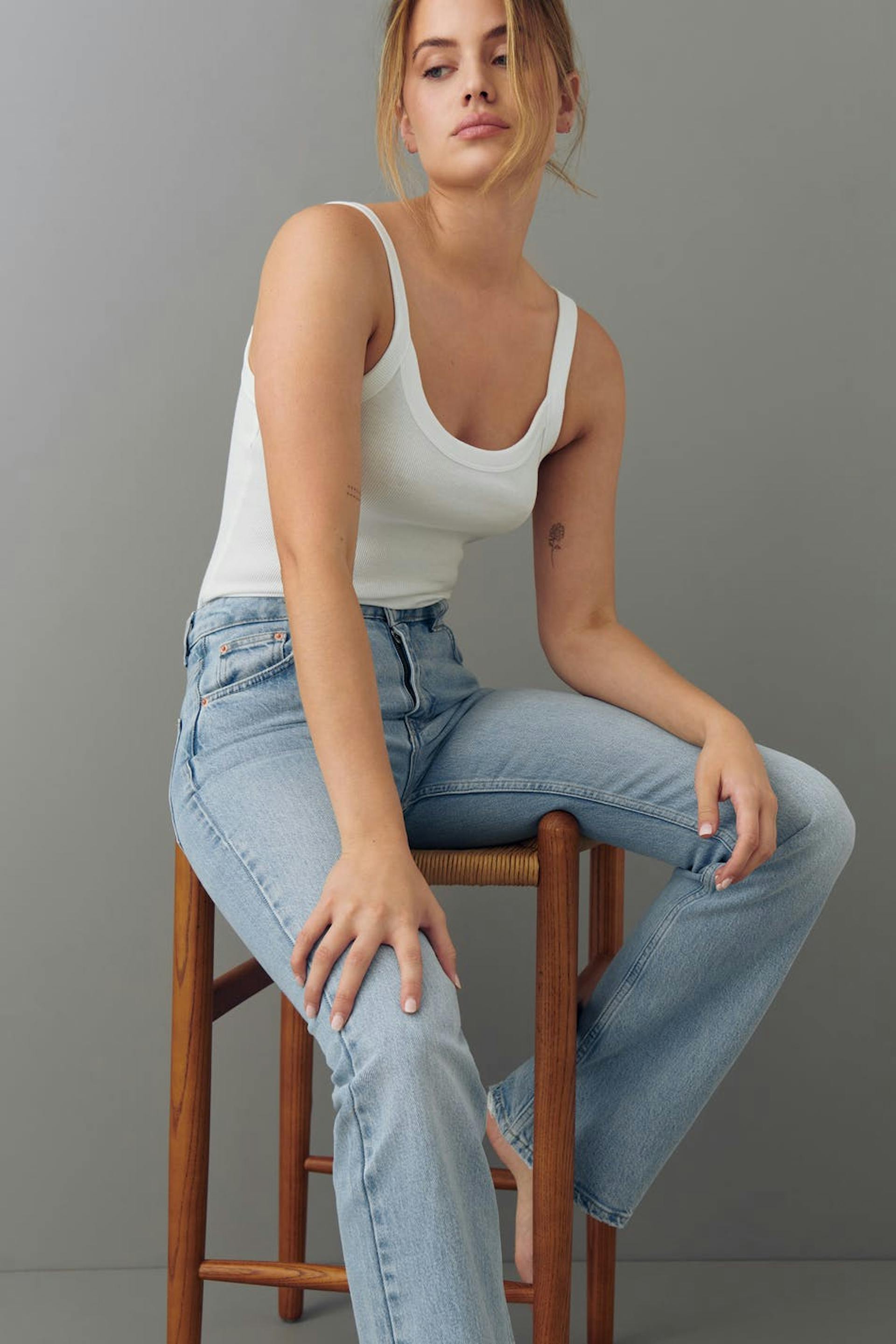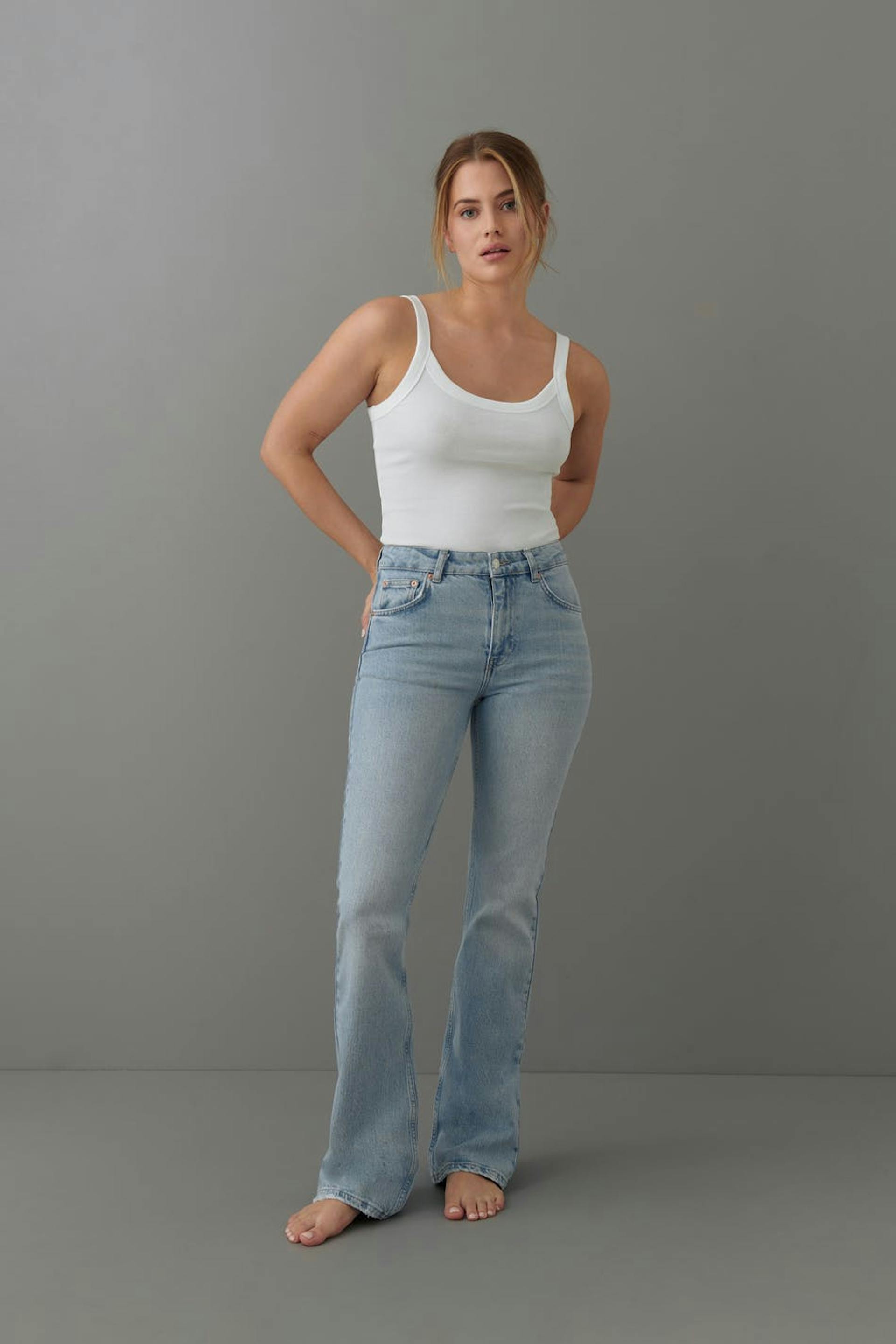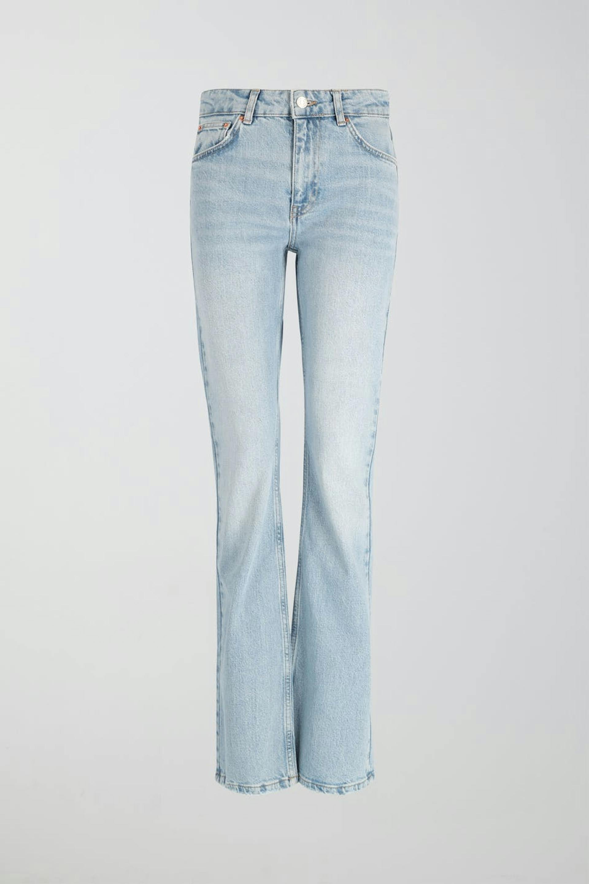 Bootcut-Jeans mit mittlerer Taille. Die Jeans ist hellblau und hat eine figurbetonte Passform aus low stretch denim. Sie hat ausgestellte Beine mit normaler Länge und Reißverschluss. Benutze unsere Größentabelle, um deine Größe zu finden.