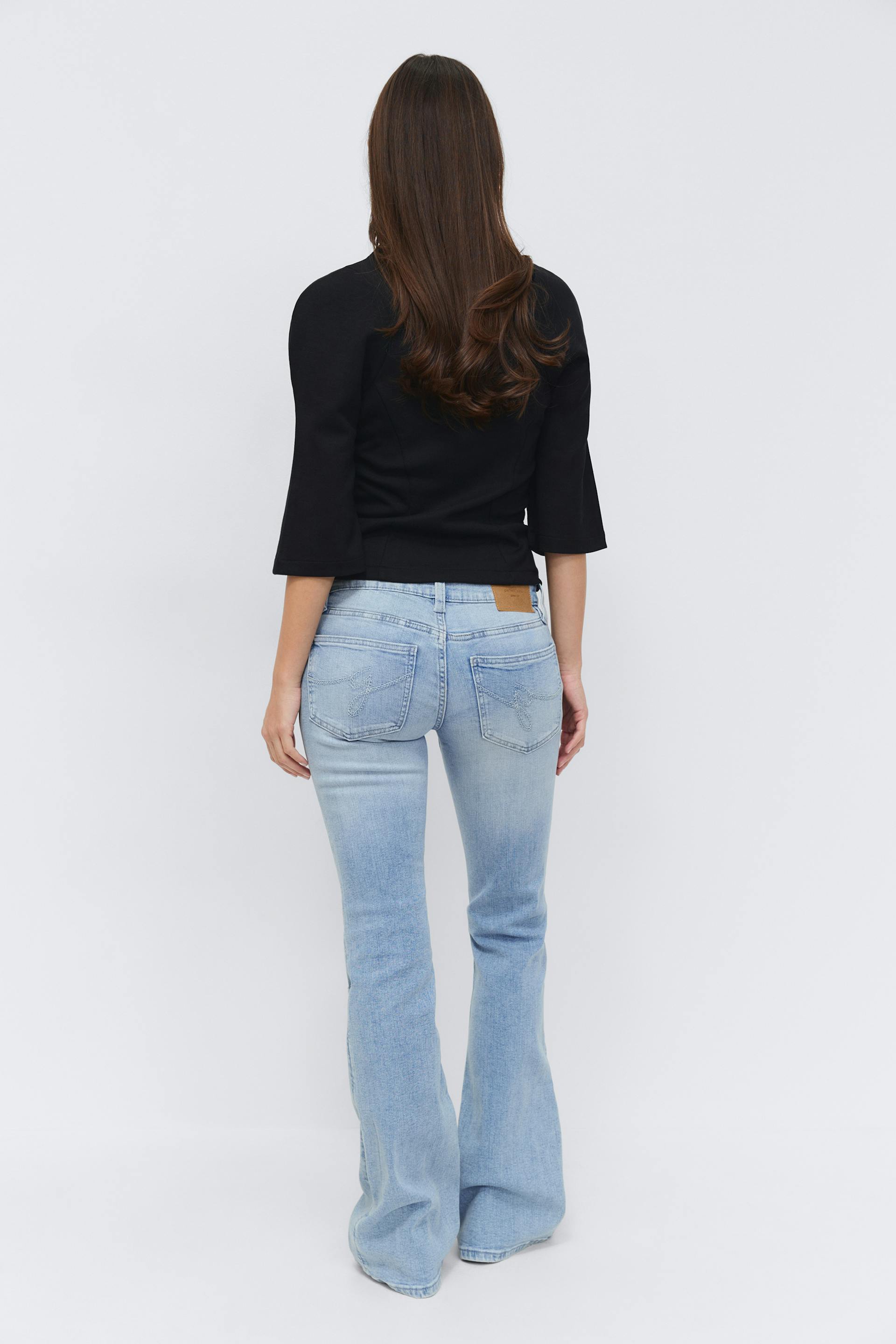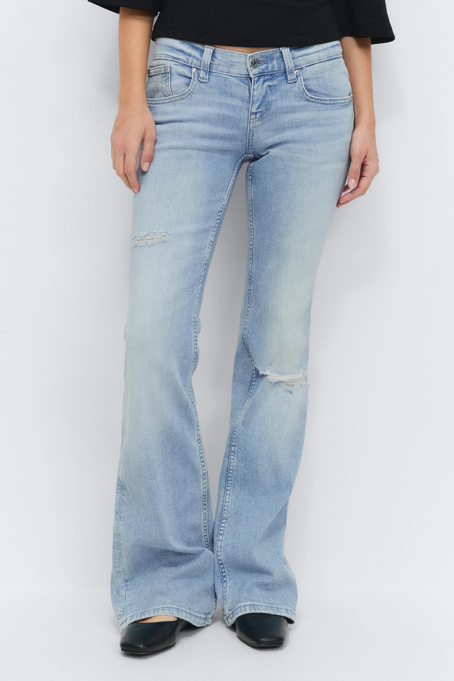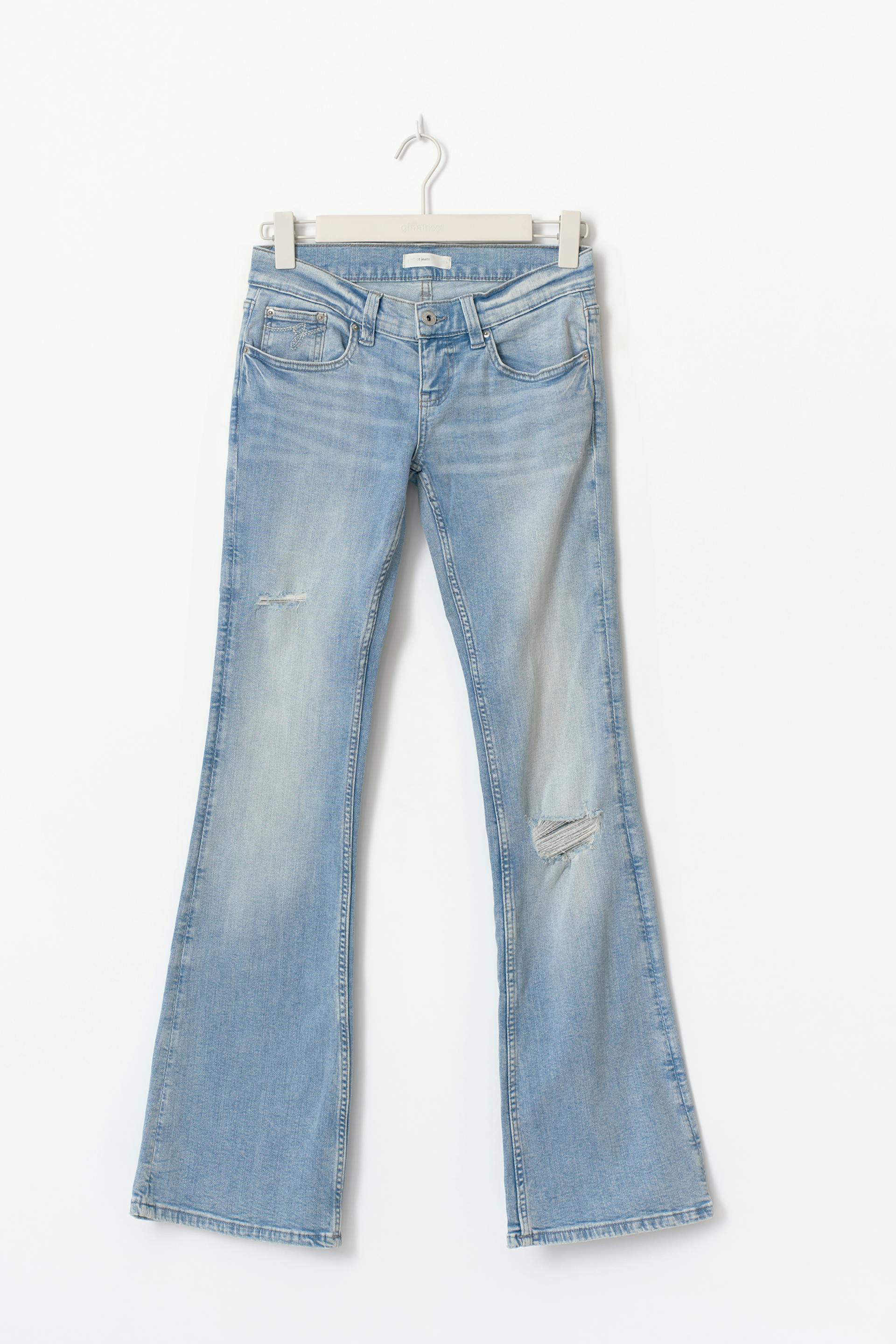 Bootcut-Jeans mit Löchern. Die Jeans ist blau und hat tiefe Taille. Sie hat elastische Qualität, figurbetonte Passform, ausgestellte Beine, Reißverschluss, Gürtelschlaufen, normale Länge und Taschen vorne und hinten. Benutze unsere Größentabelle, um deine Größe zu finden.