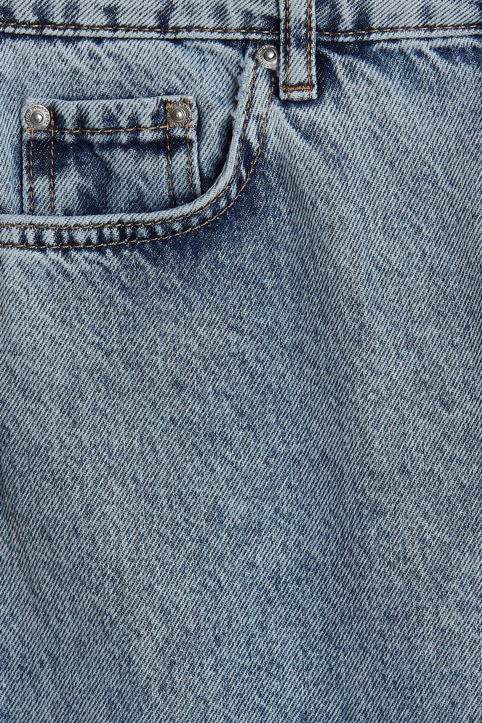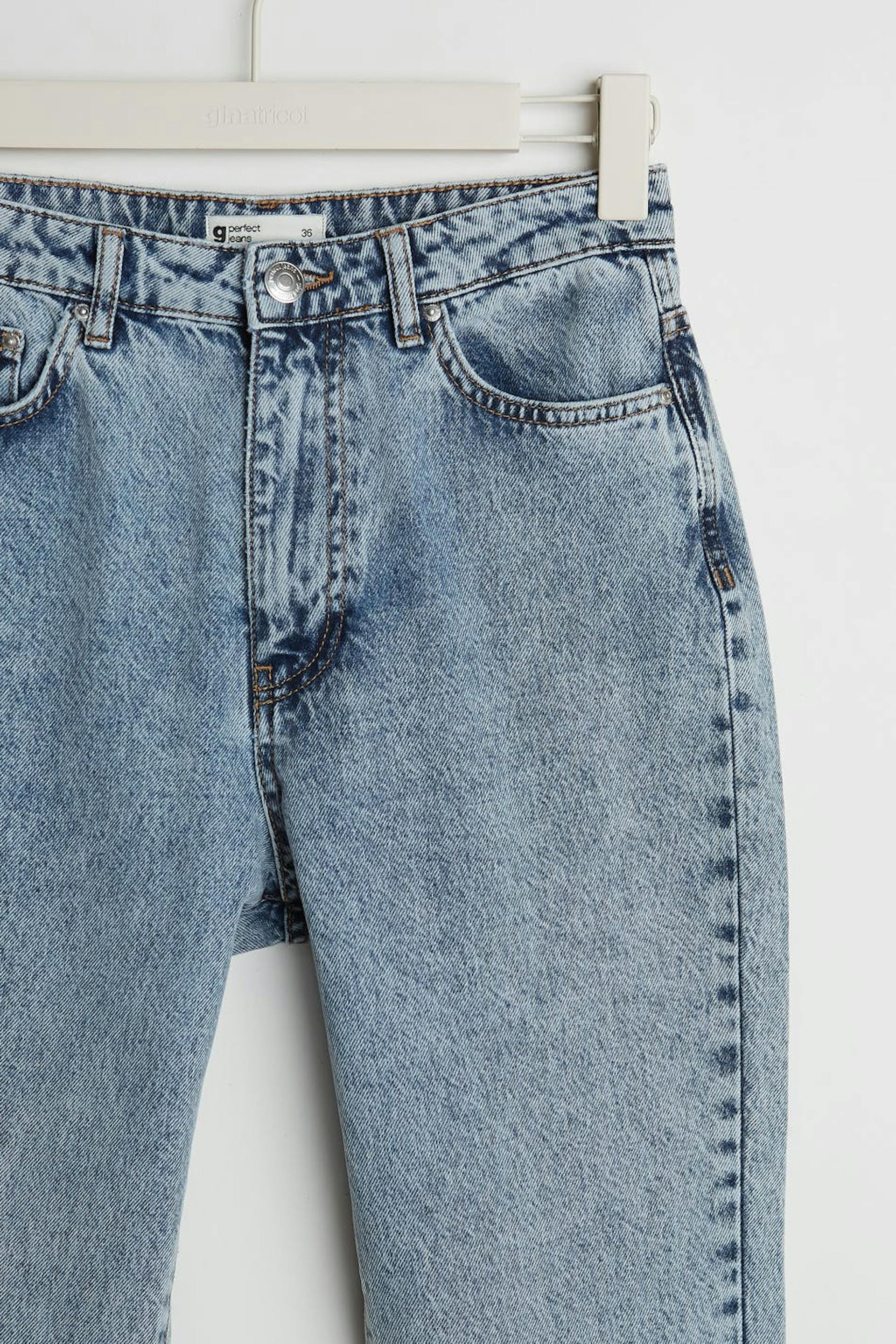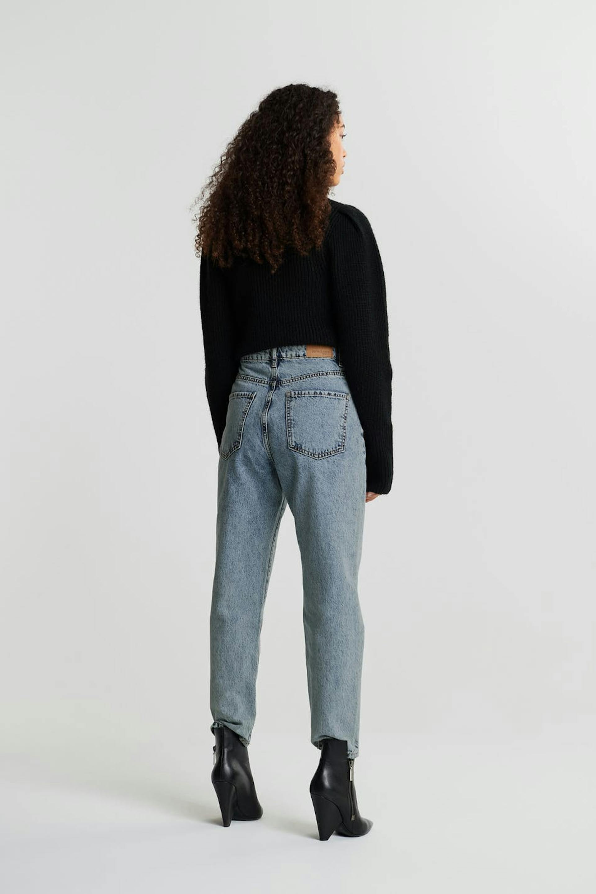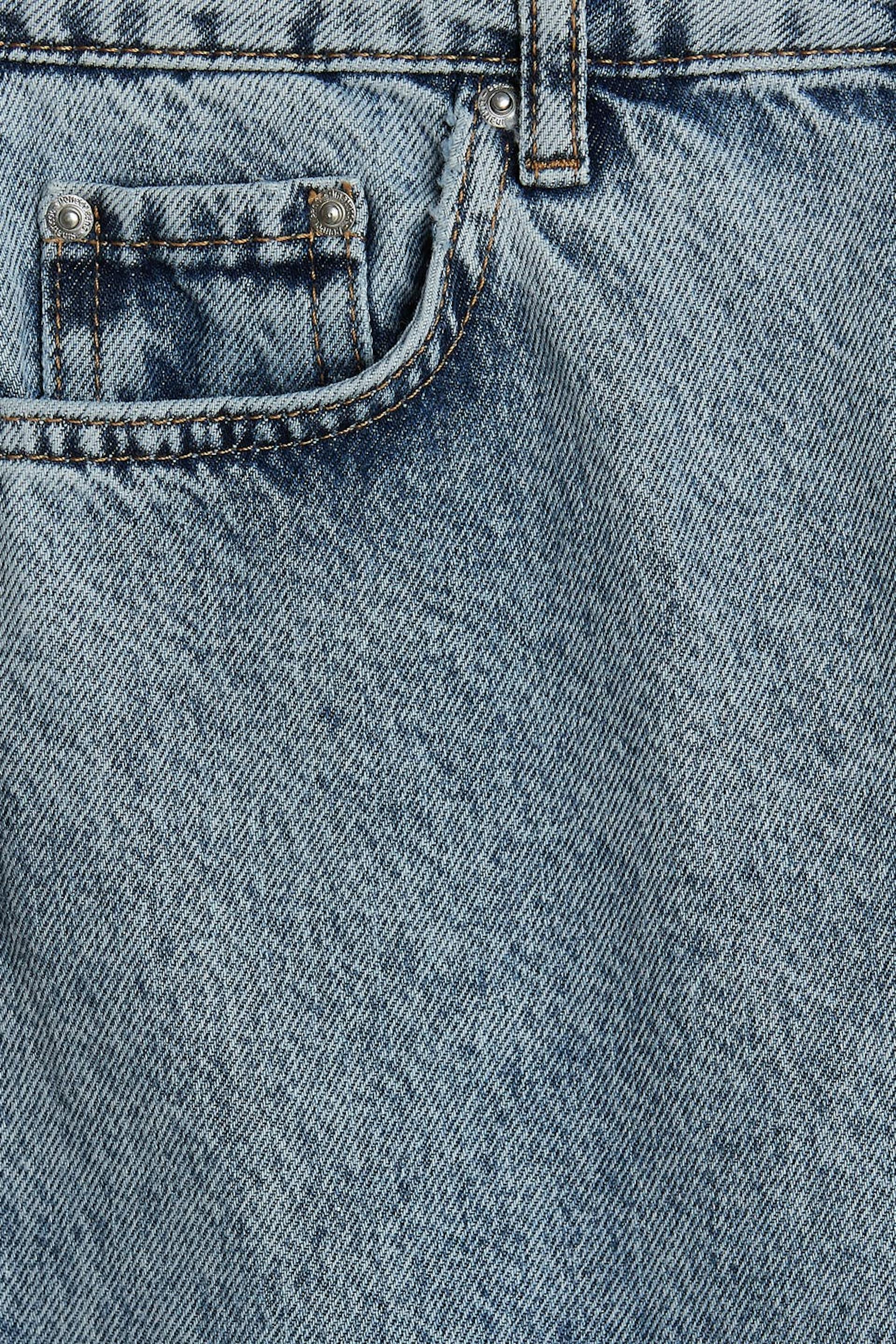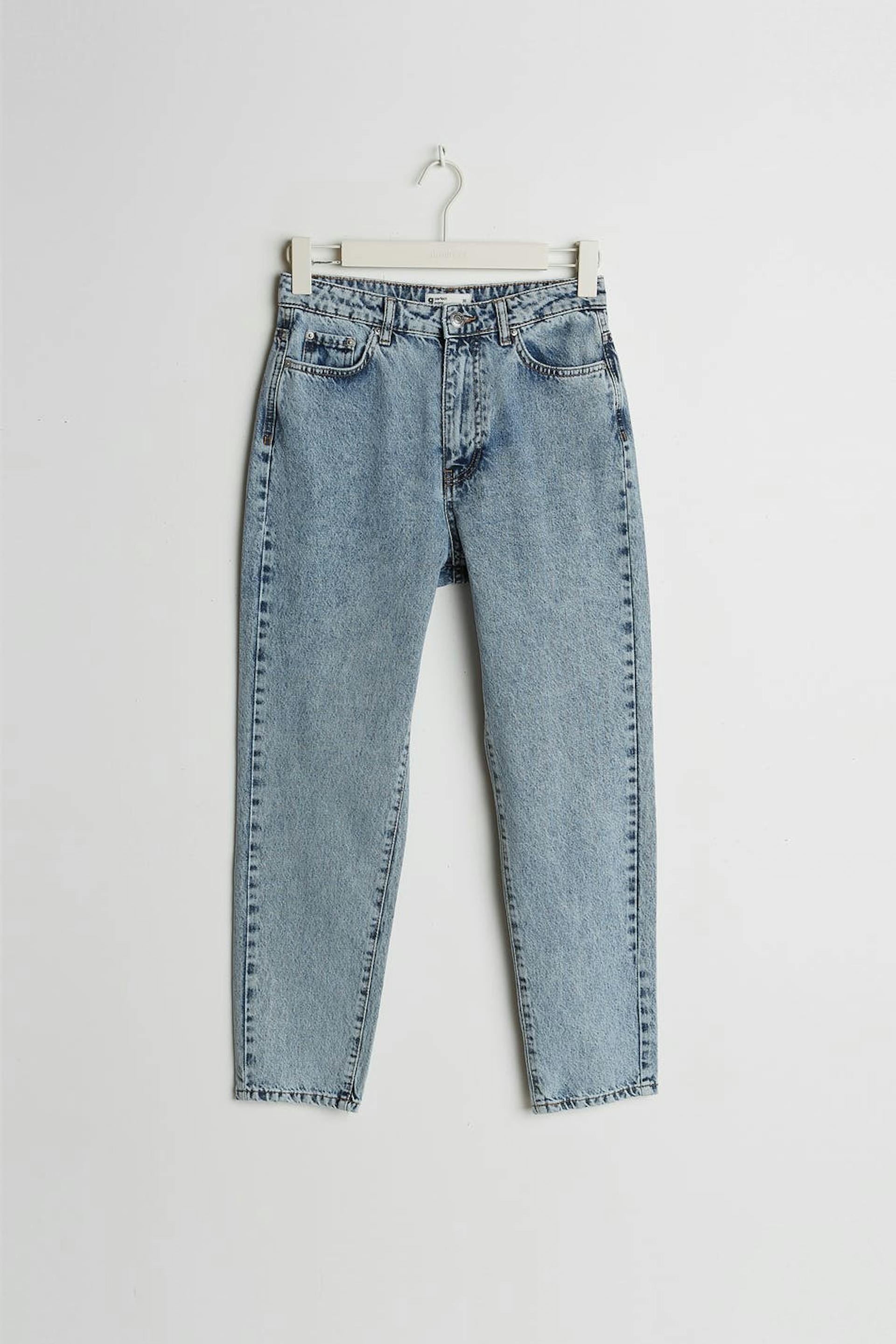 Zierliche Mom-Jeans mit einer normaler Passform. Die Jeans ist blau, zierlich und inflexibel. Sie hat einen hohen Bund und konische Beine. Ideal bei einer Körpergröße bis 1,60 m. Ideal bei einer Körpergröße bis 1,60 m.