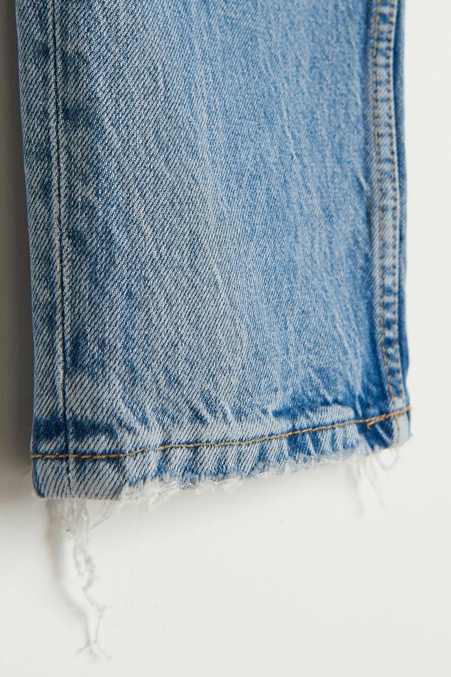 Nicki Studios X Gina Tricot. Jeans mit hohem Bund. Die Jeans ist blau und hat schmale, gerade Beine. Sie ist hergestellt aus Stretch Denim und hat verzweifelte Details am Beinende und Taschen vorne und hinten.