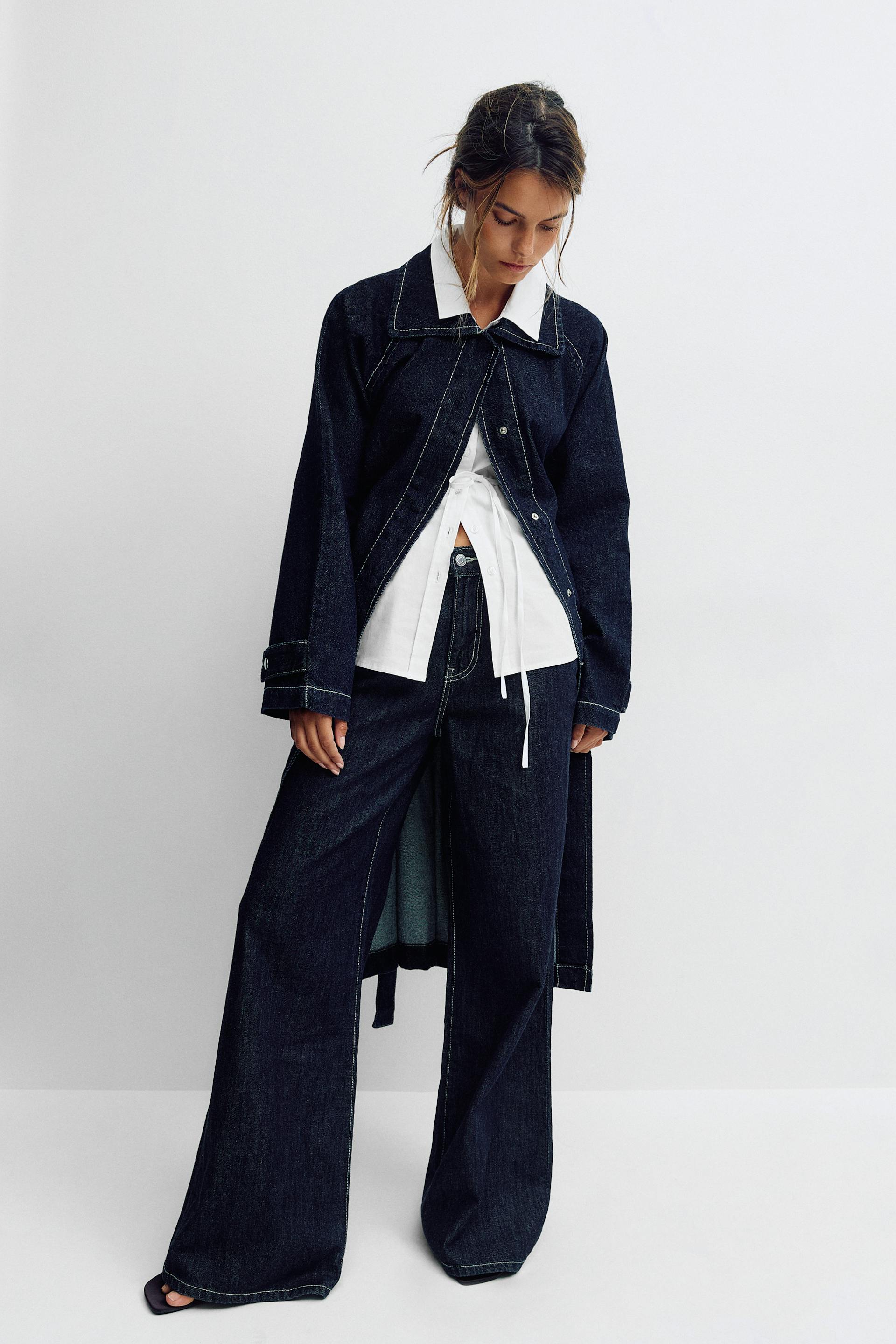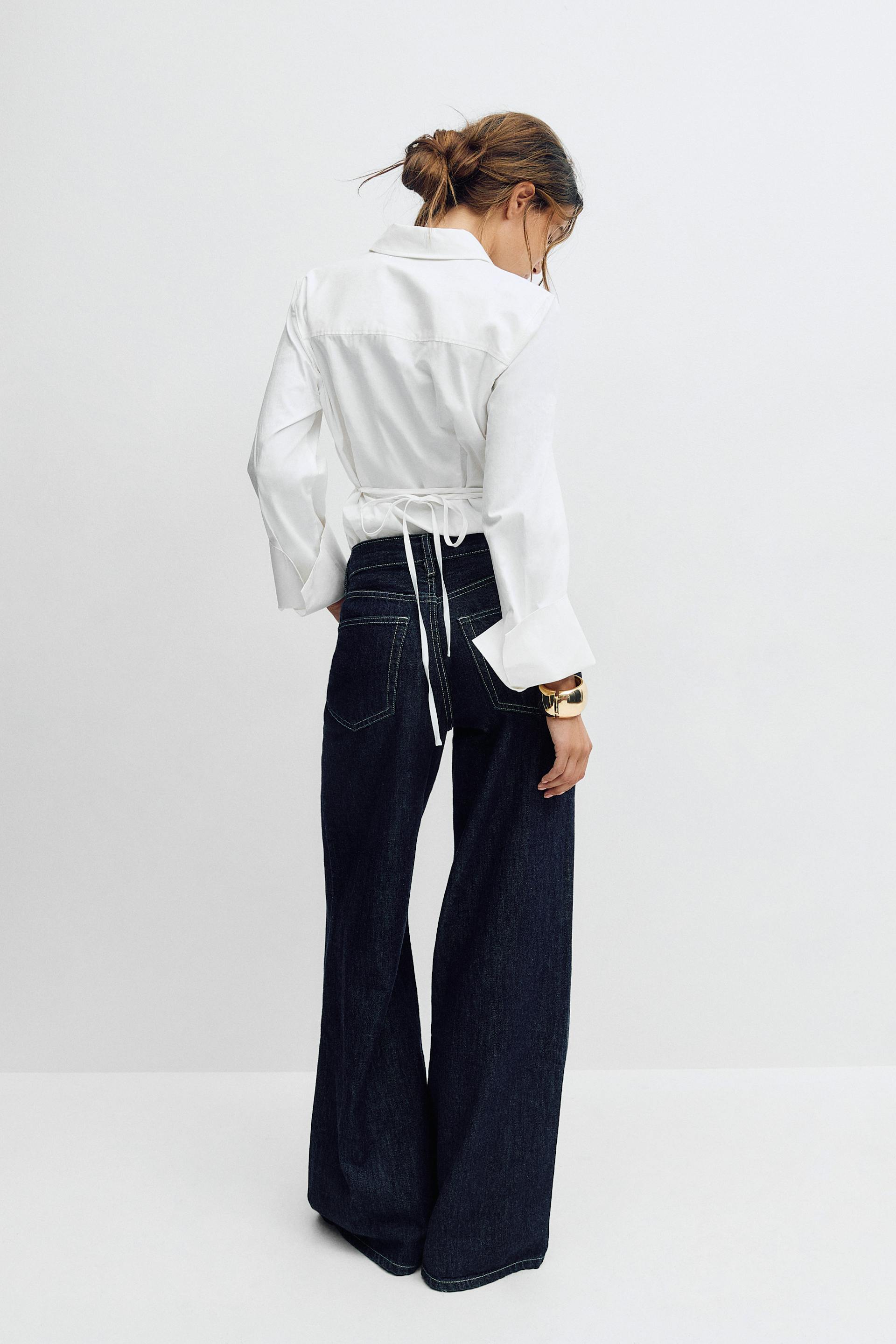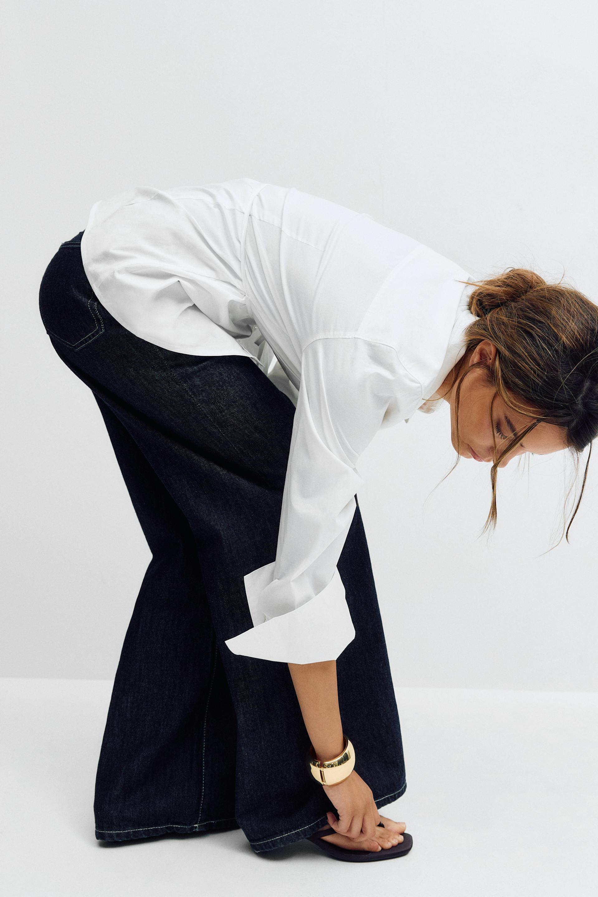 Weißes, langärmeliges Hemd mit Knopfleiste zu einer hochgeschlossenen, indigoblauen Jeans mit weitem Bein und Kontrastnähten, dazu ein goldenes Armband mit Manschette.