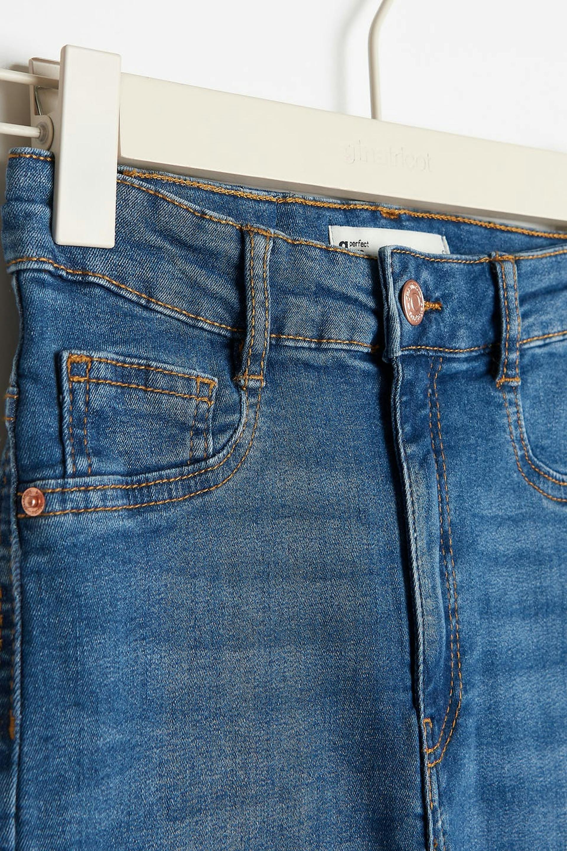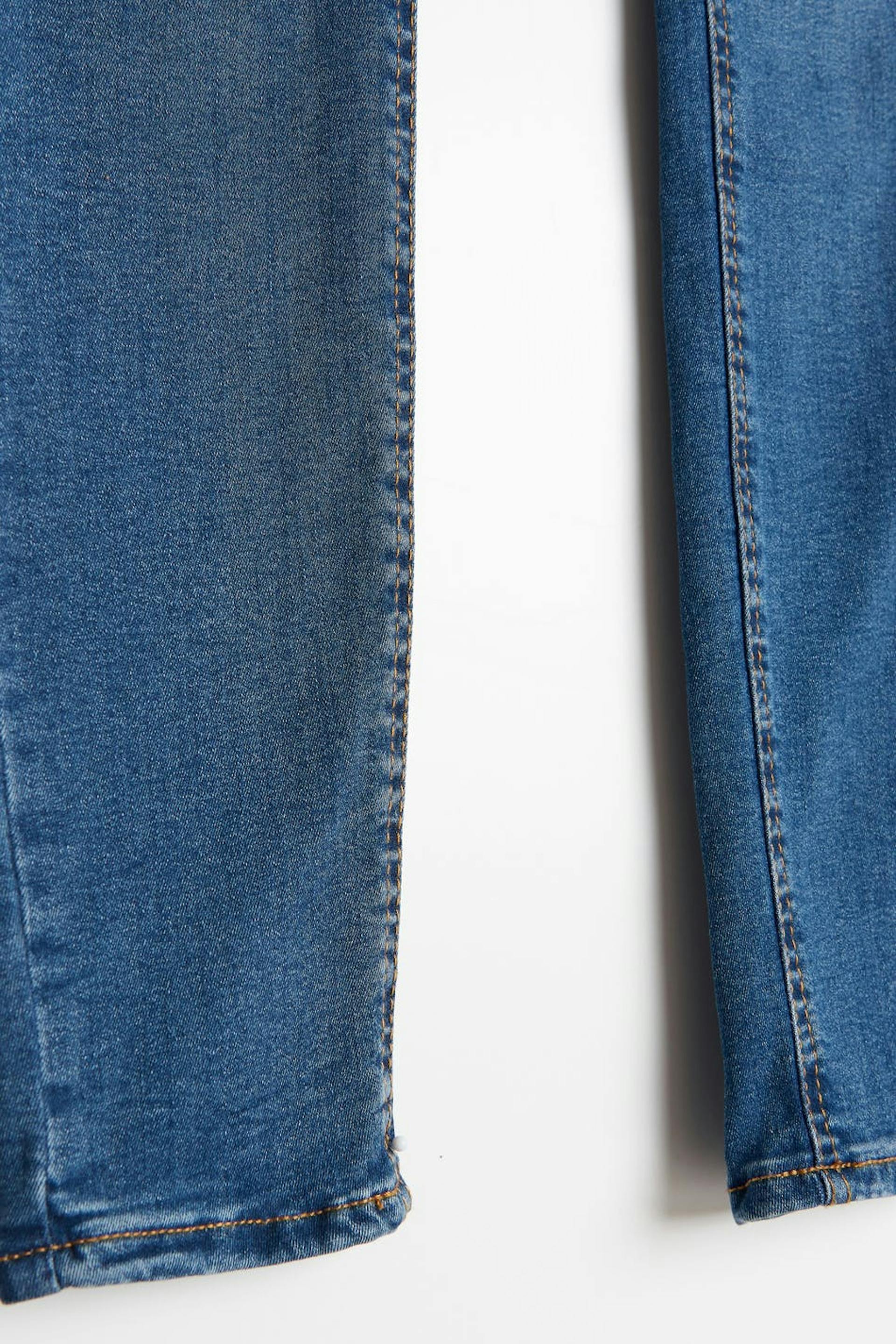 Superstretch Jeans mit hohem Bund. Die Jeans ist blau und hat eine taillierte, bequeme Passform mit schmalen Hosenbeinen. Sie hat Reißverschluss, falsche Taschen vorne und echte Gesäßtaschen. Benutze unsere Größentabelle, um deine Größe zu finden.