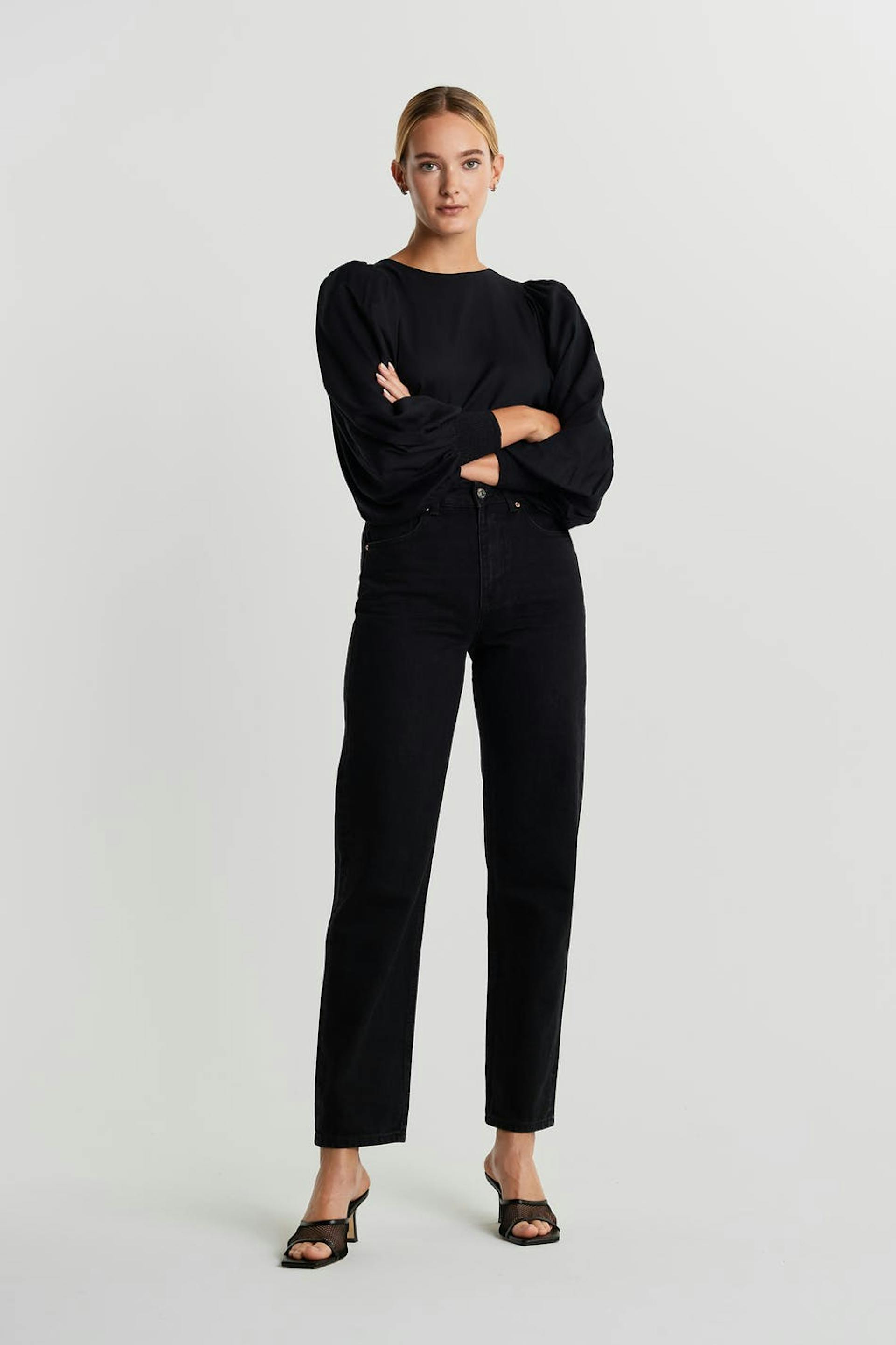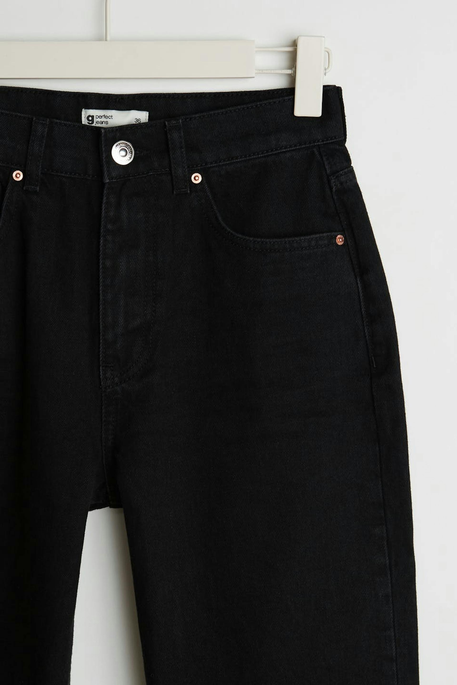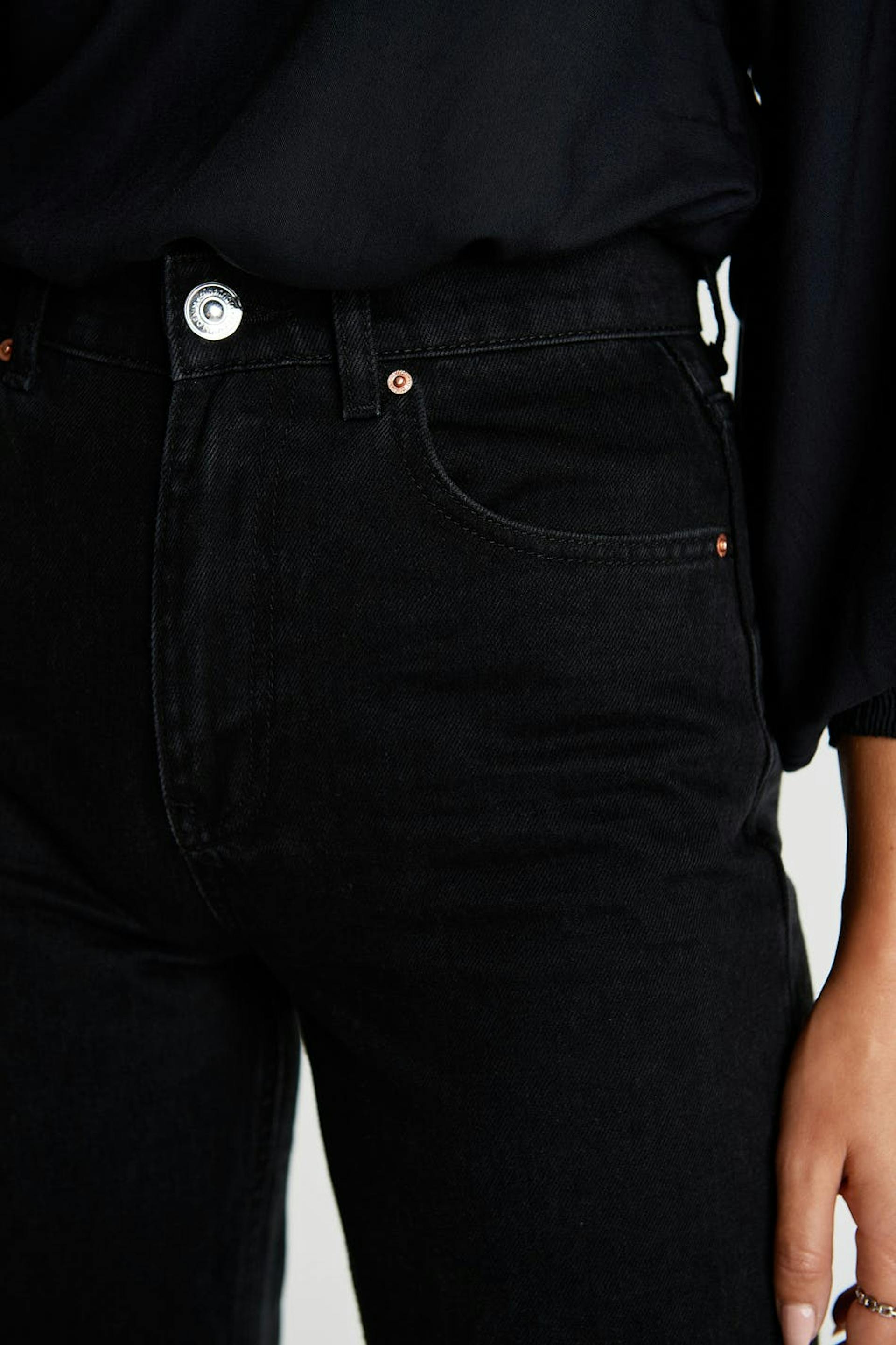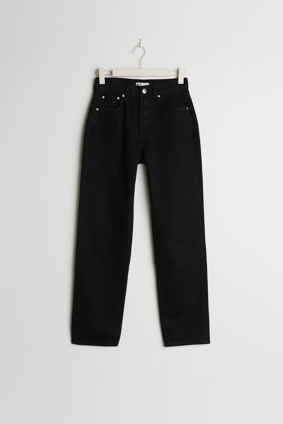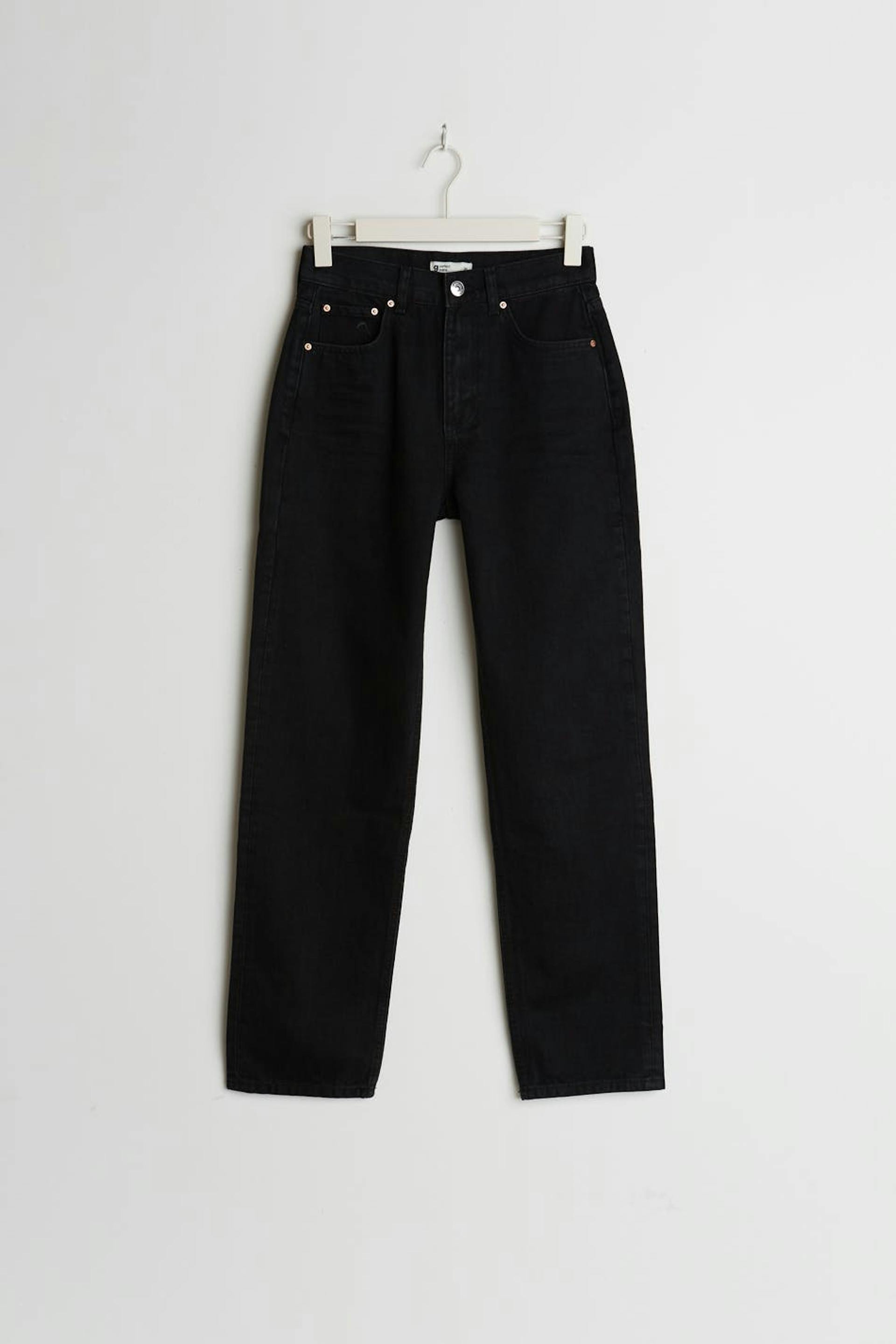 Nicht dehnbare Hüftjeans mit einer 90er inspirierten, geraden Passform. Die Jeans ist schwarz und hat eine hohe Taille. Sie ist hergestellt aus Denim und hat Hosenbeine mit einer voller Länge.