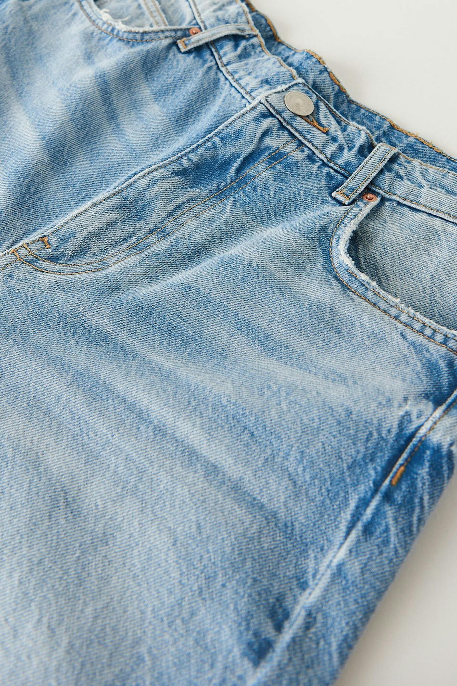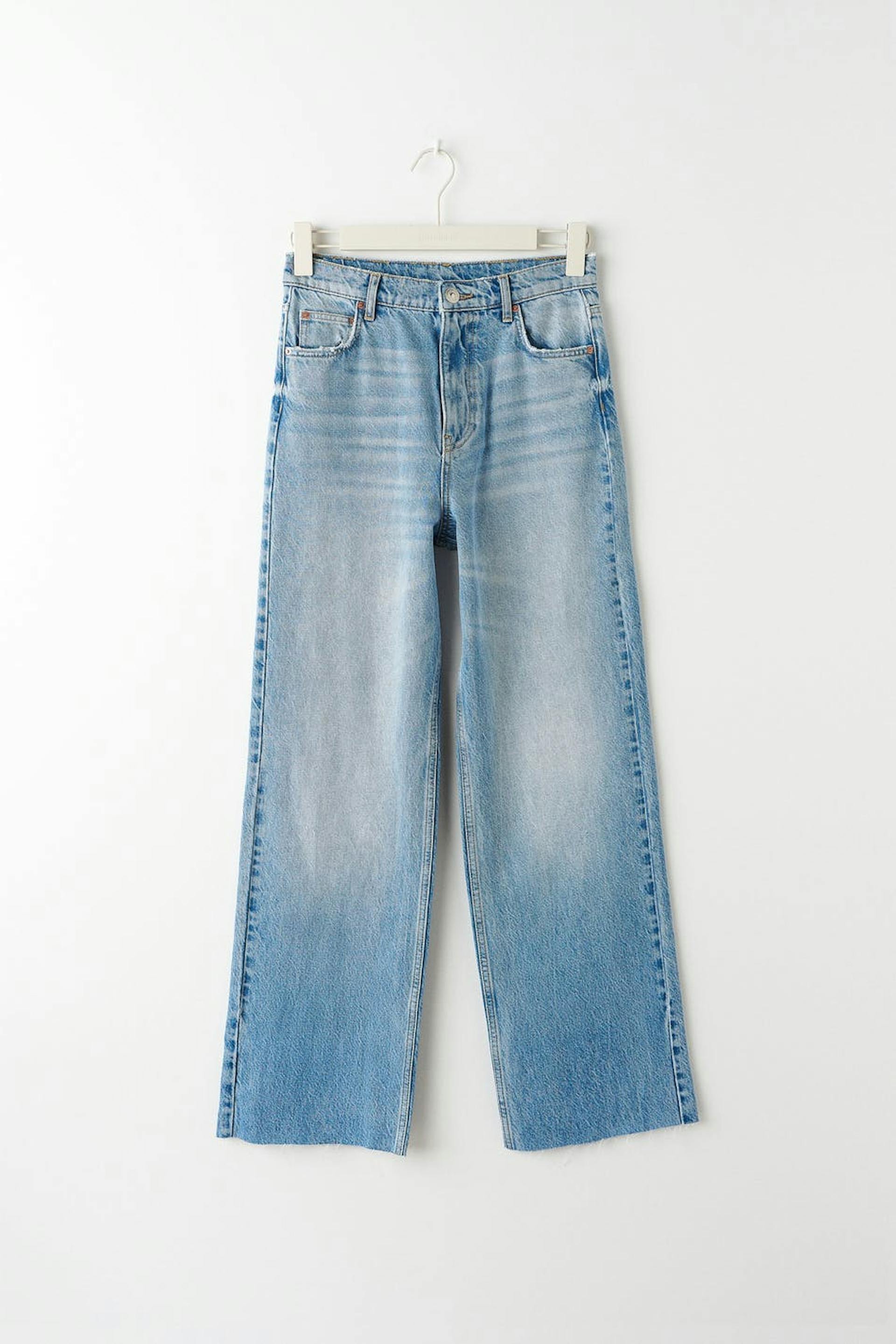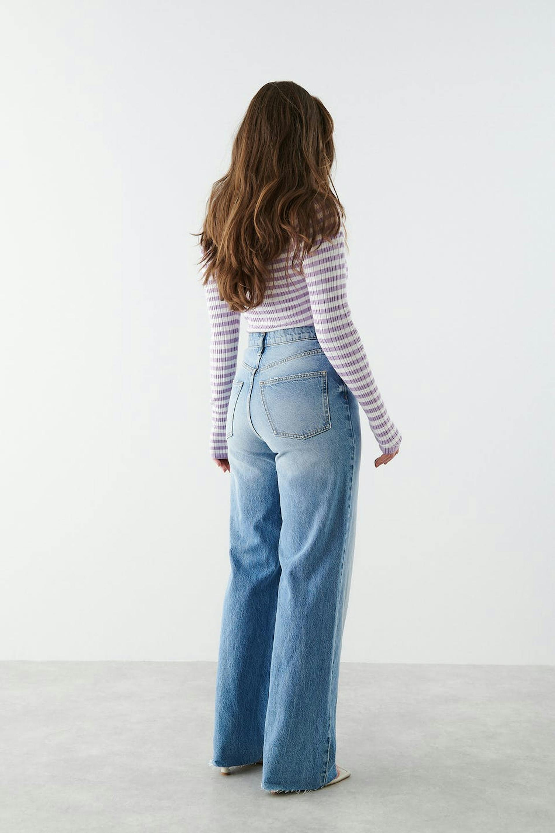 Zierliche Jeans mit hochgeschnittener Taille. Die Jeans ist blau und nicht dehnbar und hat gerade, breite Hosenbeine mit voller Länge. Sie hat Reißverschluss und rohe Kante am Beinende. Ideal bei einer Körpergröße bis 1,60 m. Benutze unsere Größentabelle, um deine Größe zu finden..