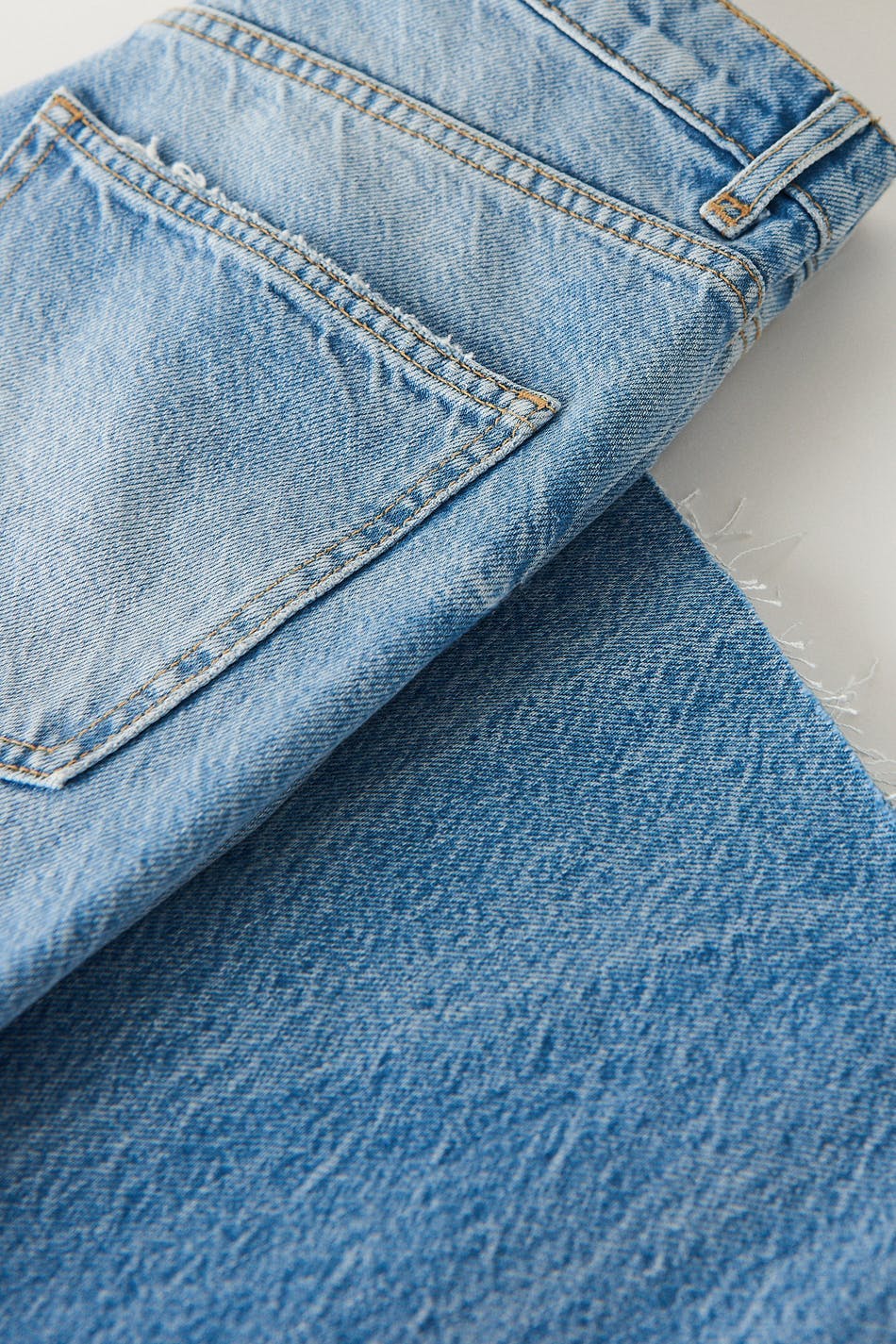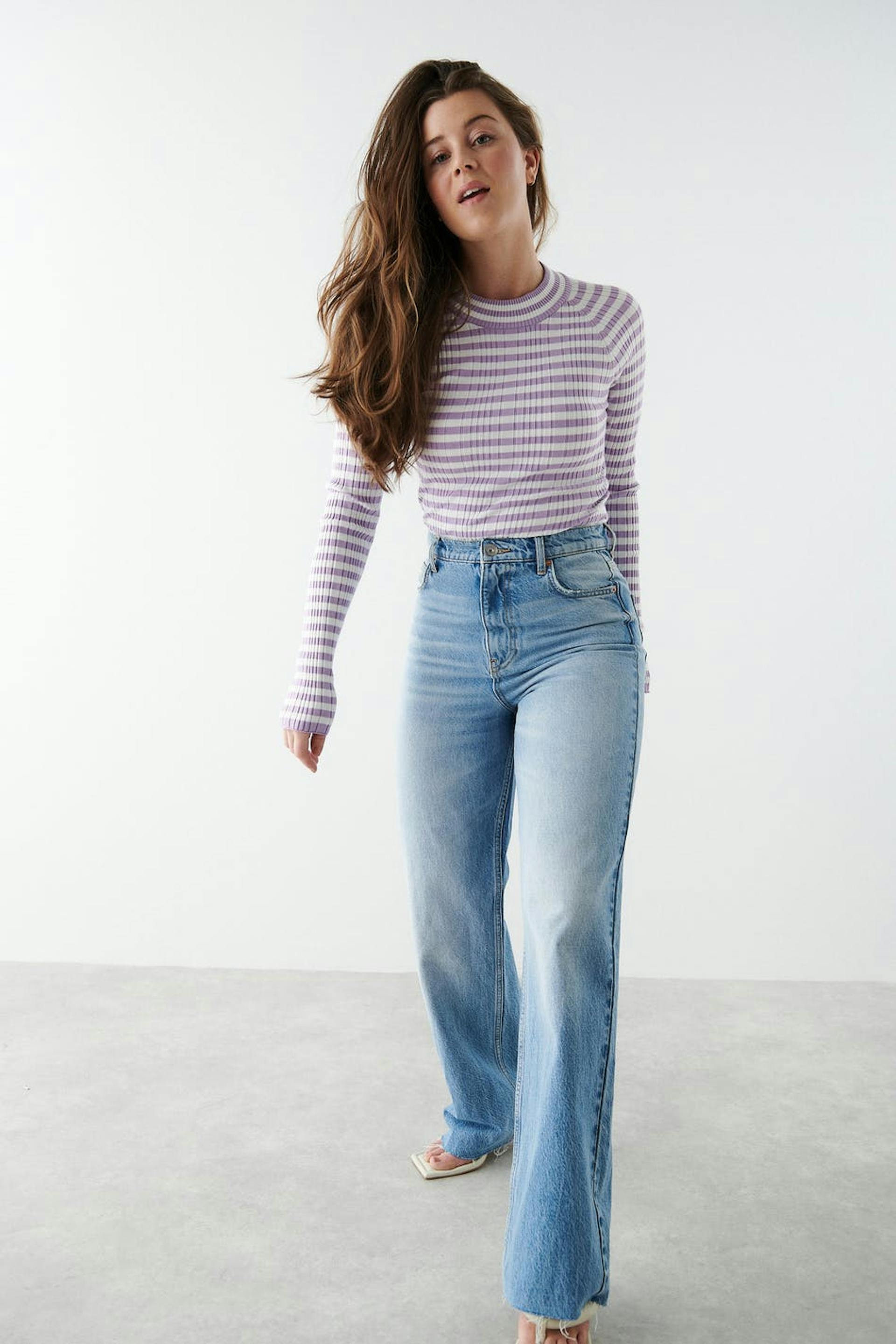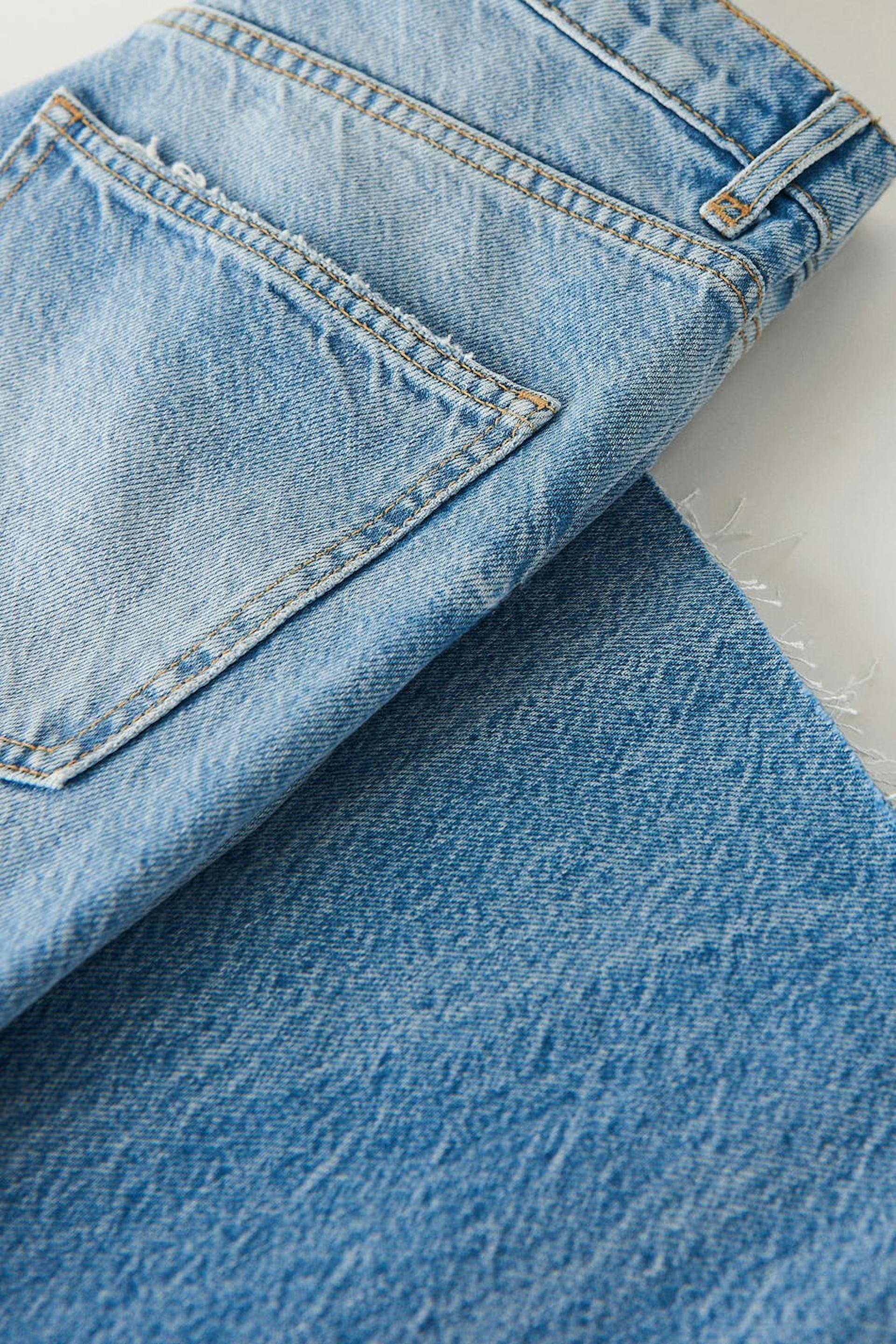 Zierliche Jeans mit hochgeschnittener Taille. Die Jeans ist blau und nicht dehnbar und hat gerade, breite Hosenbeine mit voller Länge. Sie hat Reißverschluss und rohe Kante am Beinende. Ideal bei einer Körpergröße bis 1,60 m. Benutze unsere Größentabelle, um deine Größe zu finden..