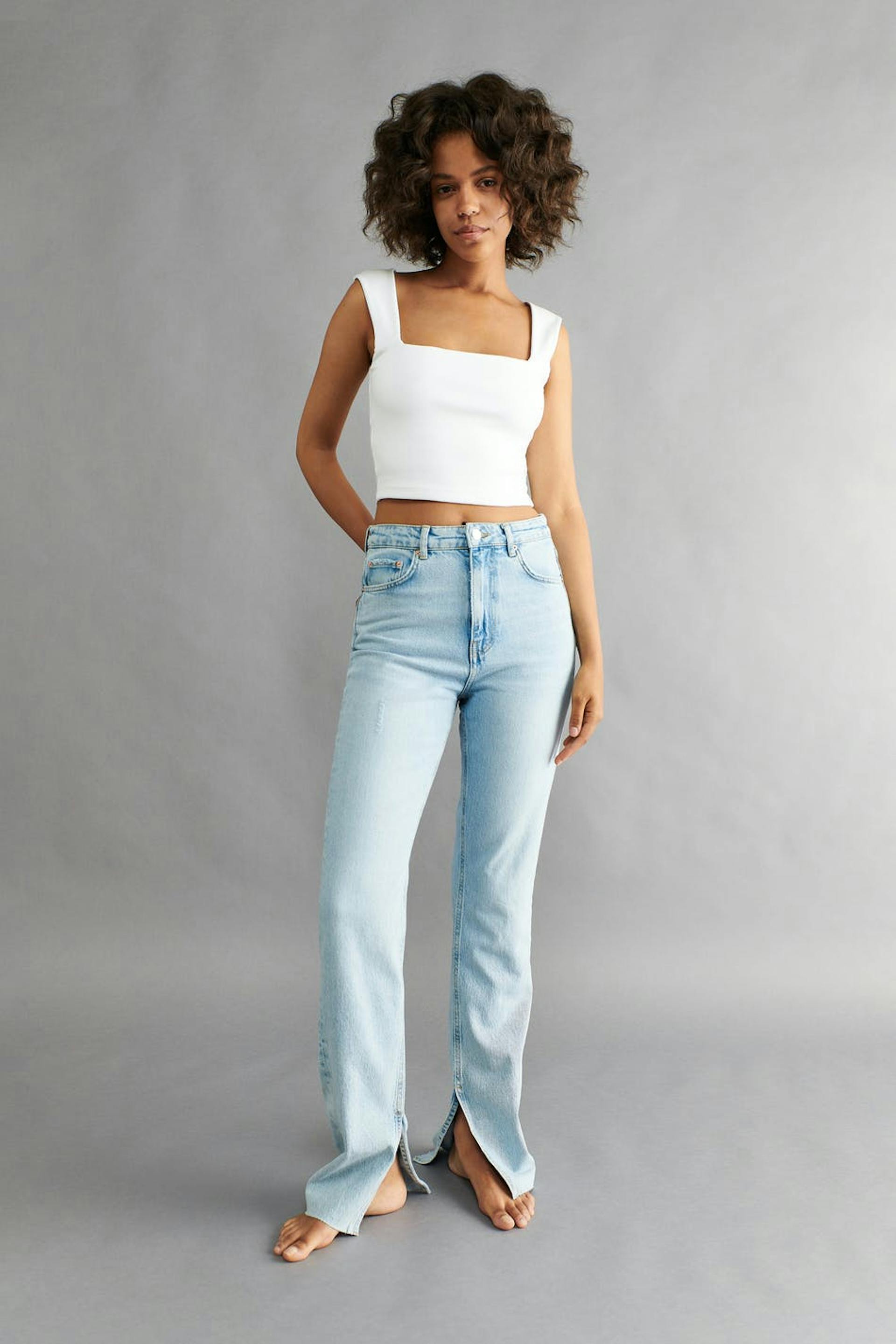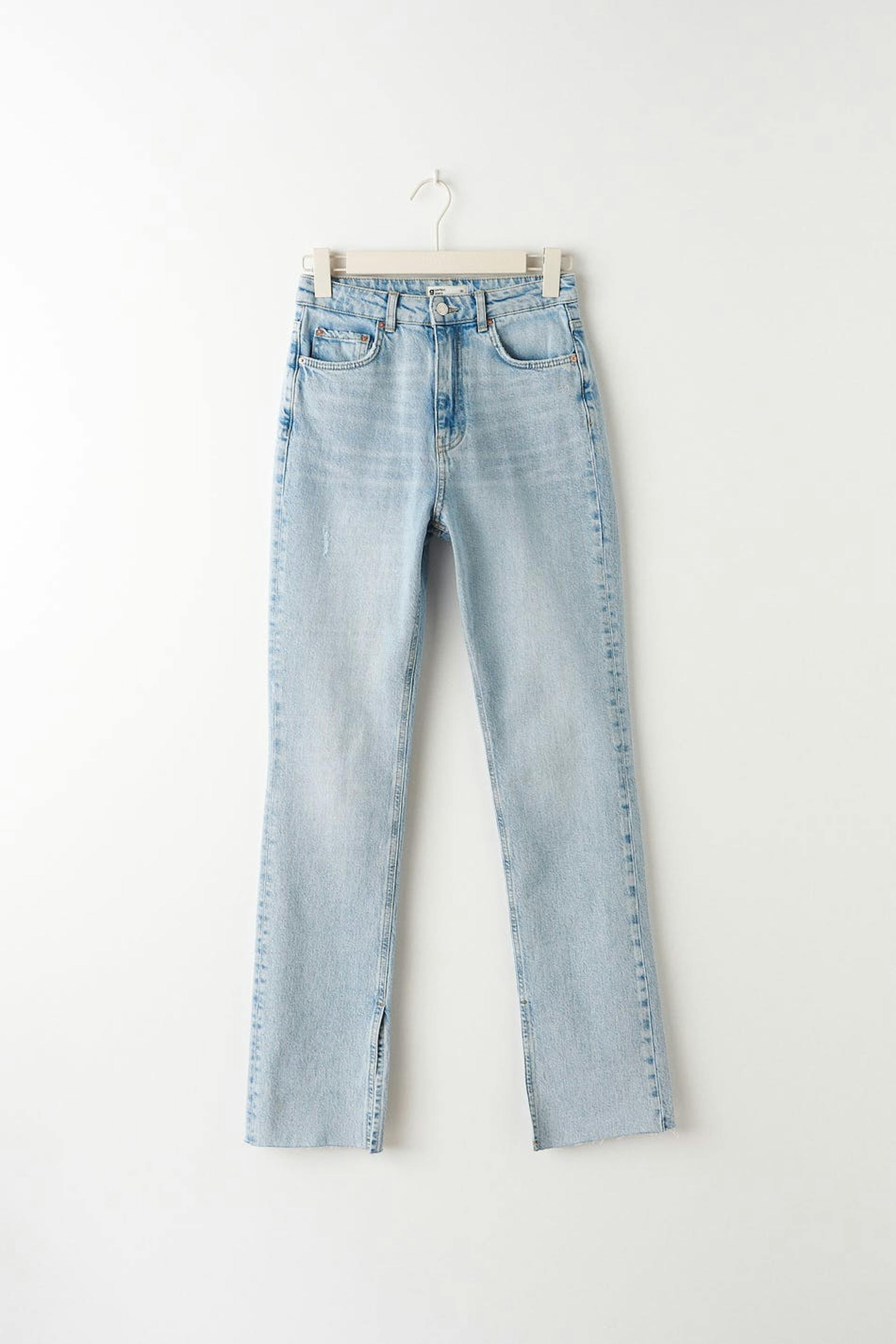 Slim-Fit Jeans mit hohem Bund aus low stretch denim. Die Jeans ist hellblau und hat gerade Beine mit voller Länge. Sie hat Schlitz am Beinende, rohe Kante unten, Hosenschlitz mit Reißverschluss und Taschen vorne und hinten. Benutze unsere Größentabelle, um deine Größe zu finden.