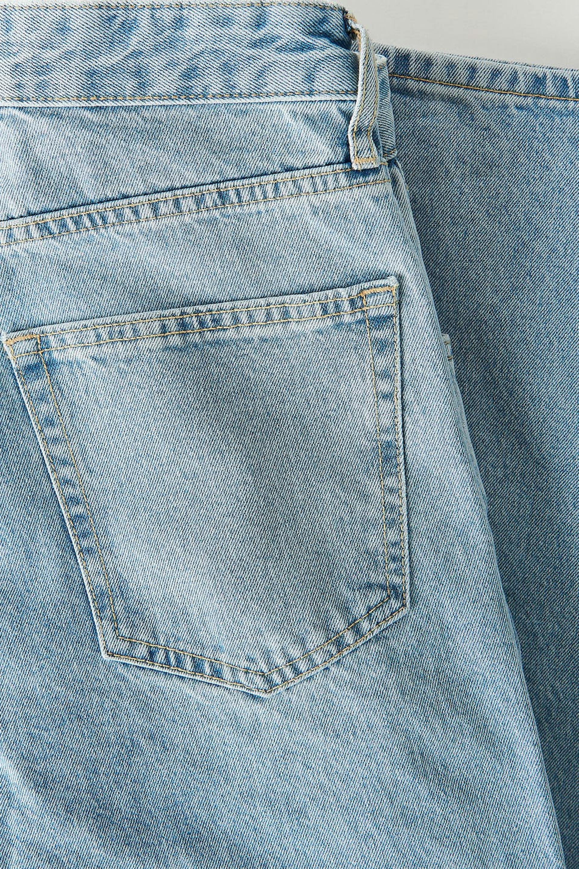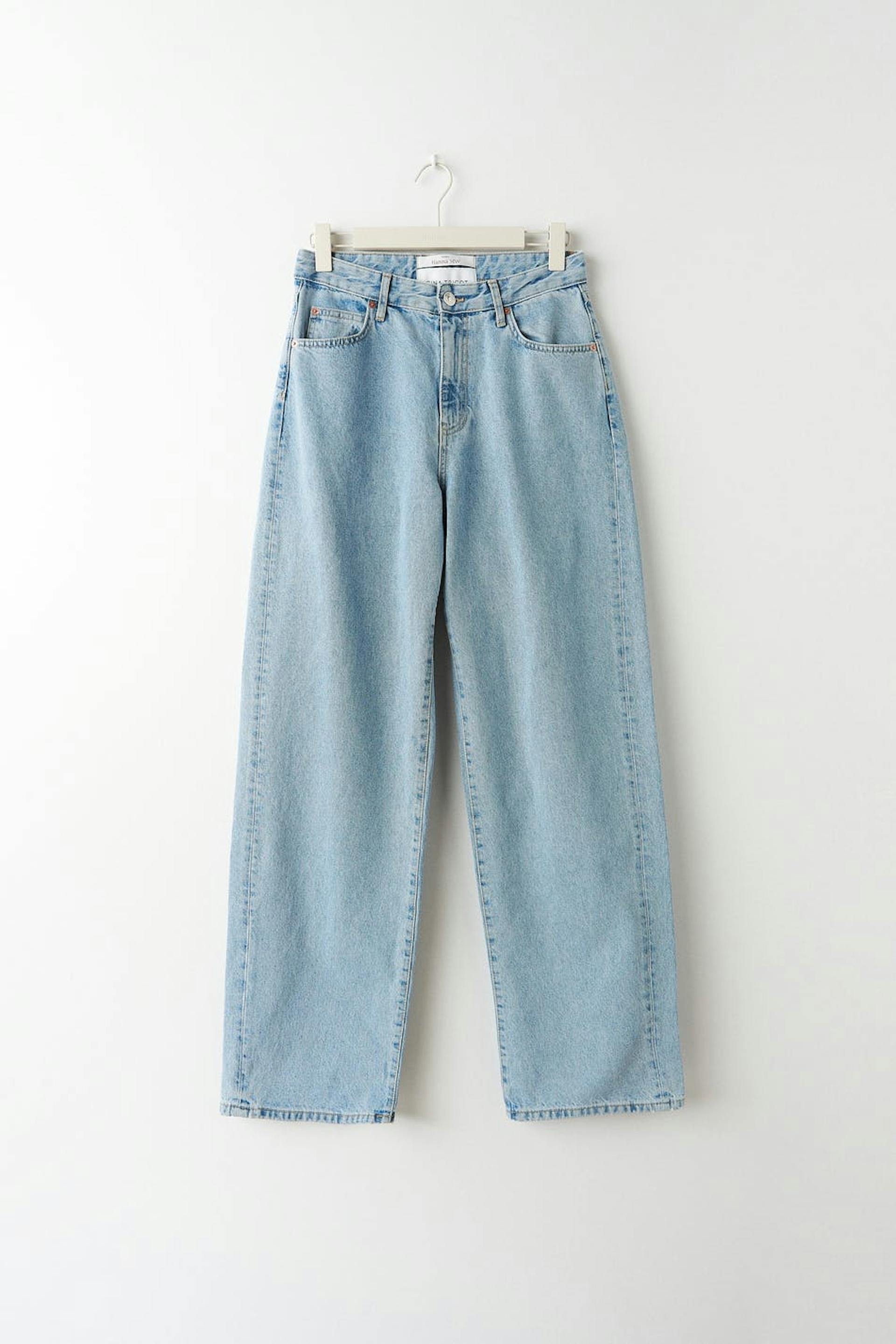Hanna MW X Gina Tricot. Lässige Jeans mit einer Oversize-Passform aus nicht dehnbarem Denim. Die Jeans ist blau und hat eine mittlere Taille. Sie hat einen Knopfverschluss, gerade geschnittenen mit voller Länge und Taschen vorne und hinten. Die Jeans werden aus übriggebliebenen Stoffresten und umgearbeiteten Jeans gefertigt.