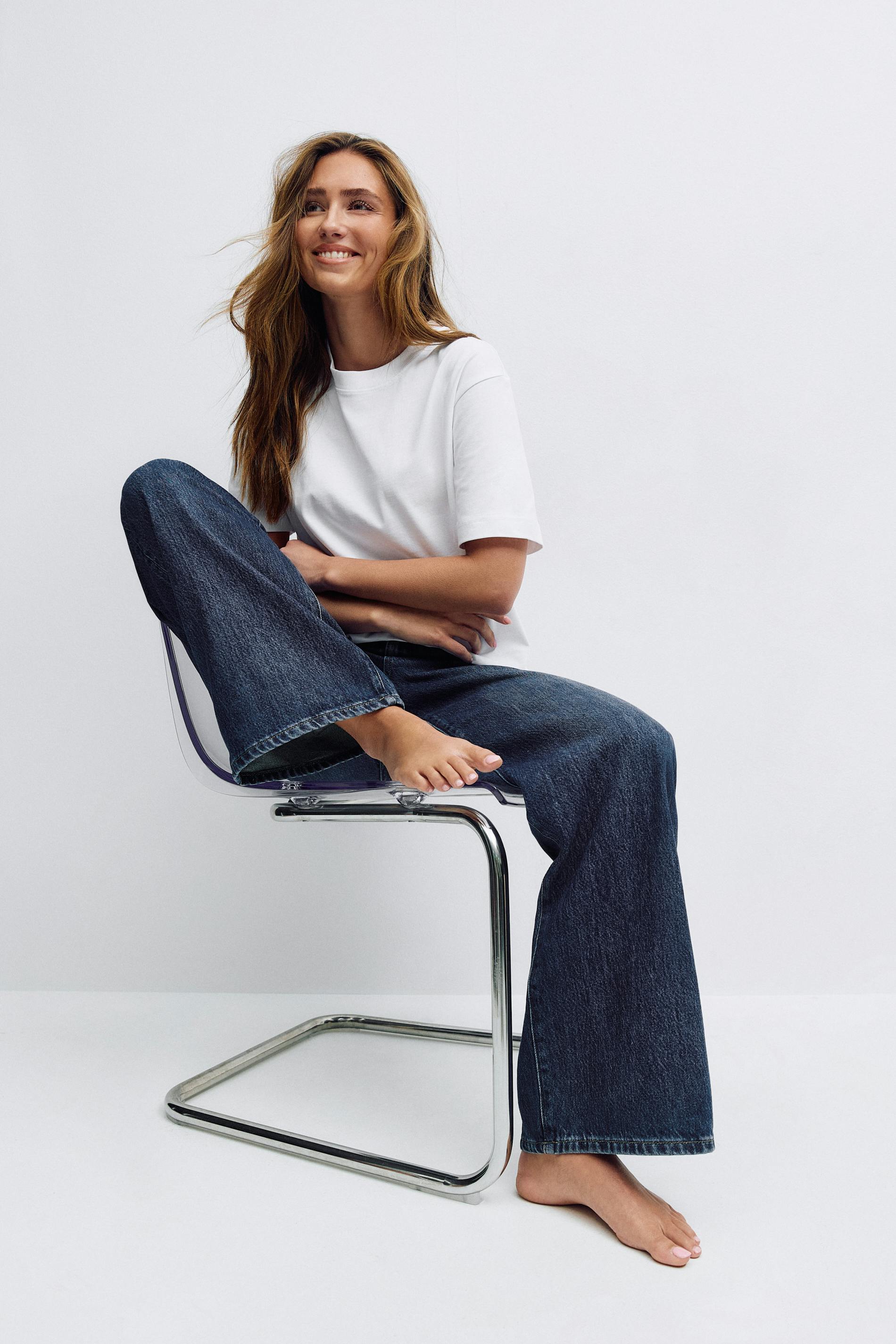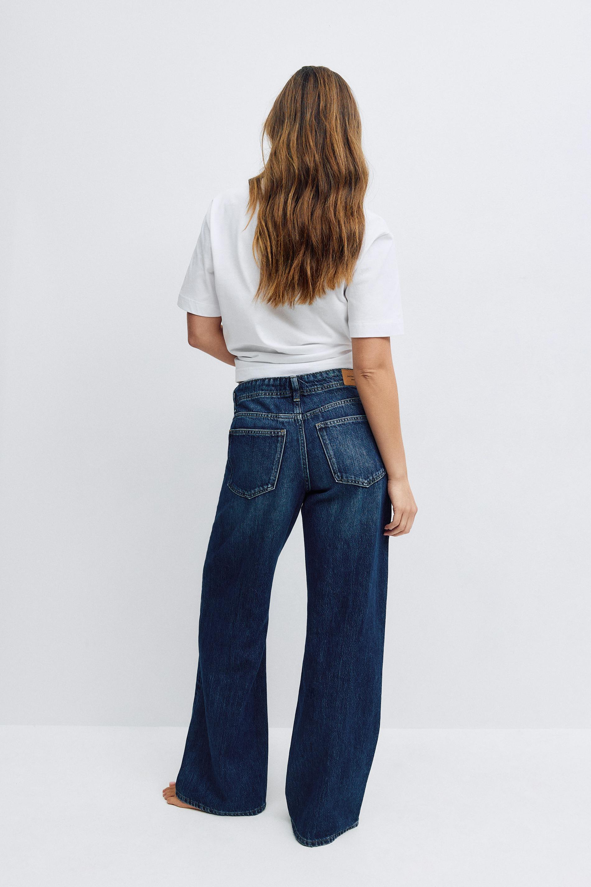 Weite Jeans mit tiefer Taille aus nicht dehnbarem Denim. Die Jeans ist dunkelblau und hat breite Beine mit voller Länge. Sie hat Reißverschluss und Taschen vorne und hinten. Benutze unsere Größentabelle, um deine Größe zu finden.